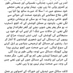 اس بھاگ دوڑ اور افراتفری کے ماحول میں، میری صحت بری طرح متاثر ہو رہی تھی لیکن مجھے اس بات کا احساس نہیں ہو سکا کہ میرے ذہن میں موجود ہر وقت کی ٹینشن، سٹریس اور کشمکش کی وجہ سے مَیں اندر ہی اندر ذہنی، جذباتی، نفسیاتی اور جسمانی طور پر کمزور پڑتی جا رہی ہوں۔ بیمار ہونے پر بھی مجھے خود سمجھ میں نہ آ سکا کہ میرے ساتھ ہوا کیا ہے۔ کافی علاج معالجے کے باوجود صحت کے حوالے سے کچھ خاص بہتری پیدا نہ ہو سکی تو پریشانی بڑھنے لگی تھی۔ باوجود ہر ممکن کوشش کے کہ کچھ ڈسٹرب نہ ہو مگر پھر بھی شوہر، بچے اور گھر نظرانداز ہونے لگے تھے۔ ان حالات سے تنگ آ کر اپنے آپ کو خود ہی سنبھالنے کی کوشش کی۔ اپنی ذہنی تربیت، مزاج اور رویوں کی درستگی کے لیۓ شعوری کوششوں کا آغاز کر دیا۔ رشتوں اور مسائل کو ترجیحی بنیادوں پر ڈیل کرنے کی سوچ اپنائی۔ اس سے صحت میں کچھ بہتری پیدا ہوئی کیونکہ مسائل سے توجہ وقتی طور پر ہٹ گئی تھی اور نتیجتاً ٹینشن بھی کم ہو گئی تھی۔ مگر معدہ کی خرابی اور ہاضمہ کے مسائل جوں کے توں تھے جس کی وجہ سے صحت بہتر نہیں ہو پا رہی تھی۔