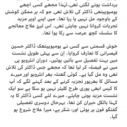 ایلوپیتھک ادویات کے استعمال سے تکلیف نا قابلِ برداشت ہونے لگتی تھی۔لہٰذا مجھے کسی اچھے ہومیوپیتھی ڈاکٹر کی تلاش تھی جو کہ ہر ممکن کوشش کے باوجود مل نہیں پا رہا تھا۔ میں اپنے اوپر مزید تجربات کروانا نہیں چاہتی تھی۔ اس لیۓ علاج معالجے کا سلسلہ کچھ عرصہ سے رکا ہوا تھا۔