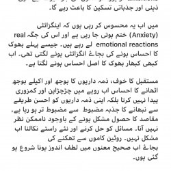 مستقبل کا خوف، ذمہ داریوں کا بوجھ اور اکیلے بوجھ اٹھانے کا احساس اب رویے میں چڑچڑاپن اور کمزوری پیدا نہیں کرتا بلکہ اپنی ذمہ داریوں کو احسن طریقے سے نبھانے کا جذبہ مضبوط سے مضبوط تر ہو رہا ہے۔ مقاصد کا حصول مشکل ہونے کے باوجود ناممکن نظر نہیں آتا۔ مسائل کو حل کرنے اور نئے راستے نکالنا اب مشکل نہیں۔ روٹین کاموں سے تھکنے کی بجاۓ اب صحیح معنوں میں لطف اندوز ہونا شروع ہو گئی ہوں۔