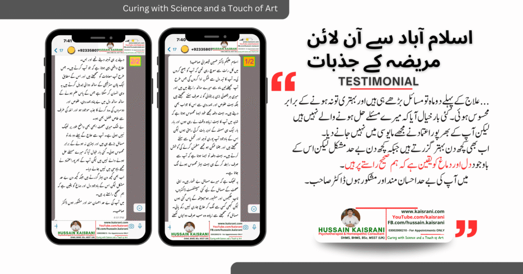 بے شک میری صحت ابھی بھی واضح طور پر ٹھیک نہیں ہوئی ہے۔ آپ سے علاج کے پہلے دو ماہ تو مسائل بڑھے ہی ہیں اور بہتری نہ ہونے کے برابر محسوس ہوئی۔ کئی بار خیال آیا کہ میرے مسئلے حل ہونے والے نہیں ہیں لیکن آپ کے بھرپوراعتماد نے مجھے مایوسی میں نہیں جانے دیا۔ اب بھی کچھ دن بہتر گزرتے ہیں جبکہ کچھ دن بے حد مشکل لیکن اس کے باوجود دل اور دماغ کو یقین ہے کہ ہم صحیح راستے پر ہیں۔