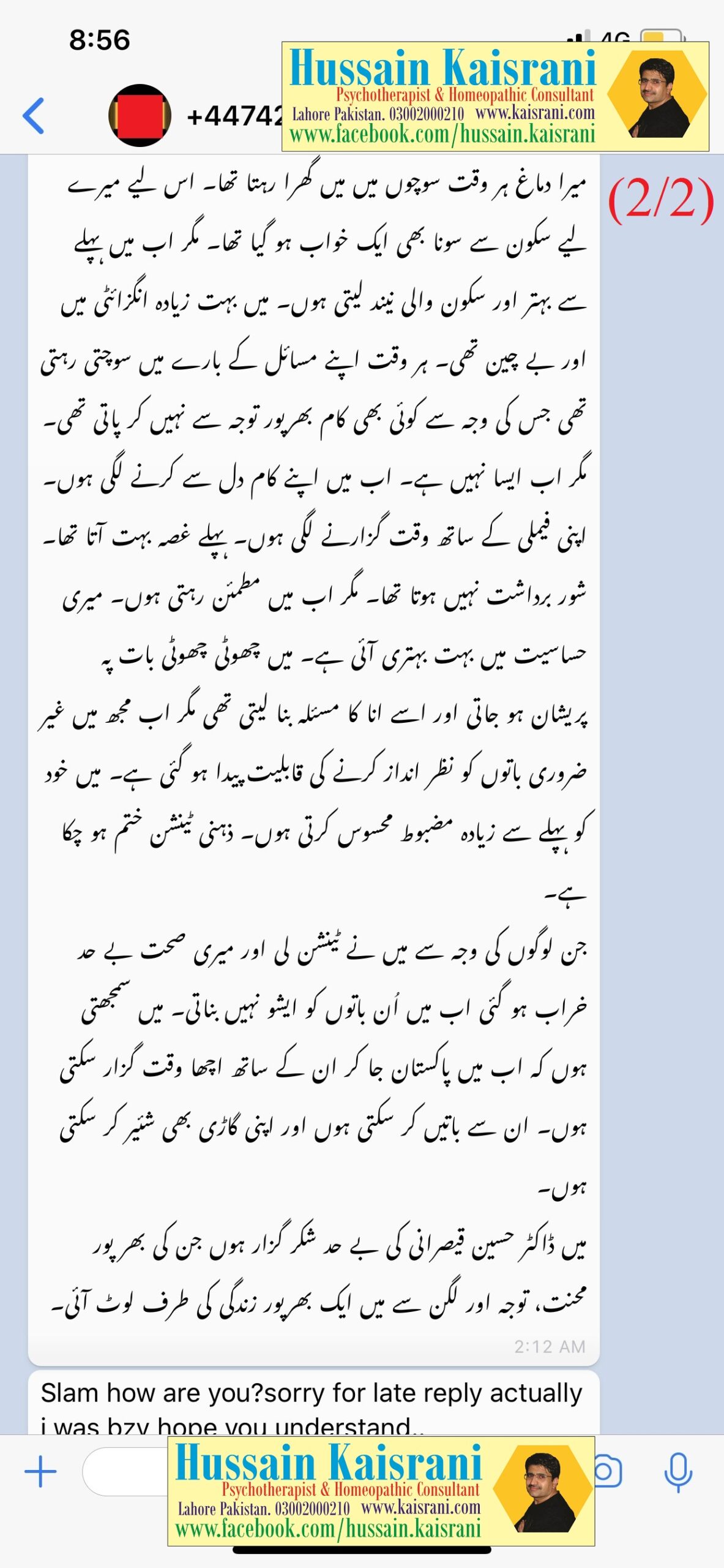 میں نے ایک فیملی فرینڈ کے کہنے پر ڈاکٹر حسین قیصرانی سے رابطہ کیا۔ میری طبیعت بہت خراب تھی۔ سانس کی تکلیف اتنی بڑھ چکی تھی کہ میرے لیے ڈاکٹر صاحب سے بات کرنا بھی مشکل تھا۔ لیکن حیرت انگیز بات یہ تھی کہ ڈاکٹر صاحب سے بات کرنے کے دوران مجھے اپنی طبیعت میں بہتری محسوس ہوئی۔ مجھے لگا کہ وہ میری بات کو میرے نقطہ نظر کے مطابق سمجھ رہے ہیں۔ بات کرنے کے دوران میری سانس پھول رہی تھی لیکن ڈاکٹر صاحب نے بیزاری کا کوئی تاثر نہیں دیا۔ انہوں نے میری بات نہایت توجہ اور شفقت سے سنی۔ میں نے اپنی کیفیات کو تفصیل سے بیان کیا۔ اور اس طرح میرا علاج شروع ہوا۔