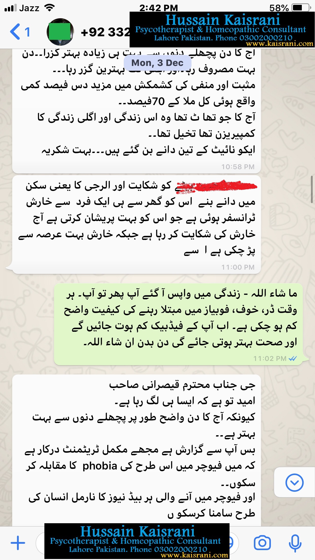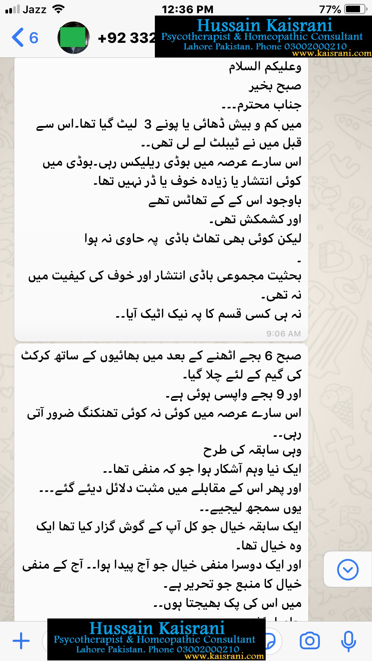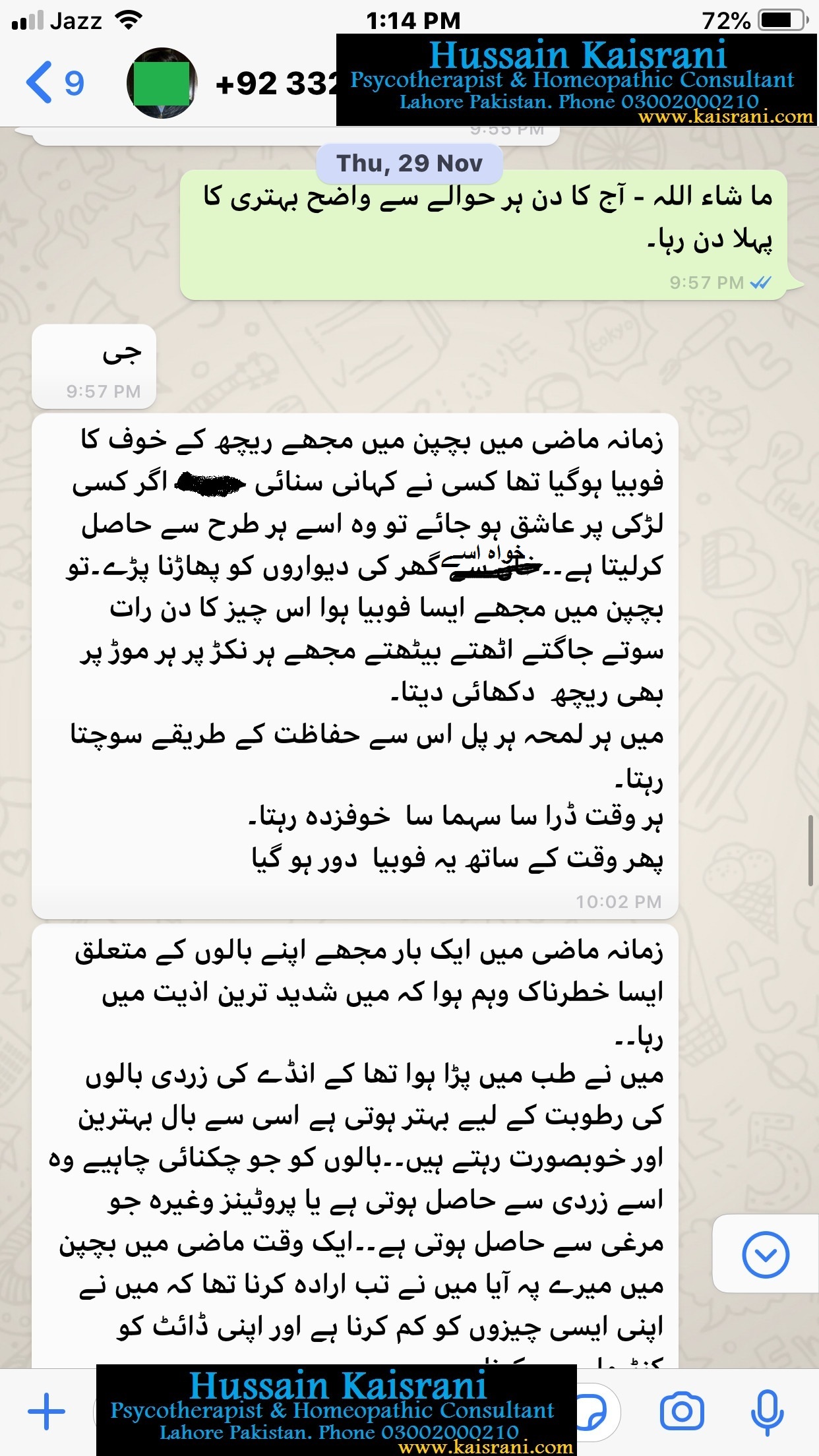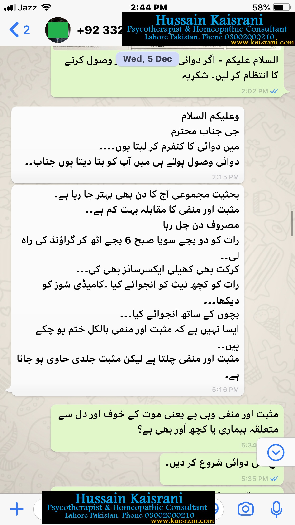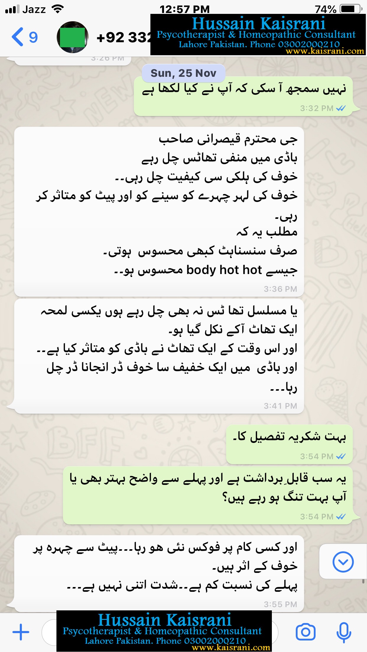 [19/12/2018, 12:04:33 AM] Hussain Kaisrani: بہت نوازش اور شکریہ اپنے کیس اور کامیاب علاج کی تفصیلات شئر کرنے کا۔ ایک ماہ سے کم عرصہ میں آپ ڈر خوف اور فوبیا کی کربناک کیفیت سے نکل کر ہمت، حوصلہ اور سکون بھری زندگی سے لطف اندوز ہونے لگے۔ یہ سب اللہ کریم کی ہم دونوں پر مہربانی سے ہوا یا آپ کے بھرپور تعاون اور ذمہ دارانہ رویہ کے طفیل ممکن ہوا۔