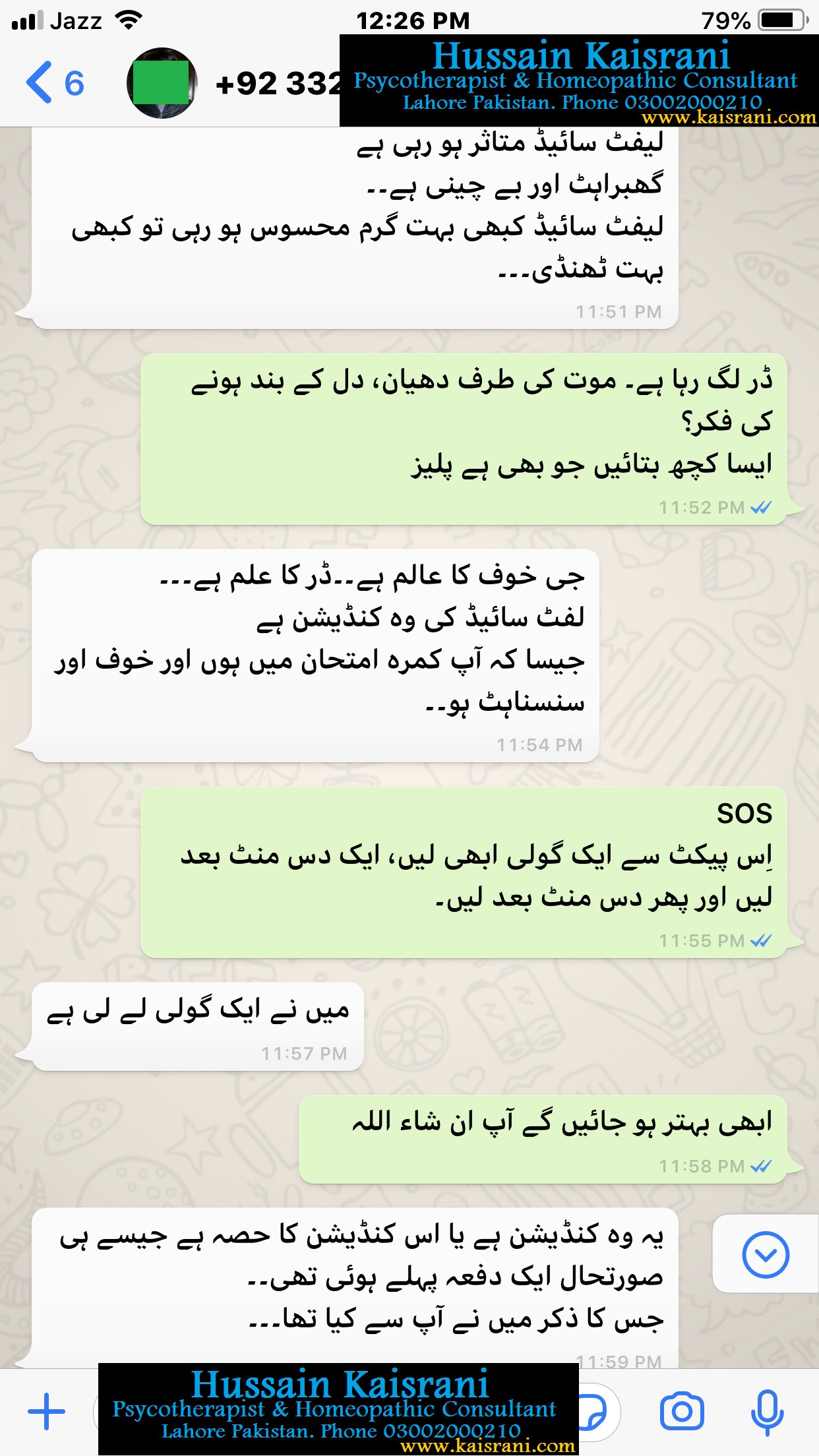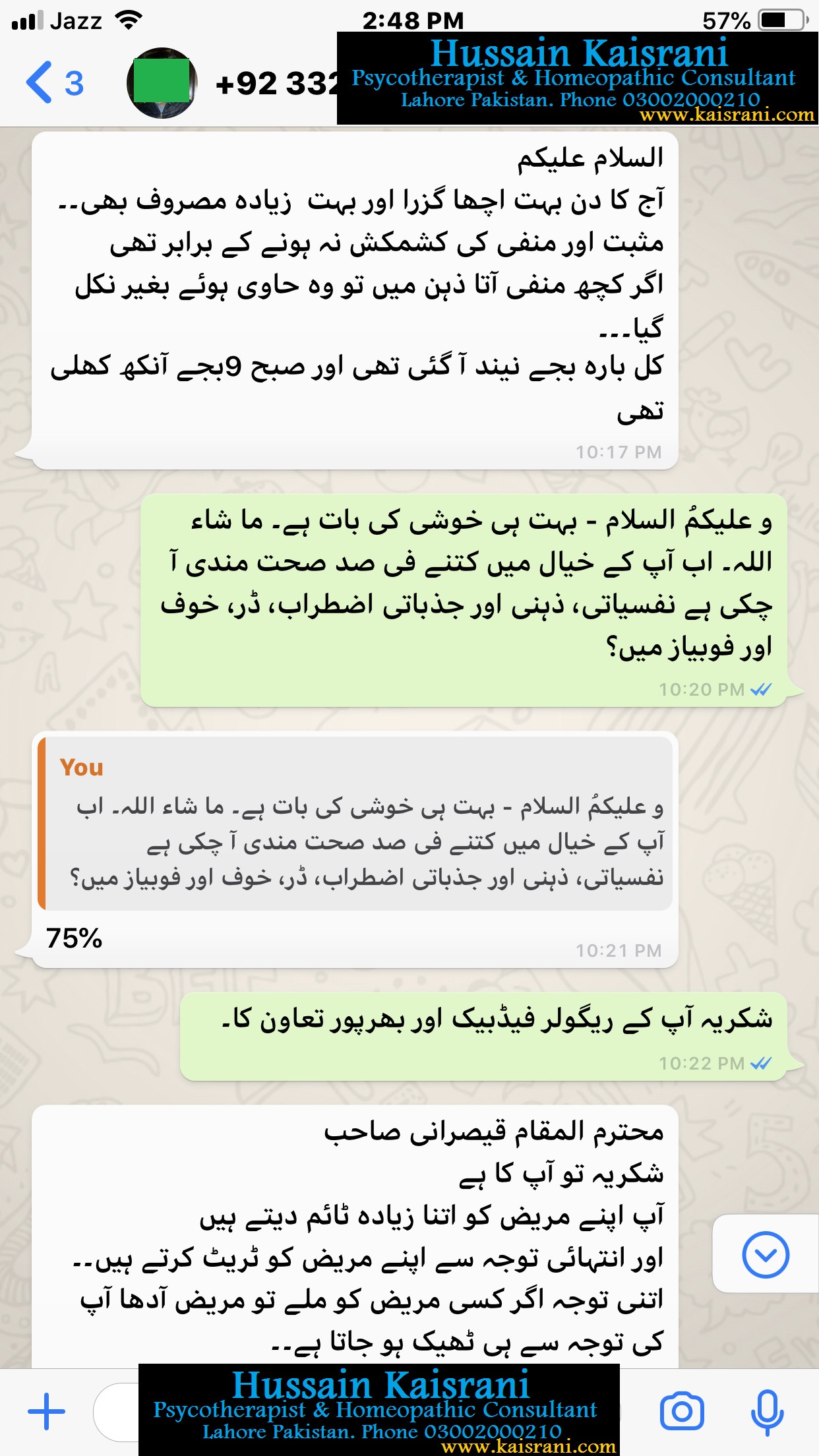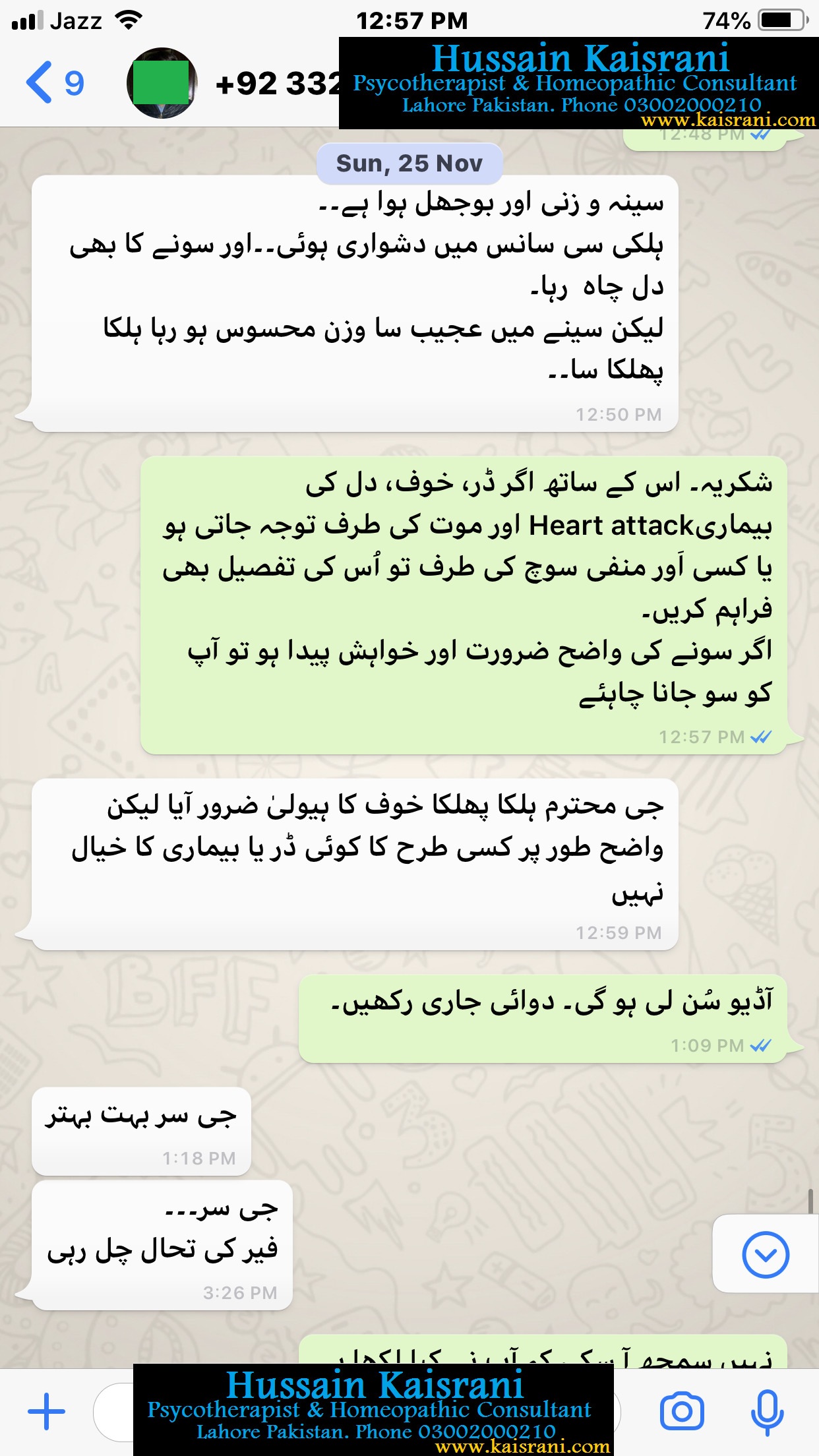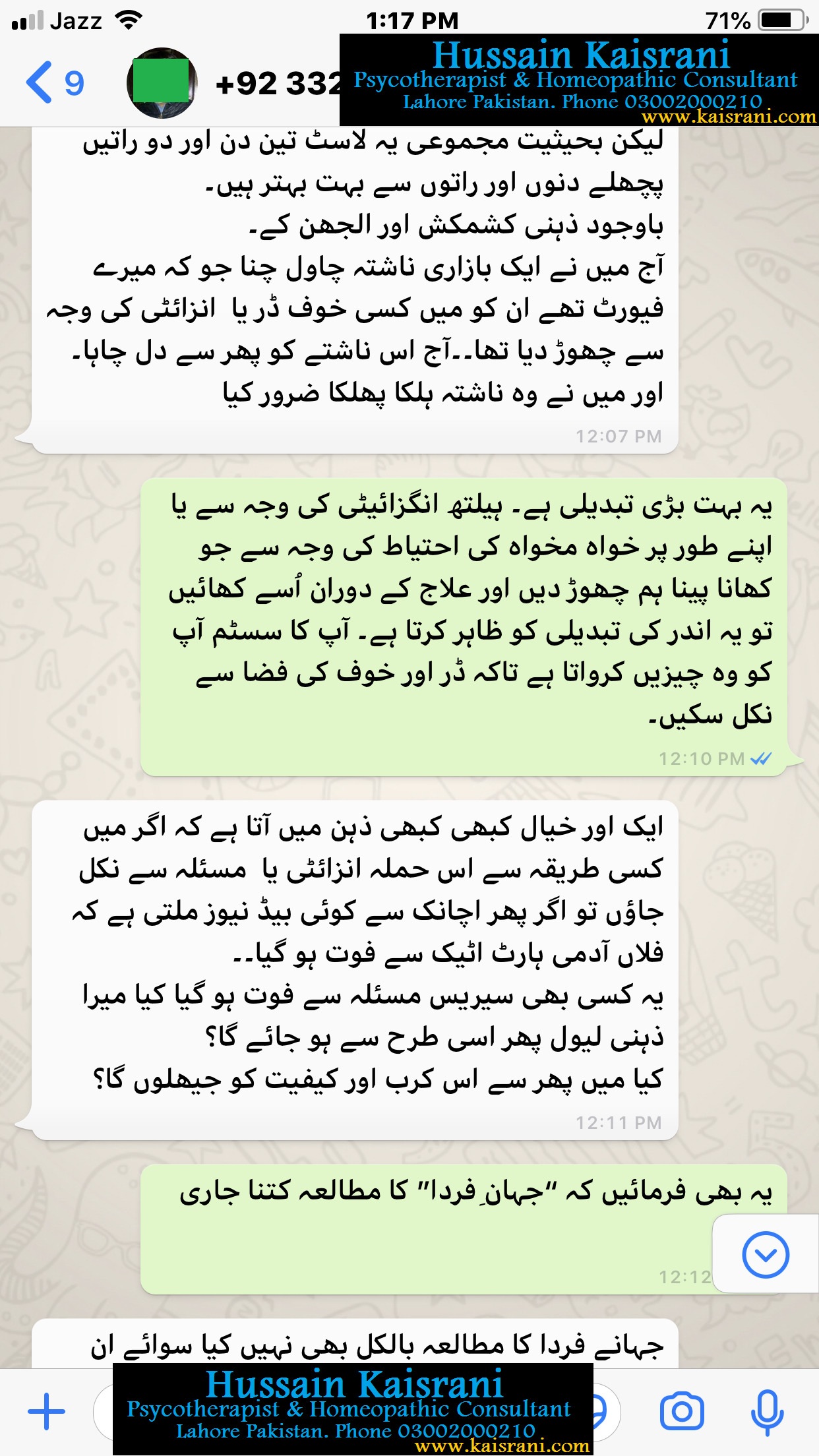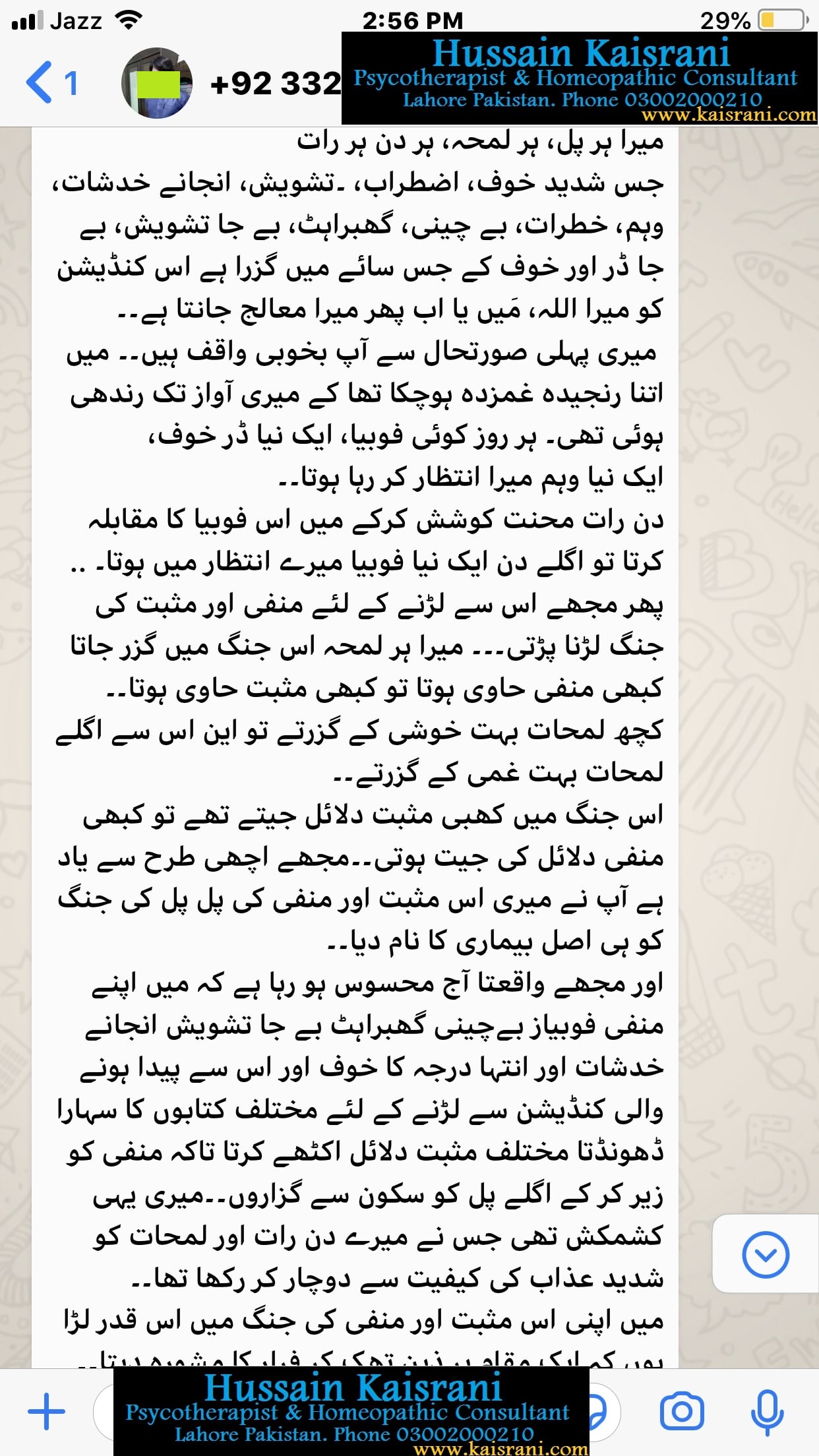 [19/12/2018, 12:04:33 AM] Hussain Kaisrani: بہت نوازش اور شکریہ اپنے کیس اور کامیاب علاج کی تفصیلات شئر کرنے کا۔ ایک ماہ سے کم عرصہ میں آپ ڈر خوف اور فوبیا کی کربناک کیفیت سے نکل کر ہمت، حوصلہ اور سکون بھری زندگی سے لطف اندوز ہونے لگے۔ یہ سب اللہ کریم کی ہم دونوں پر مہربانی سے ہوا یا آپ کے بھرپور تعاون اور ذمہ دارانہ رویہ کے طفیل ممکن ہوا۔