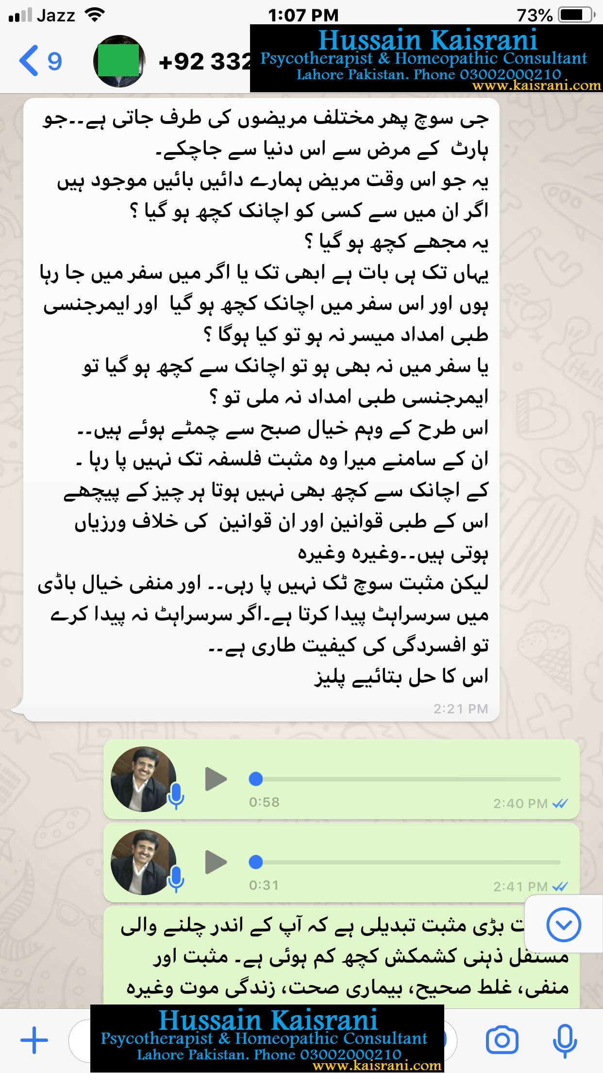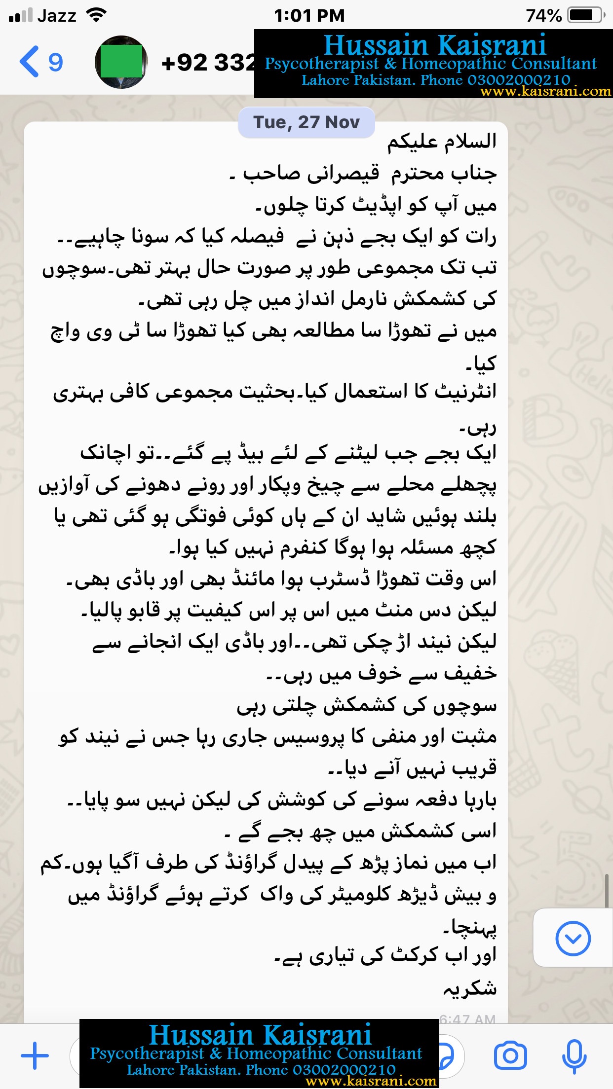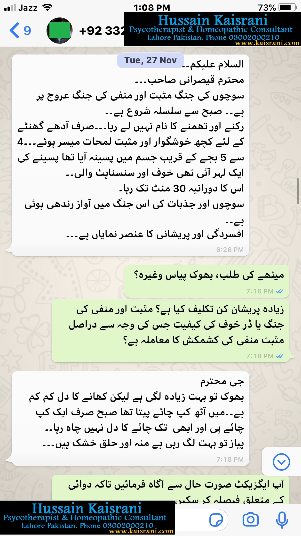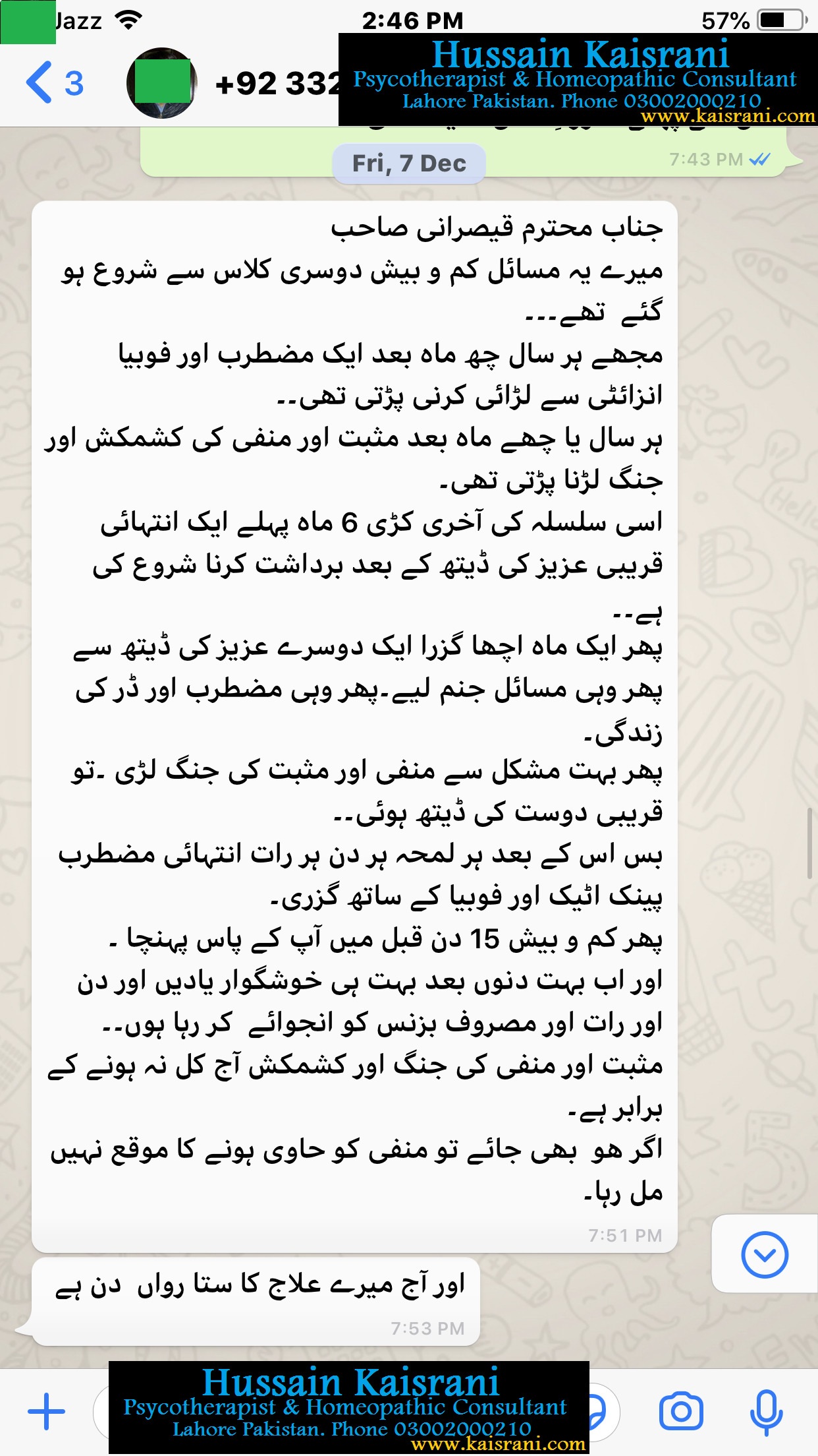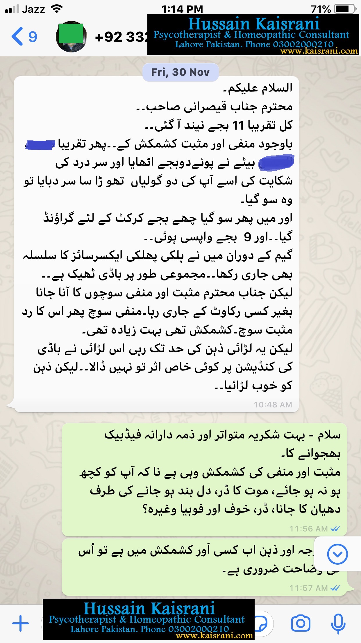 [19/12/2018, 12:04:33 AM] Hussain Kaisrani: بہت نوازش اور شکریہ اپنے کیس اور کامیاب علاج کی تفصیلات شئر کرنے کا۔ ایک ماہ سے کم عرصہ میں آپ ڈر خوف اور فوبیا کی کربناک کیفیت سے نکل کر ہمت، حوصلہ اور سکون بھری زندگی سے لطف اندوز ہونے لگے۔ یہ سب اللہ کریم کی ہم دونوں پر مہربانی سے ہوا یا آپ کے بھرپور تعاون اور ذمہ دارانہ رویہ کے طفیل ممکن ہوا۔