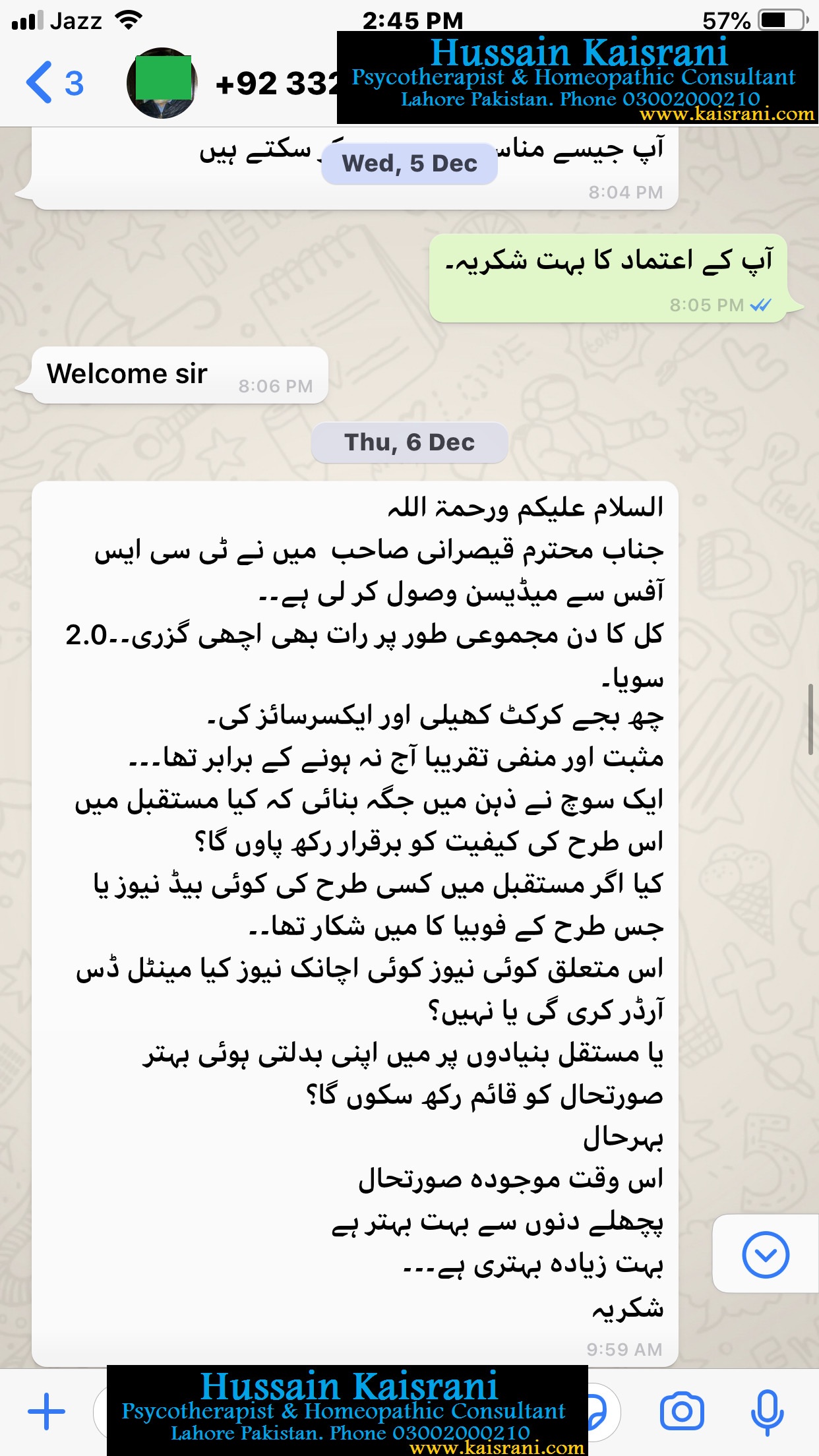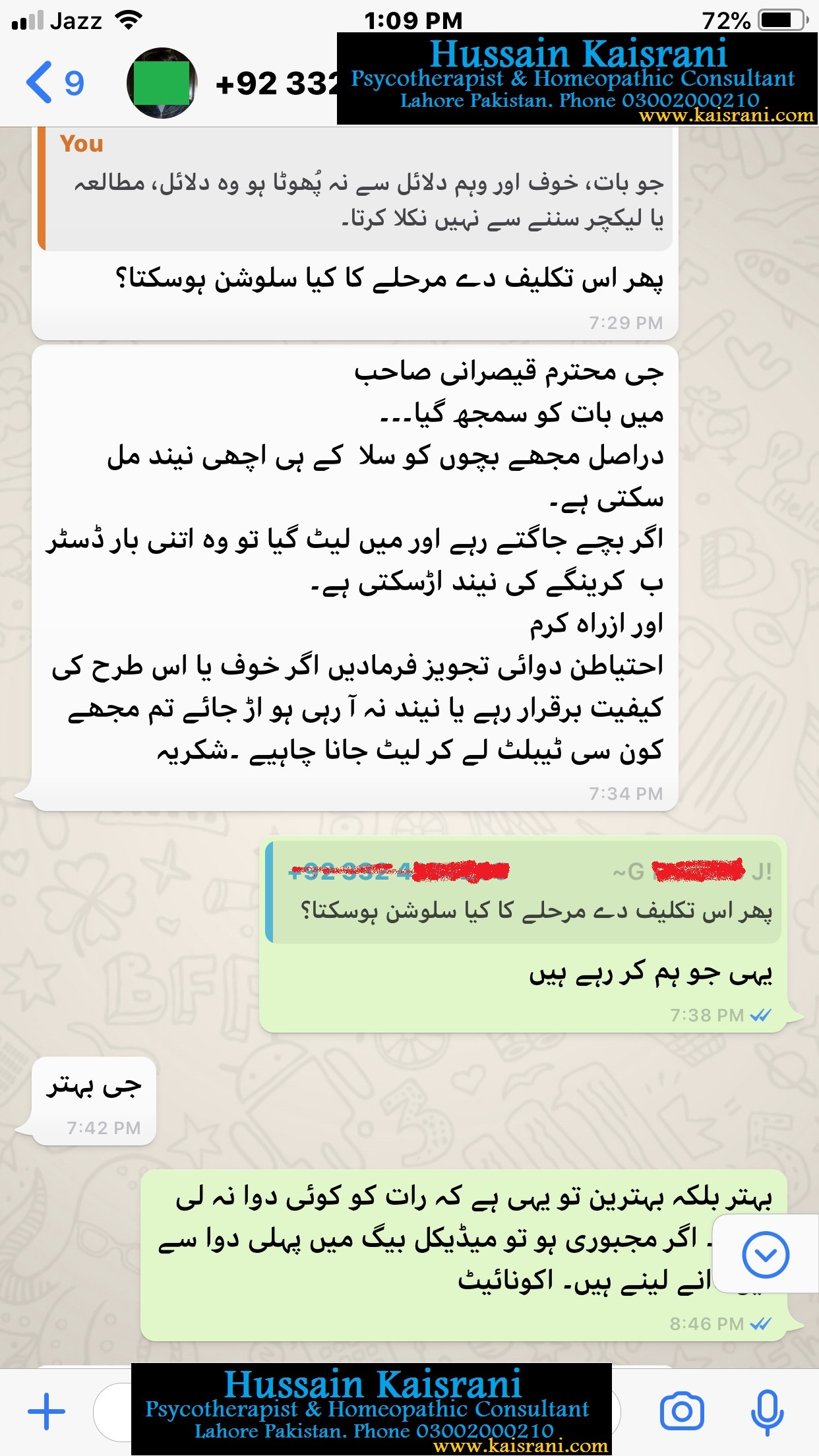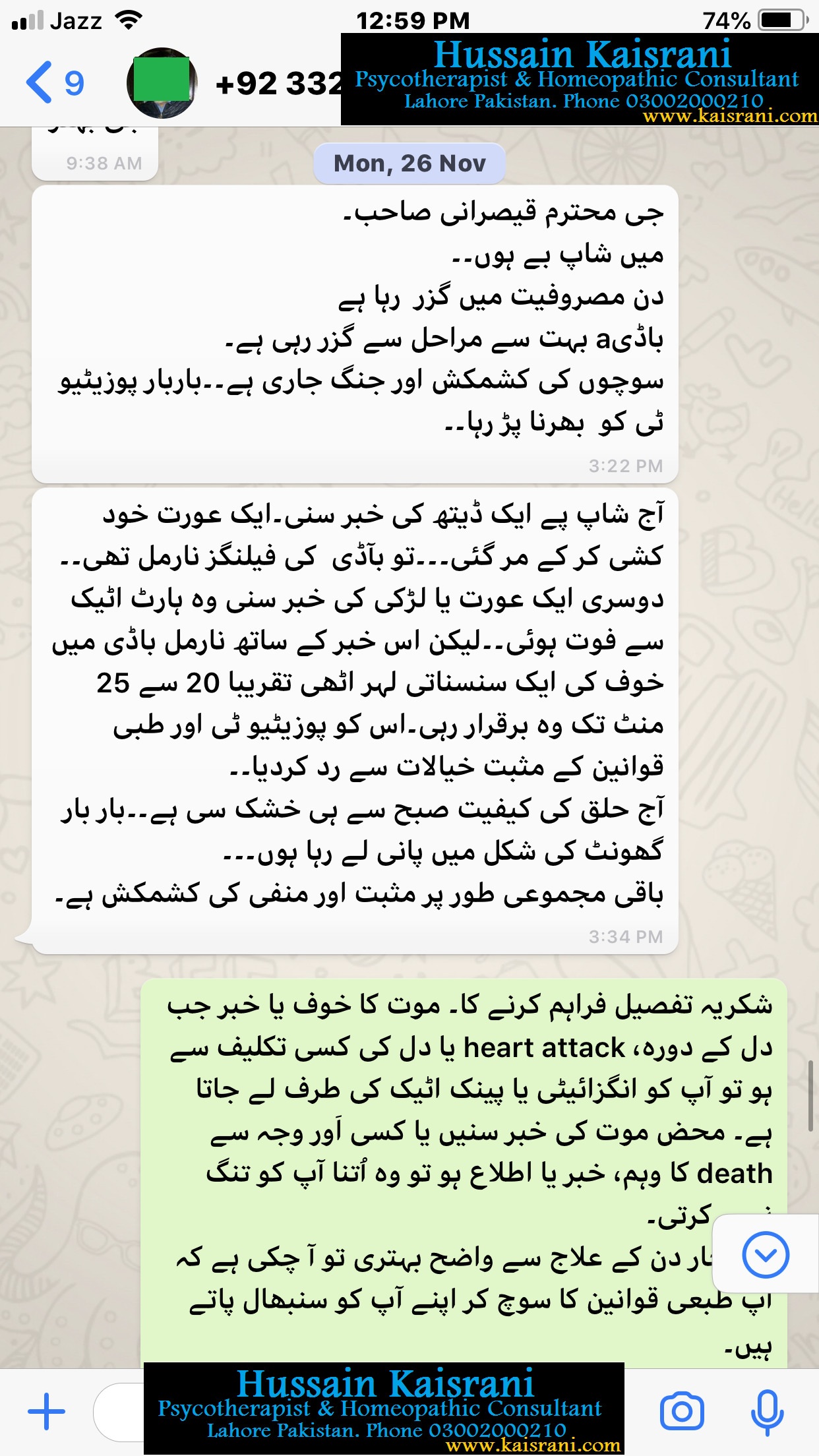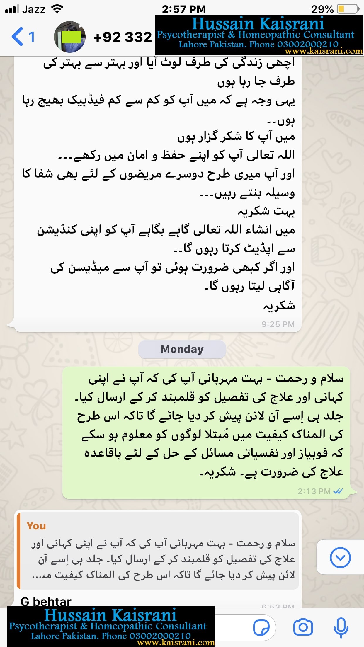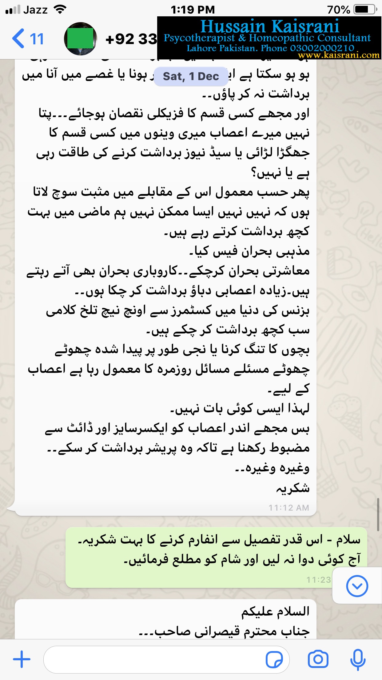 [19/12/2018, 12:04:33 AM] Hussain Kaisrani: بہت نوازش اور شکریہ اپنے کیس اور کامیاب علاج کی تفصیلات شئر کرنے کا۔ ایک ماہ سے کم عرصہ میں آپ ڈر خوف اور فوبیا کی کربناک کیفیت سے نکل کر ہمت، حوصلہ اور سکون بھری زندگی سے لطف اندوز ہونے لگے۔ یہ سب اللہ کریم کی ہم دونوں پر مہربانی سے ہوا یا آپ کے بھرپور تعاون اور ذمہ دارانہ رویہ کے طفیل ممکن ہوا۔