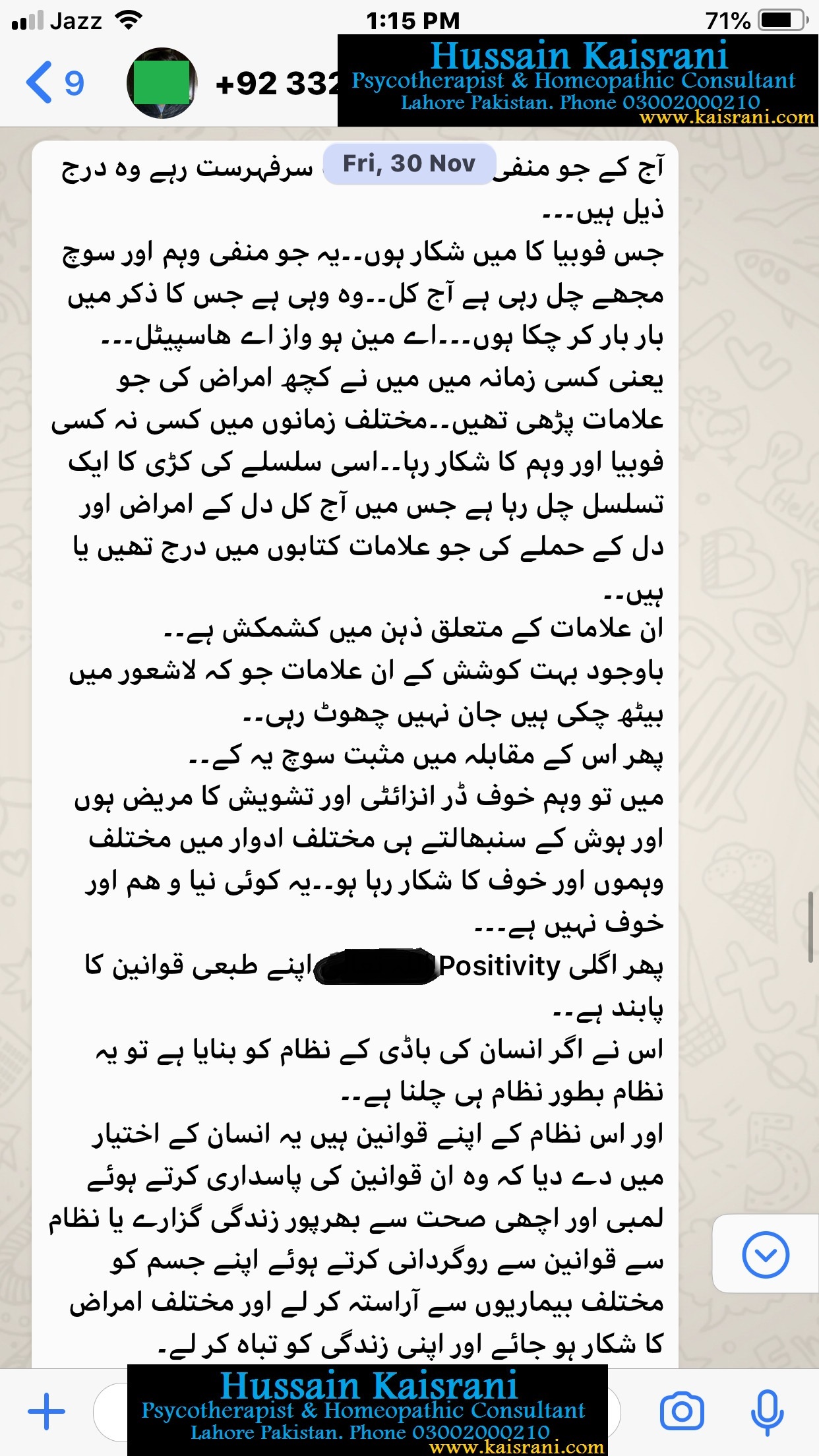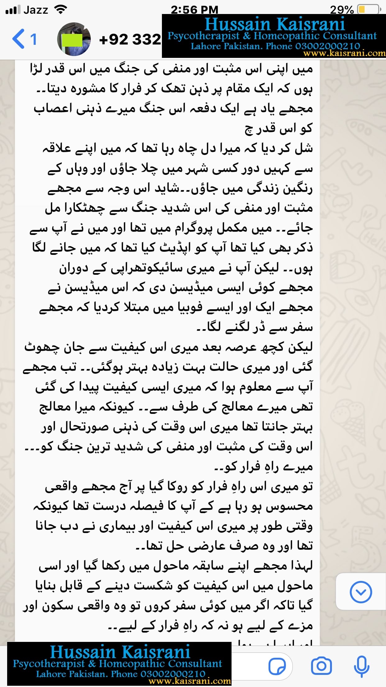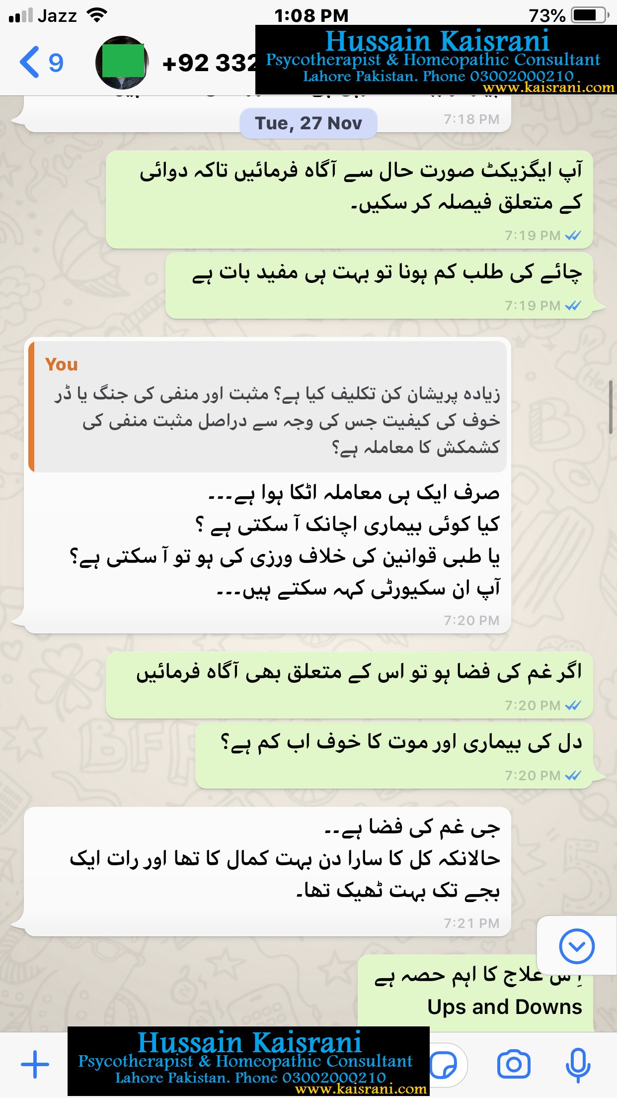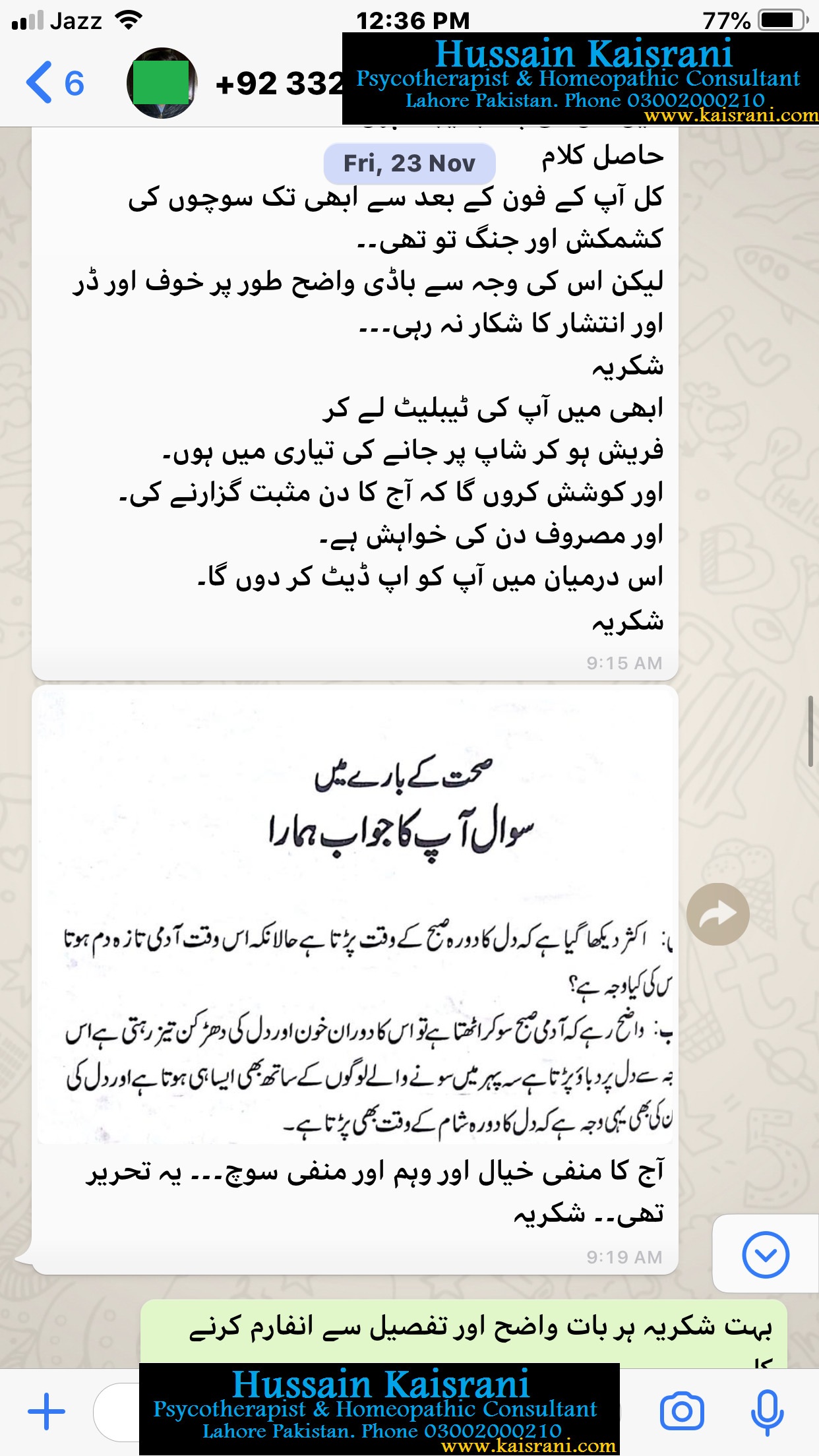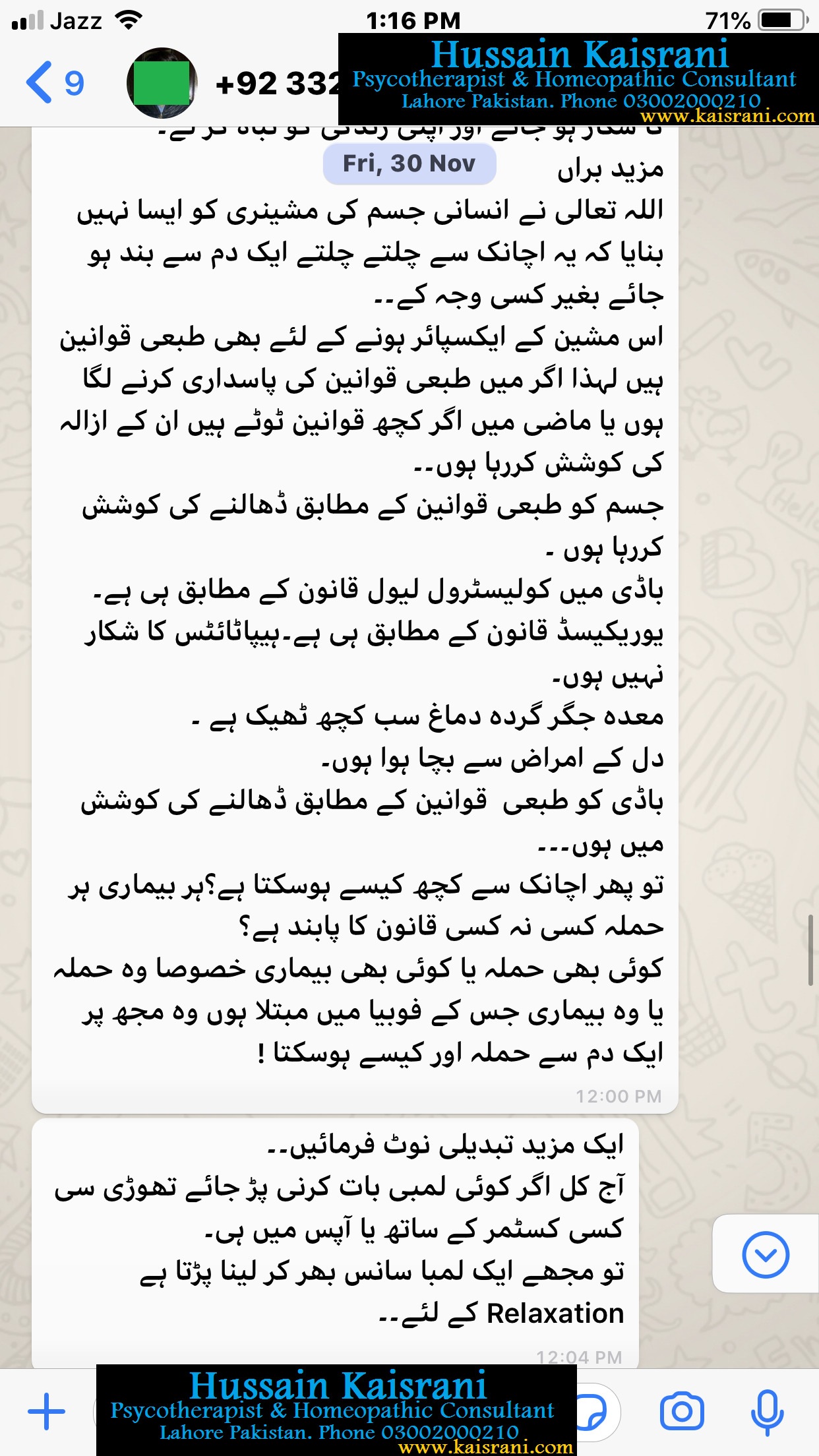 [19/12/2018, 12:04:33 AM] Hussain Kaisrani: بہت نوازش اور شکریہ اپنے کیس اور کامیاب علاج کی تفصیلات شئر کرنے کا۔ ایک ماہ سے کم عرصہ میں آپ ڈر خوف اور فوبیا کی کربناک کیفیت سے نکل کر ہمت، حوصلہ اور سکون بھری زندگی سے لطف اندوز ہونے لگے۔ یہ سب اللہ کریم کی ہم دونوں پر مہربانی سے ہوا یا آپ کے بھرپور تعاون اور ذمہ دارانہ رویہ کے طفیل ممکن ہوا۔