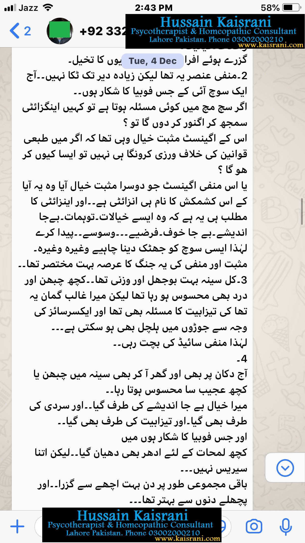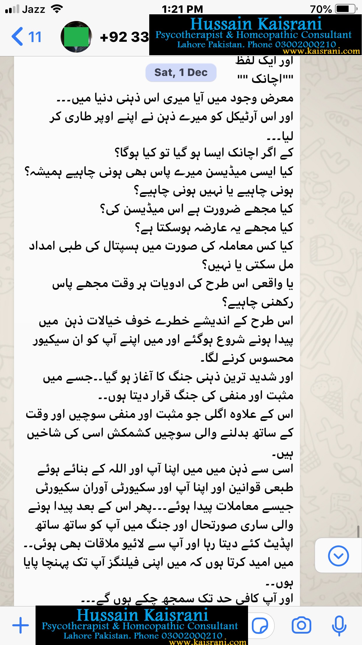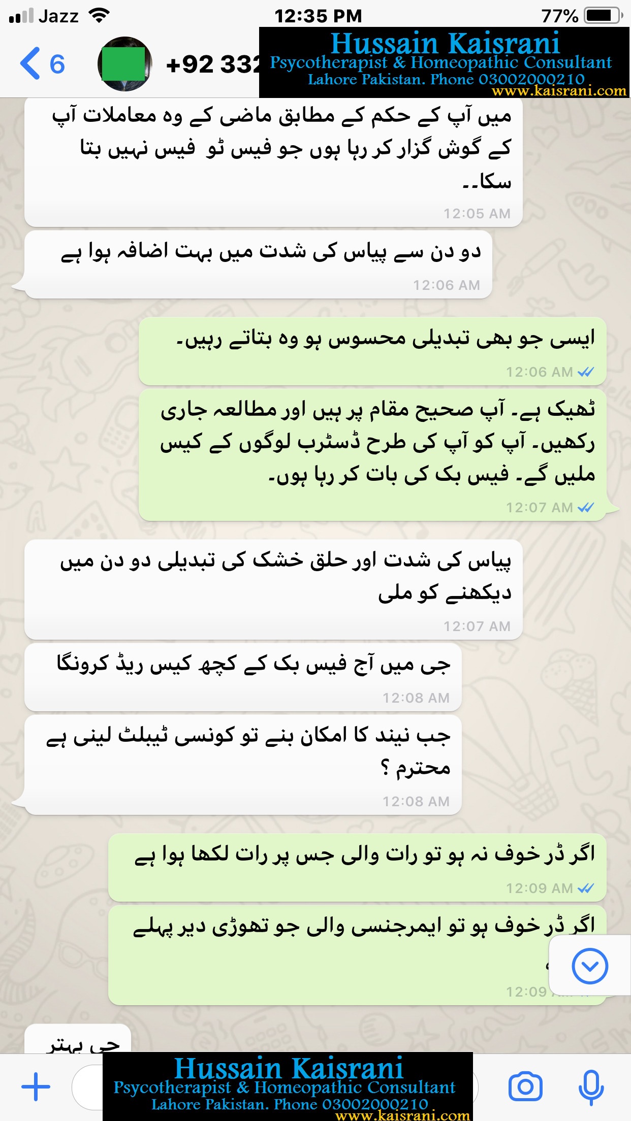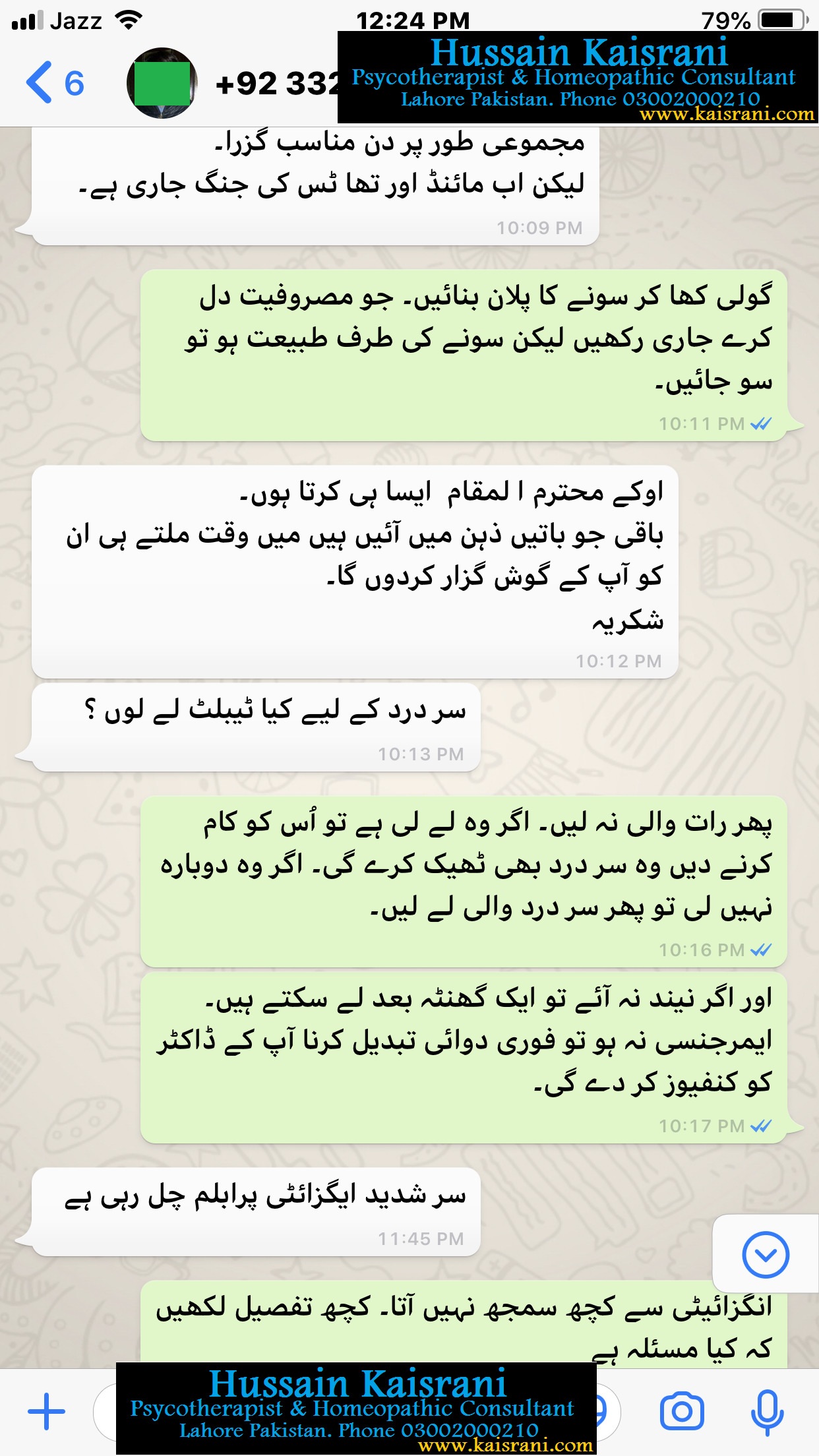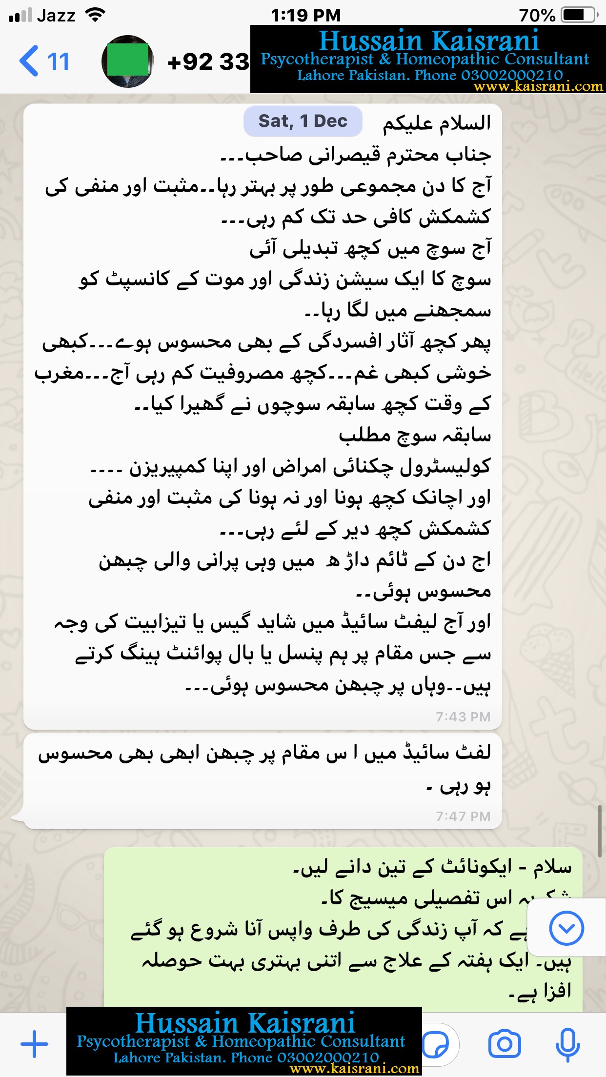 [19/12/2018, 12:04:33 AM] Hussain Kaisrani: بہت نوازش اور شکریہ اپنے کیس اور کامیاب علاج کی تفصیلات شئر کرنے کا۔ ایک ماہ سے کم عرصہ میں آپ ڈر خوف اور فوبیا کی کربناک کیفیت سے نکل کر ہمت، حوصلہ اور سکون بھری زندگی سے لطف اندوز ہونے لگے۔ یہ سب اللہ کریم کی ہم دونوں پر مہربانی سے ہوا یا آپ کے بھرپور تعاون اور ذمہ دارانہ رویہ کے طفیل ممکن ہوا۔