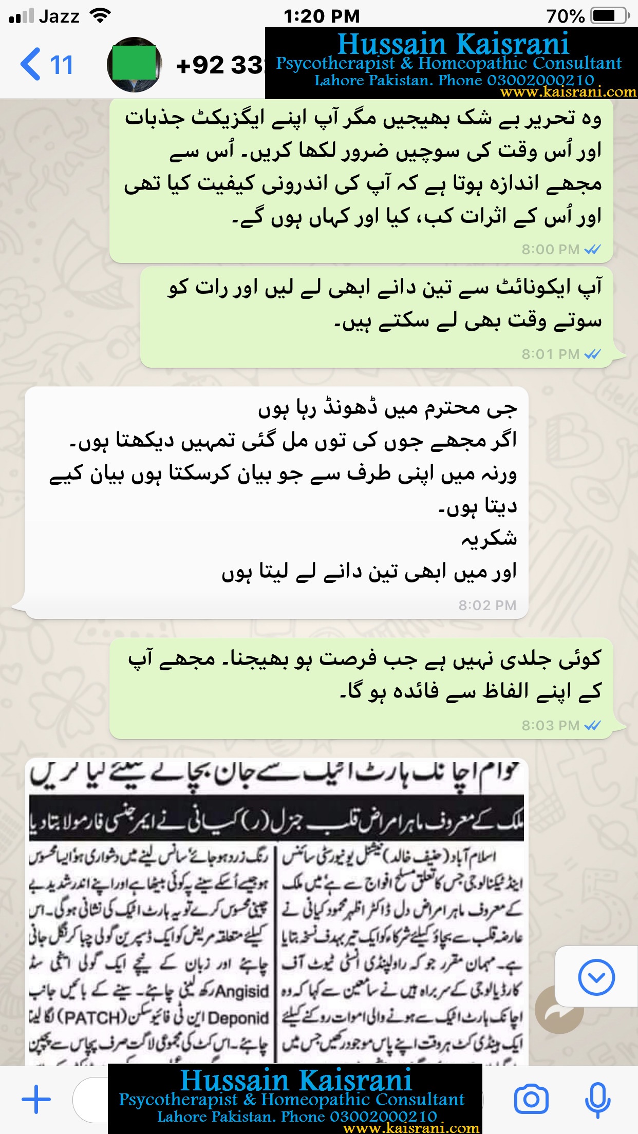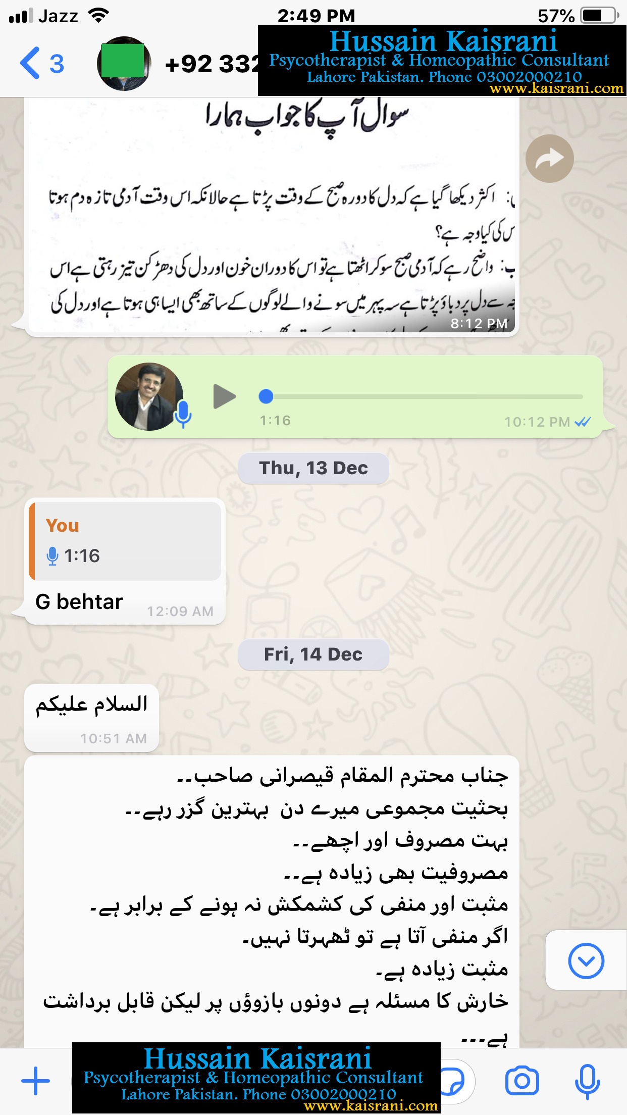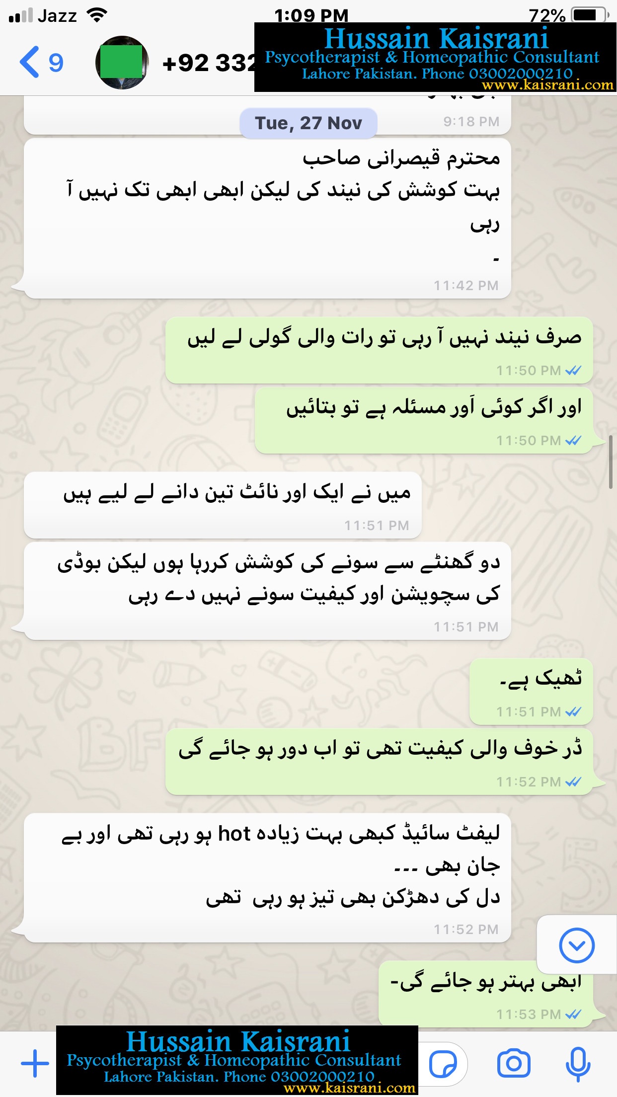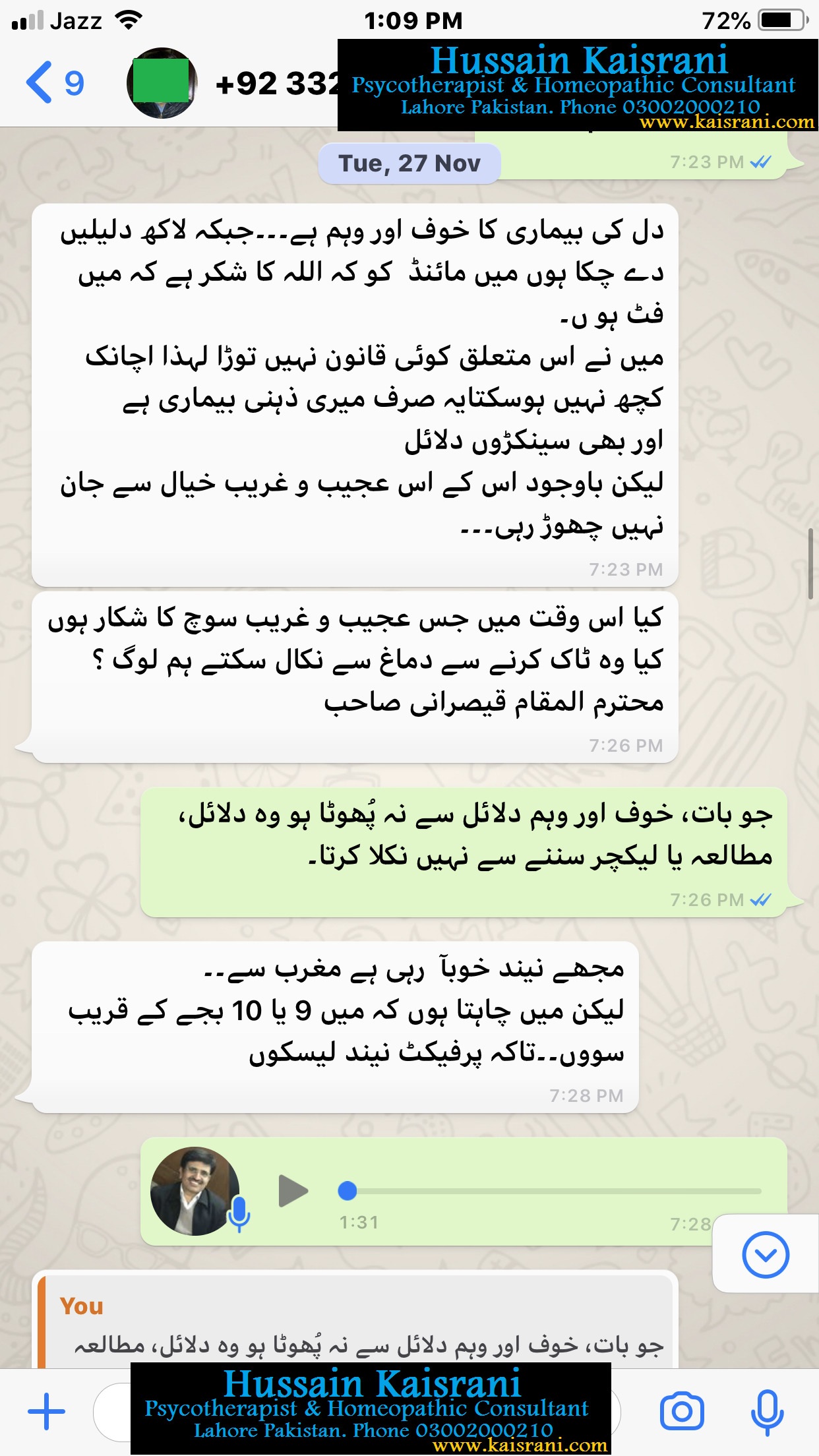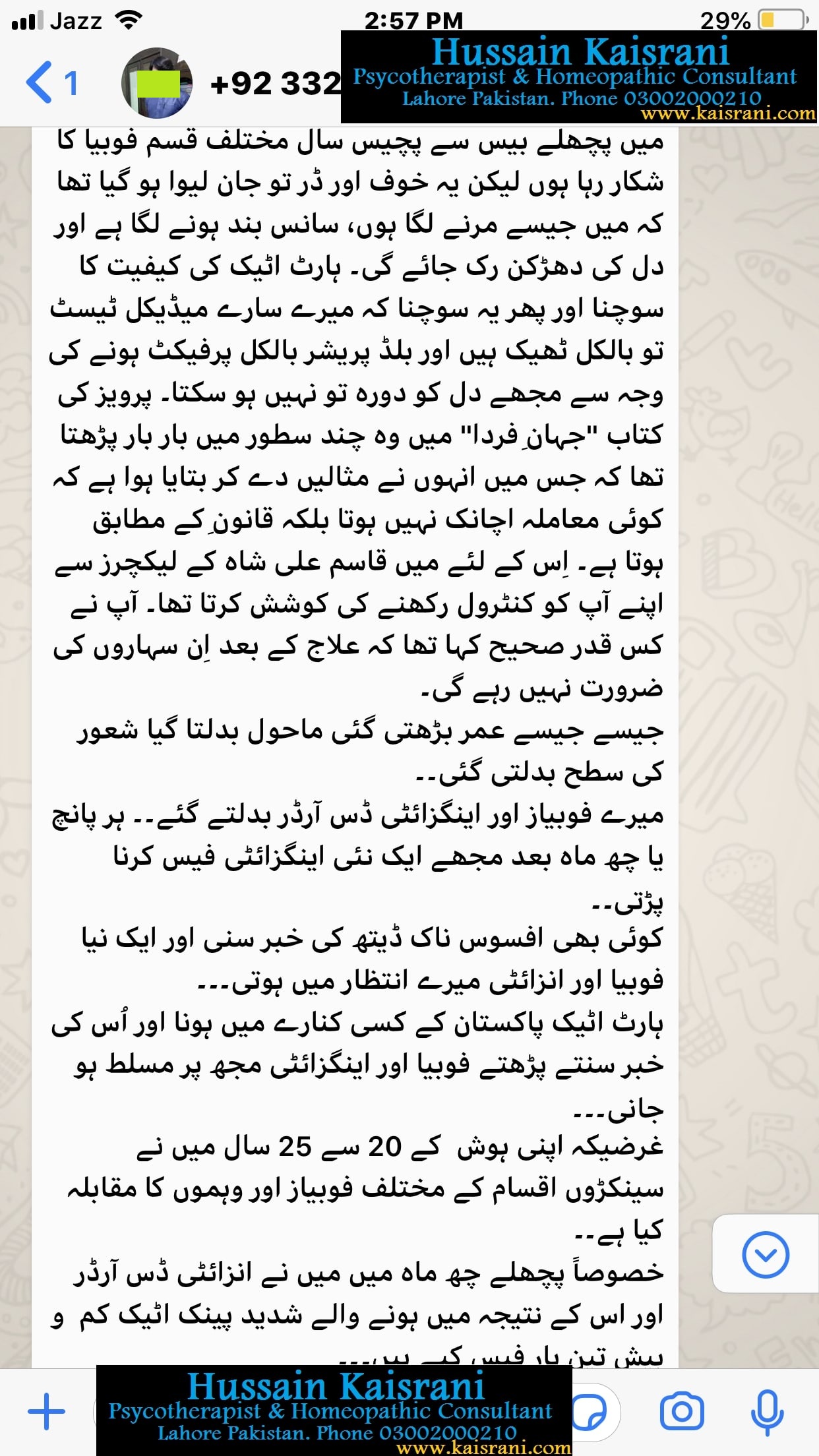 [19/12/2018, 12:04:33 AM] Hussain Kaisrani: بہت نوازش اور شکریہ اپنے کیس اور کامیاب علاج کی تفصیلات شئر کرنے کا۔ ایک ماہ سے کم عرصہ میں آپ ڈر خوف اور فوبیا کی کربناک کیفیت سے نکل کر ہمت، حوصلہ اور سکون بھری زندگی سے لطف اندوز ہونے لگے۔ یہ سب اللہ کریم کی ہم دونوں پر مہربانی سے ہوا یا آپ کے بھرپور تعاون اور ذمہ دارانہ رویہ کے طفیل ممکن ہوا۔