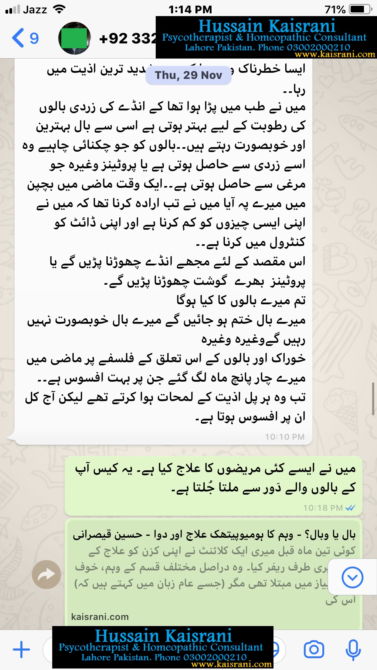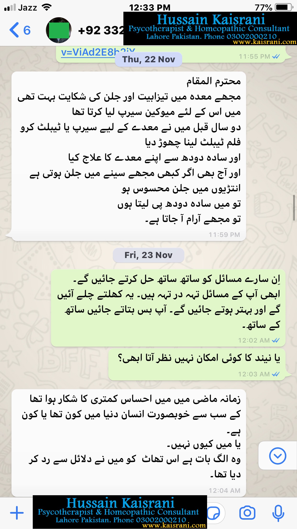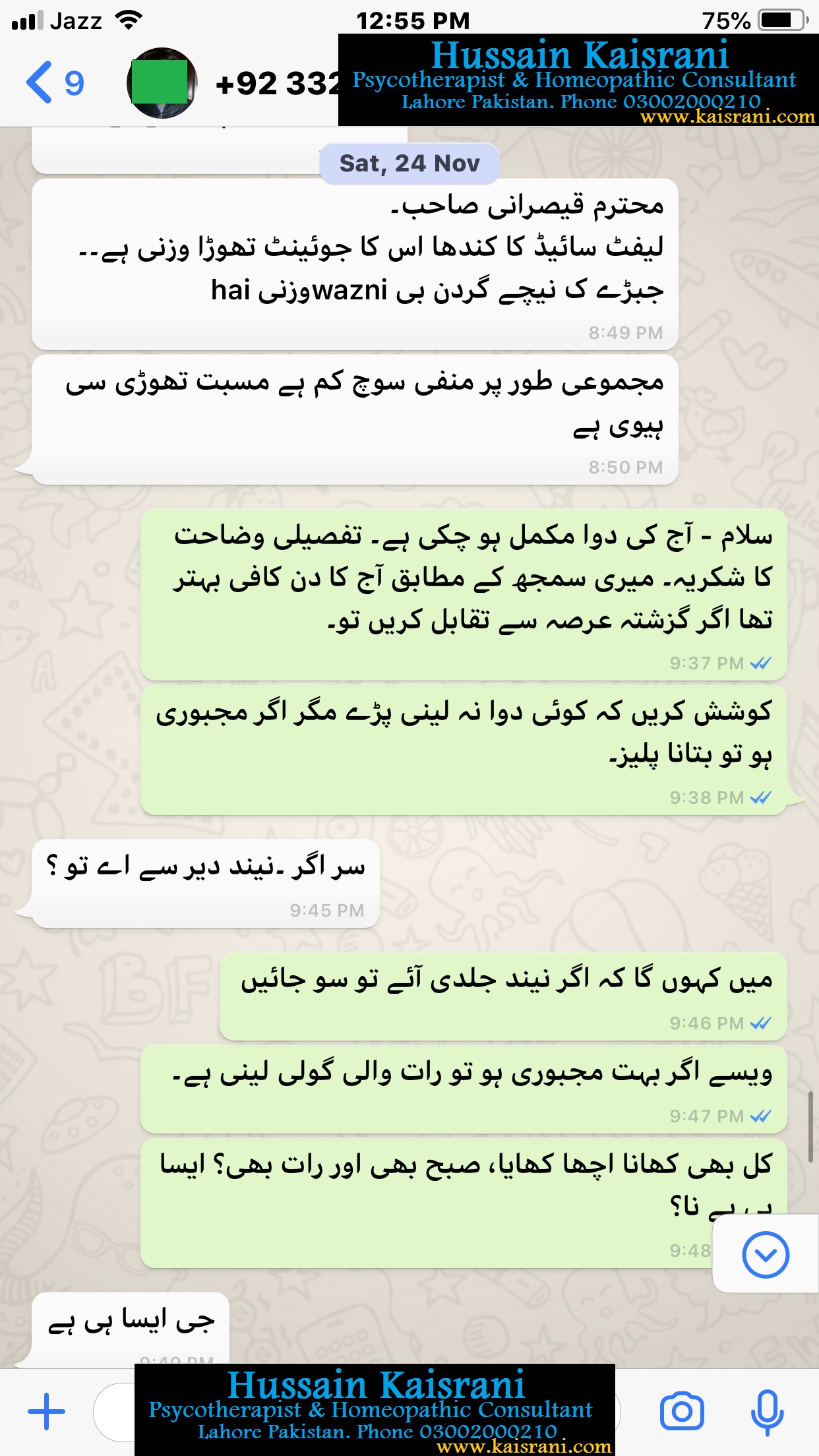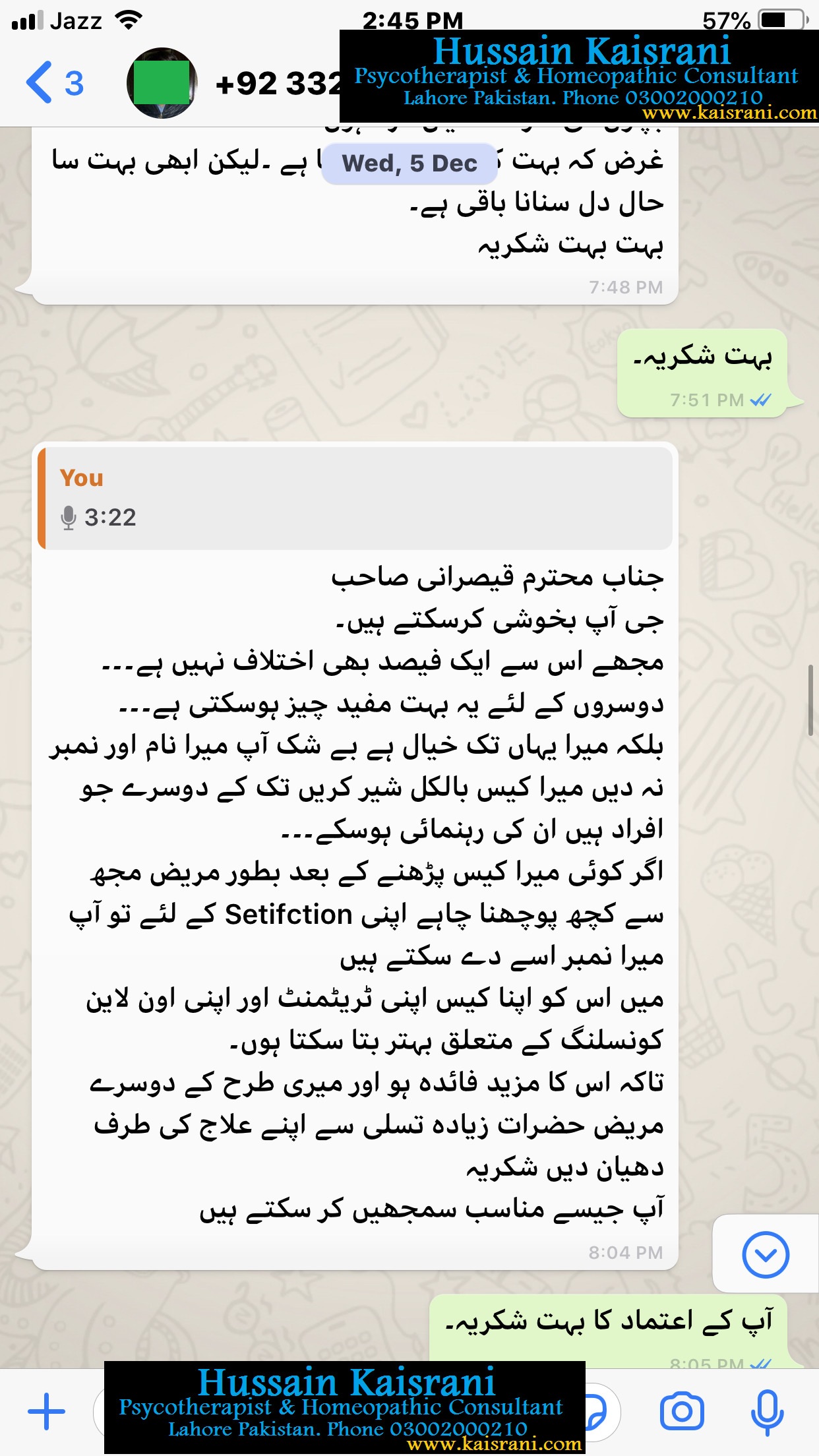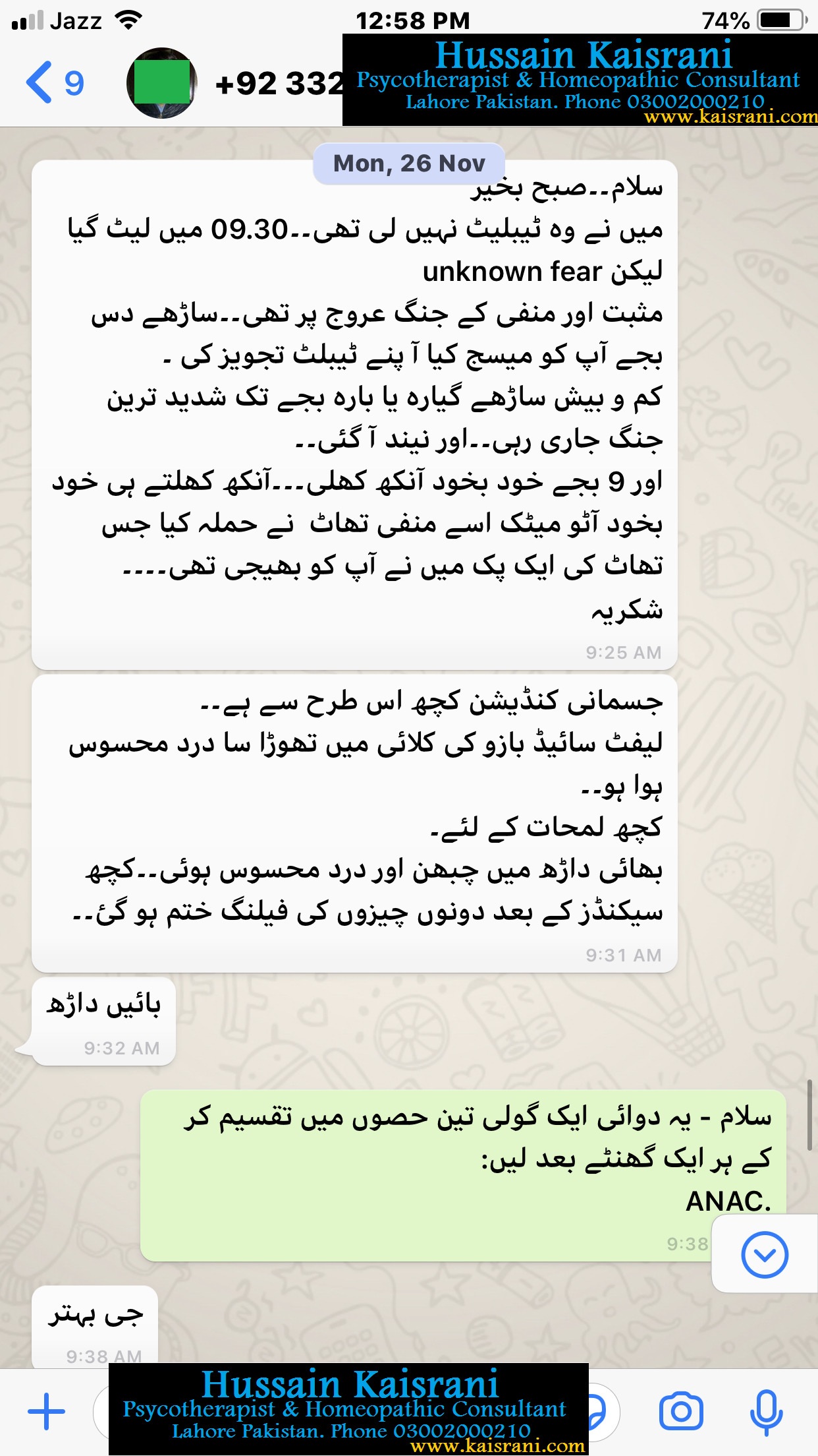 [19/12/2018, 12:04:33 AM] Hussain Kaisrani: بہت نوازش اور شکریہ اپنے کیس اور کامیاب علاج کی تفصیلات شئر کرنے کا۔ ایک ماہ سے کم عرصہ میں آپ ڈر خوف اور فوبیا کی کربناک کیفیت سے نکل کر ہمت، حوصلہ اور سکون بھری زندگی سے لطف اندوز ہونے لگے۔ یہ سب اللہ کریم کی ہم دونوں پر مہربانی سے ہوا یا آپ کے بھرپور تعاون اور ذمہ دارانہ رویہ کے طفیل ممکن ہوا۔