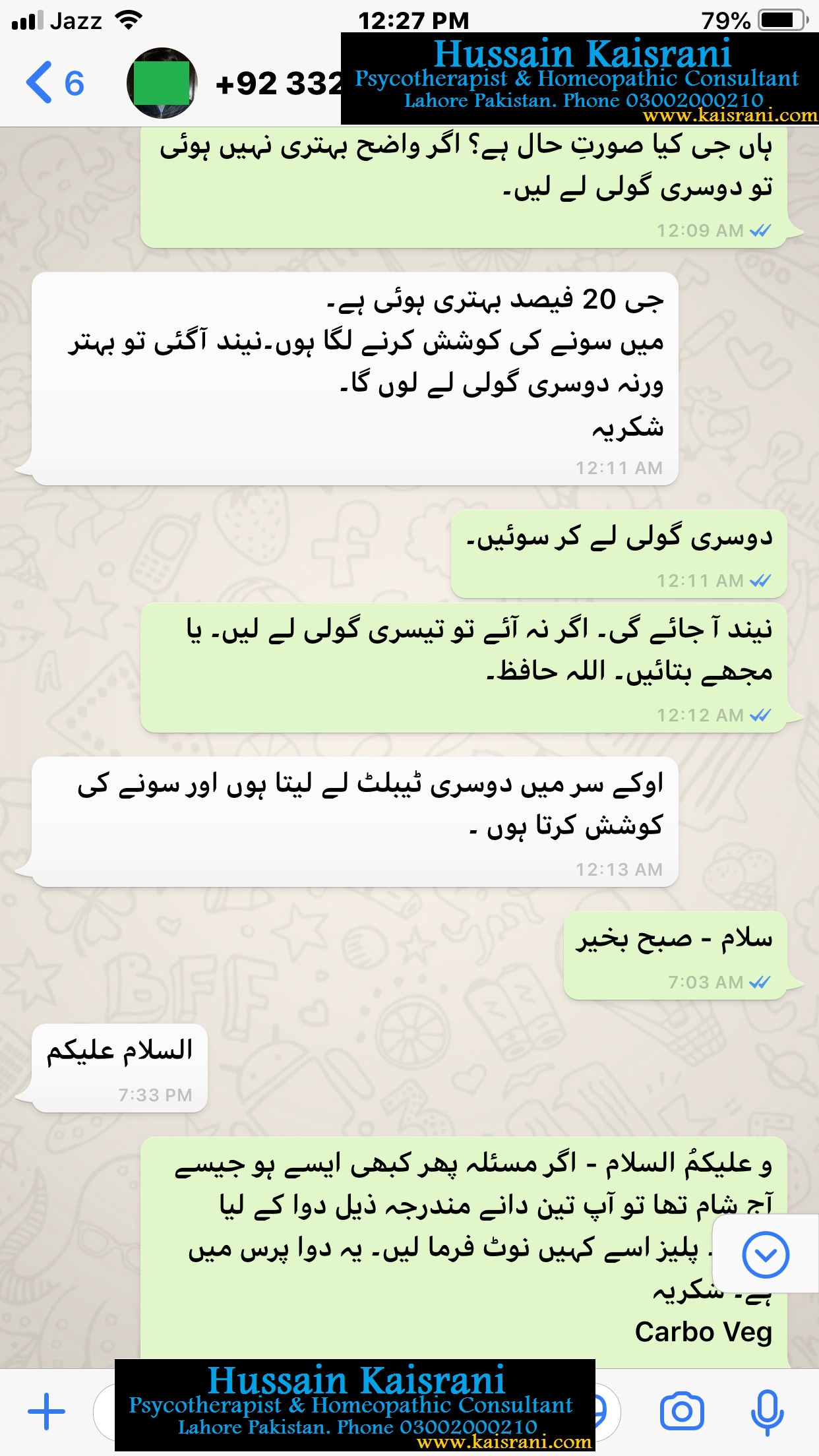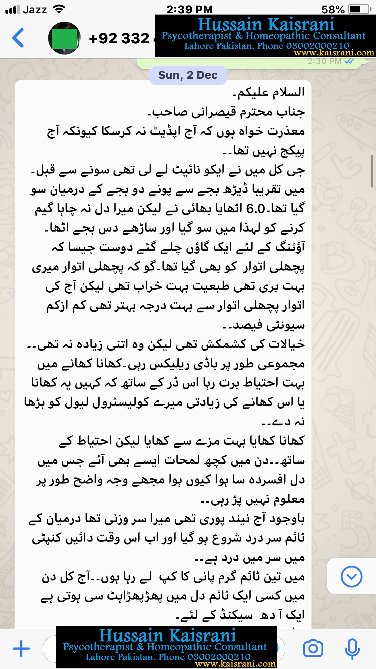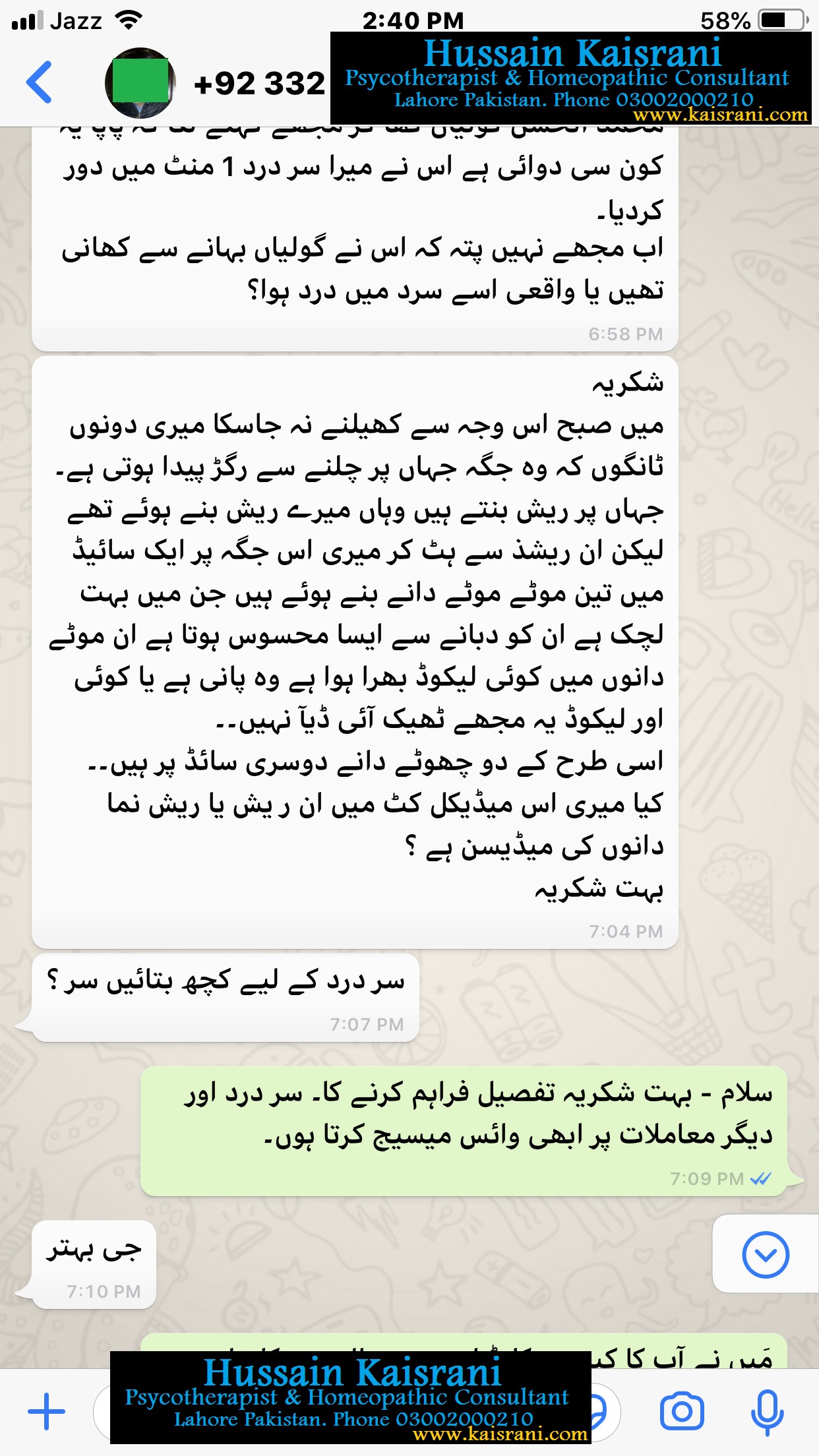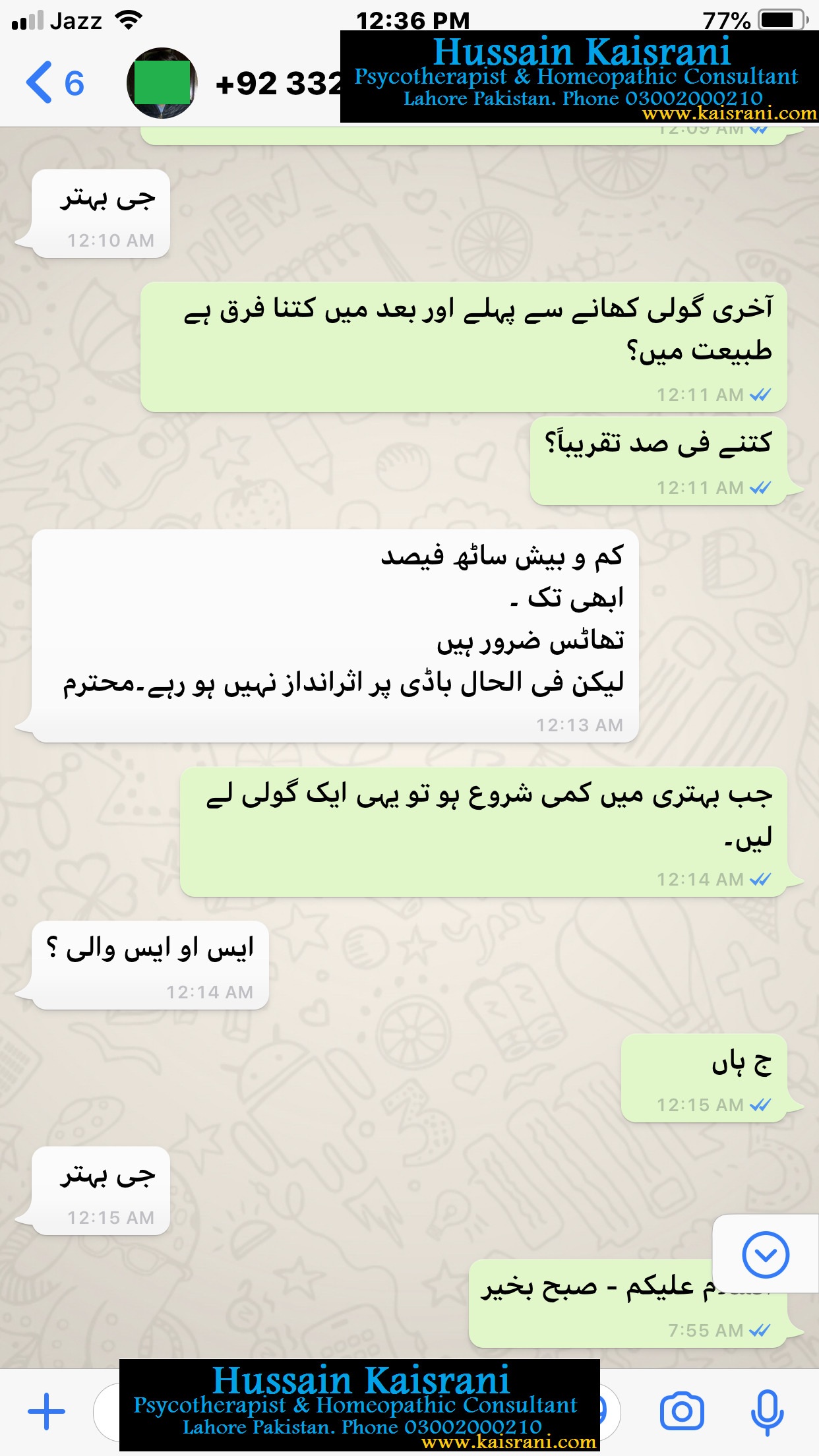 مجھے بہت خوشی ہے کہ اب آپ میڈیسن کے سہاروں سے آزاد ہو چکے ہیں۔ اپنے خاندان کی مزید بہتری اور کاروبار میں اضافہ کے متعلق عملاً کام شروع کر دیا ہے۔ ما شاء اللہ۔