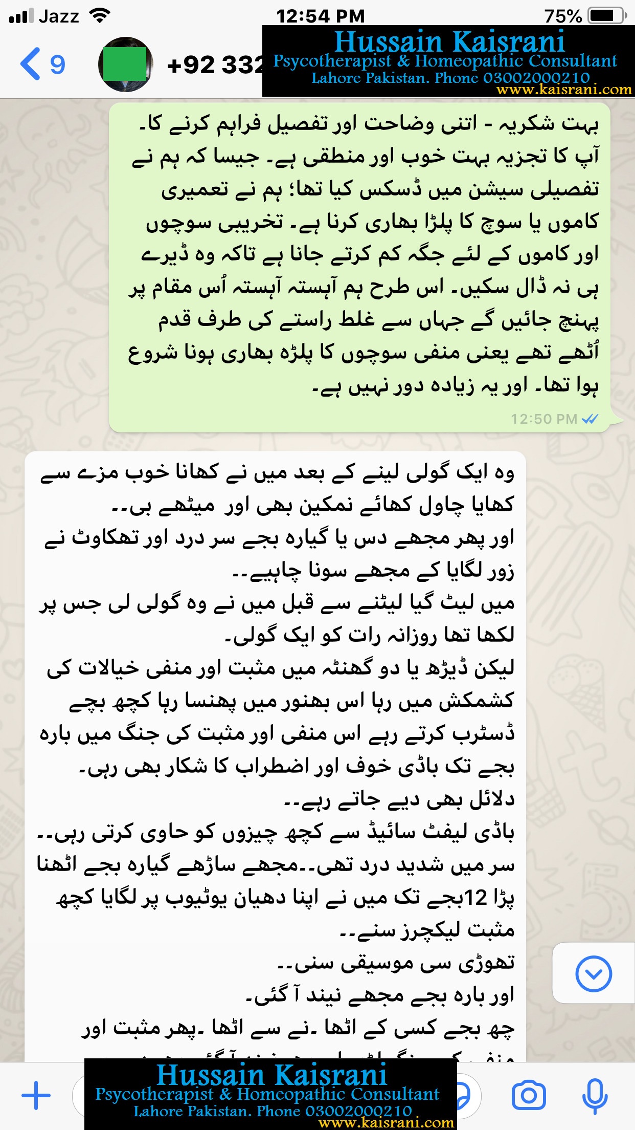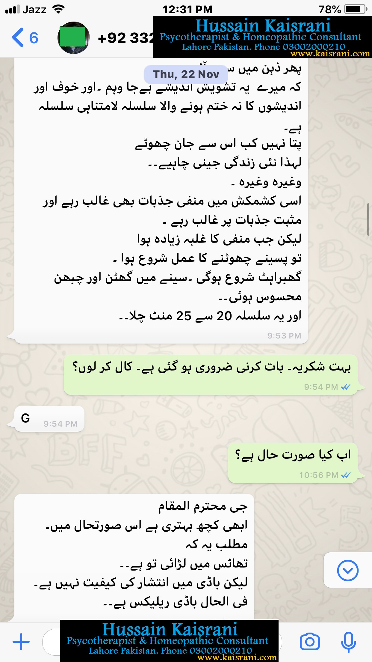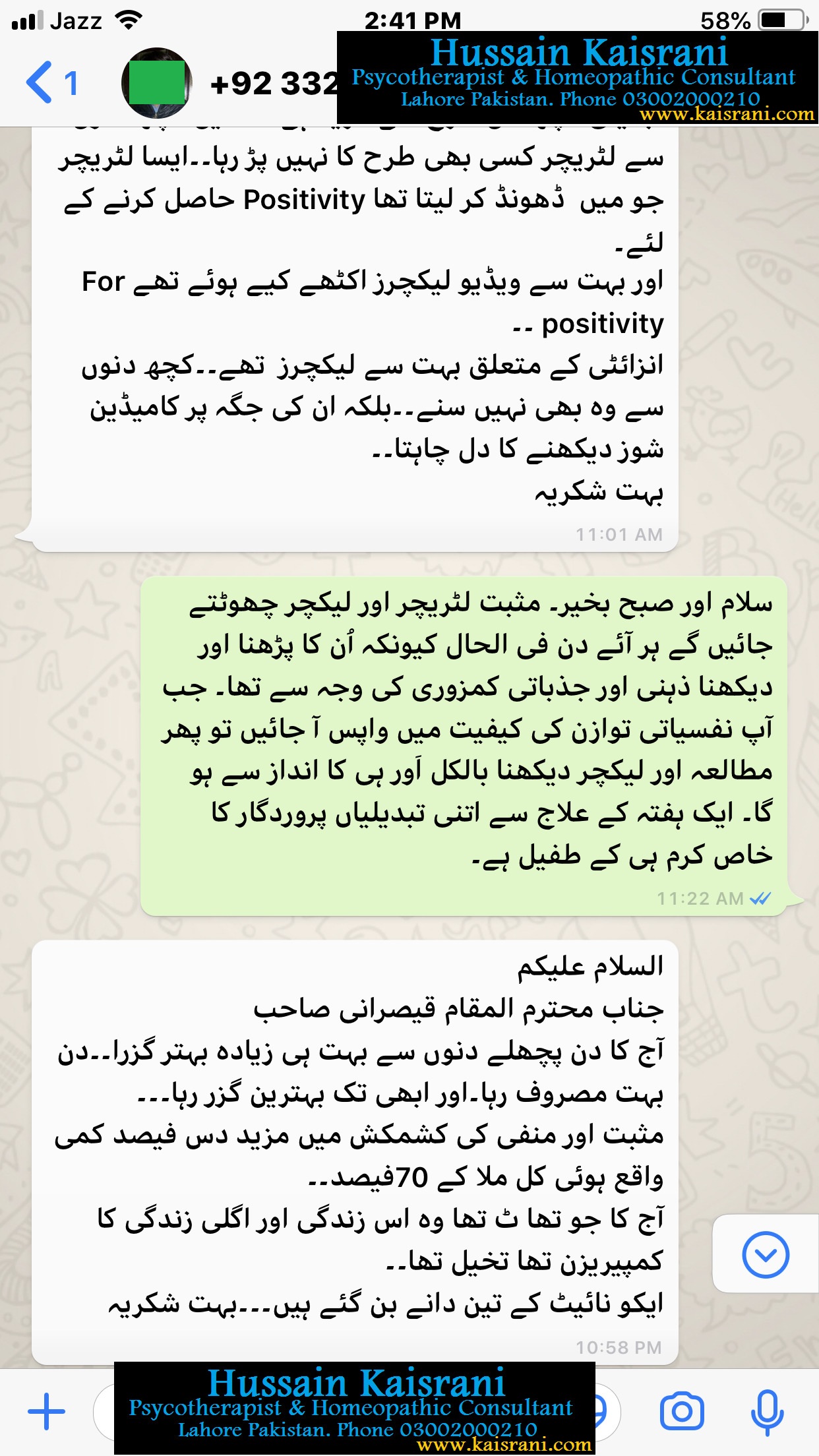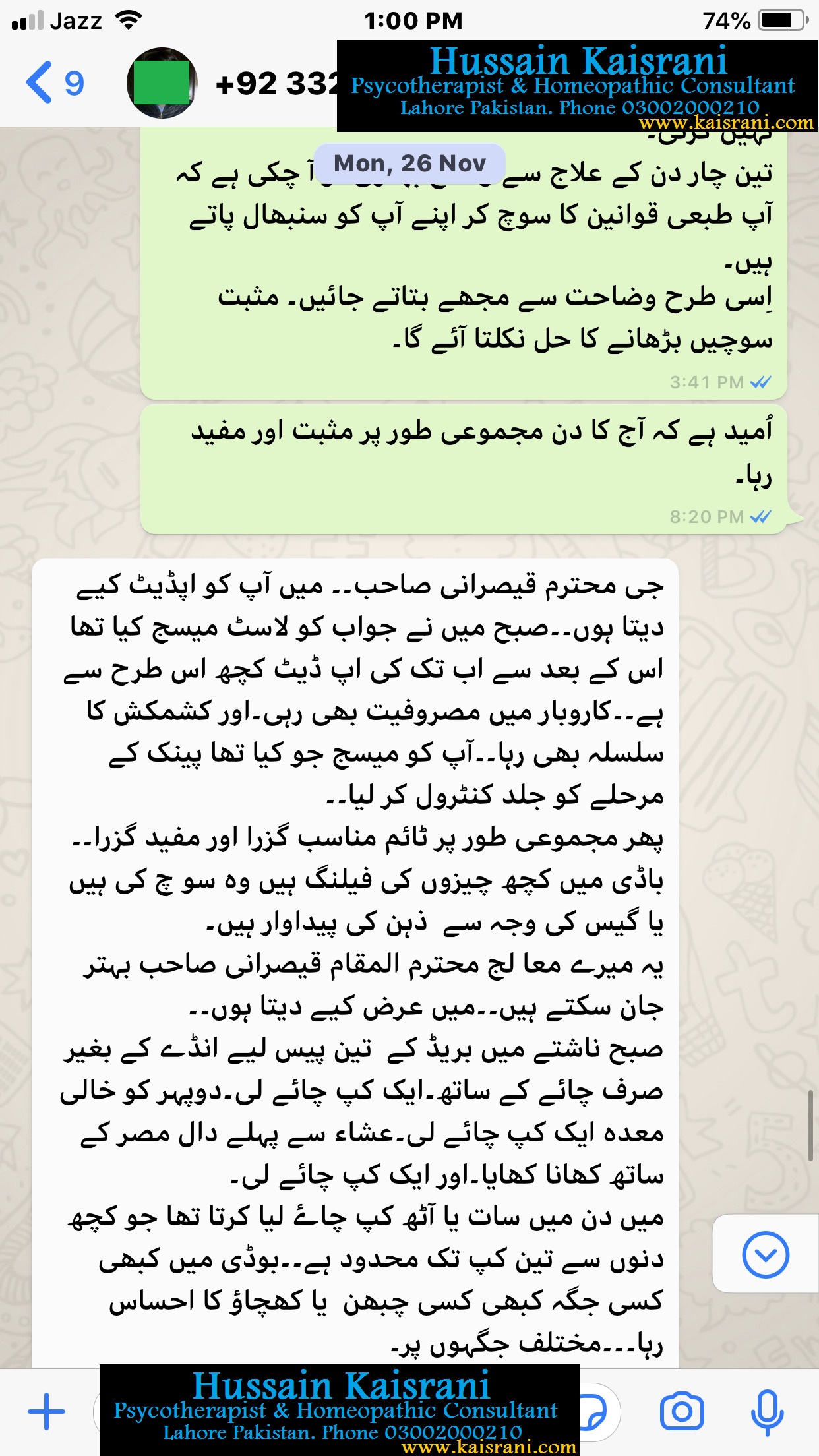 اللہ تعالی کا لاکھ لاکھ شکر گزار ہوں اور اپنے معالج کا شکریہ ادا کرتا ہوں جن کی بہت توجہ اور مسلسل آن لائن ٹریٹمنٹ اور گائیڈنس کی وجہ سے میں واپس اپنی اصل زندگی کی طرف آنے میں کامیاب ہو چکا ہوں۔۔ اپنے کاروبار کو مکمل اور بہتر انداز سے چلانا شروع کر دیا ہے۔ گھریلو معاملات بھی بہتر انداز سے ڈیل کرنے لگ گیا ہوں۔ اور حالات بہتر سے بہترین کی طرف جا رہے ہیں۔۔۔