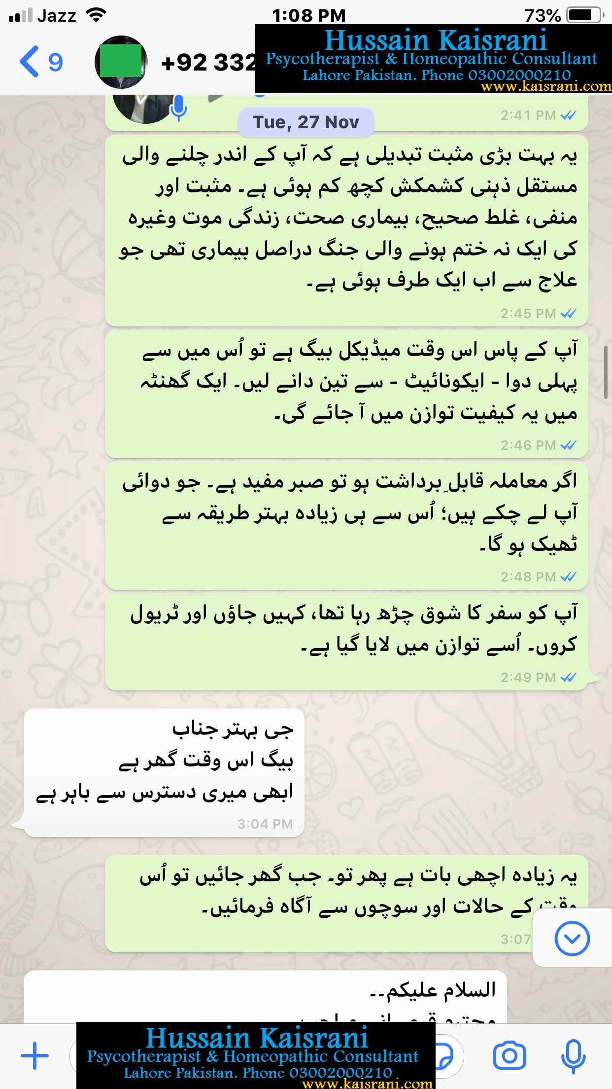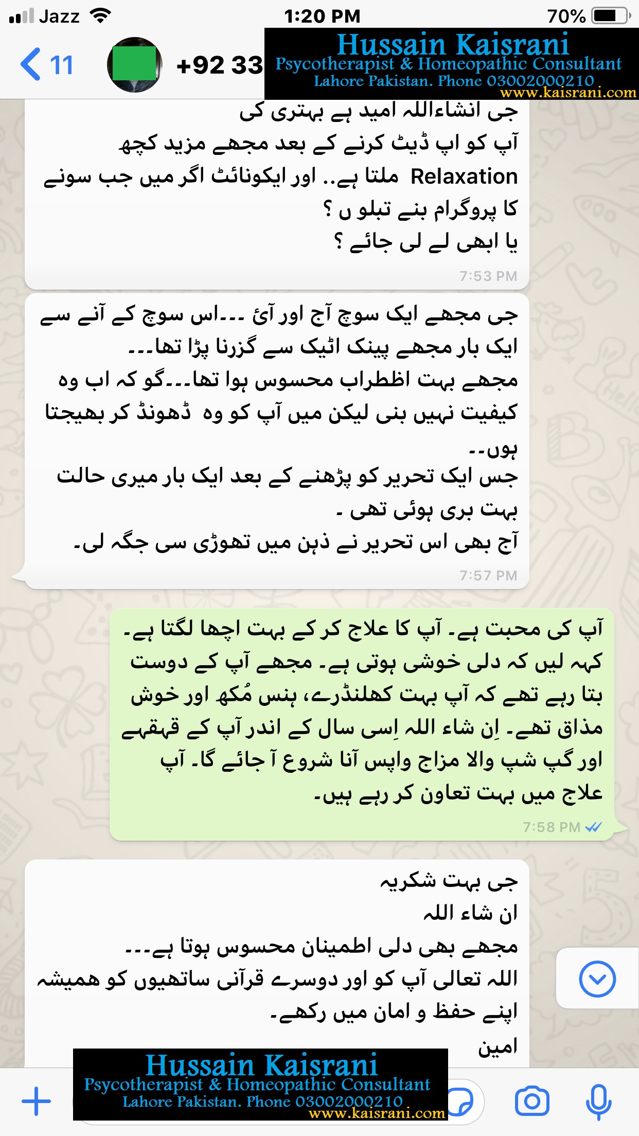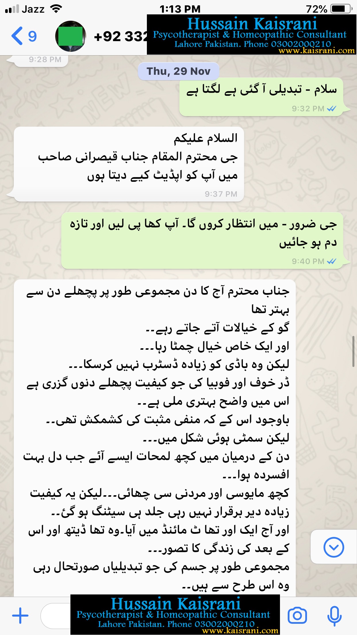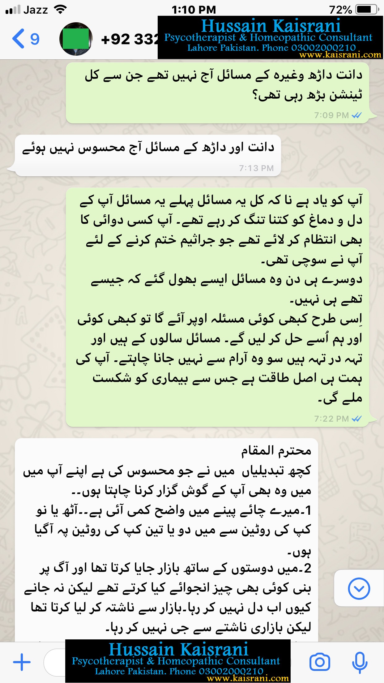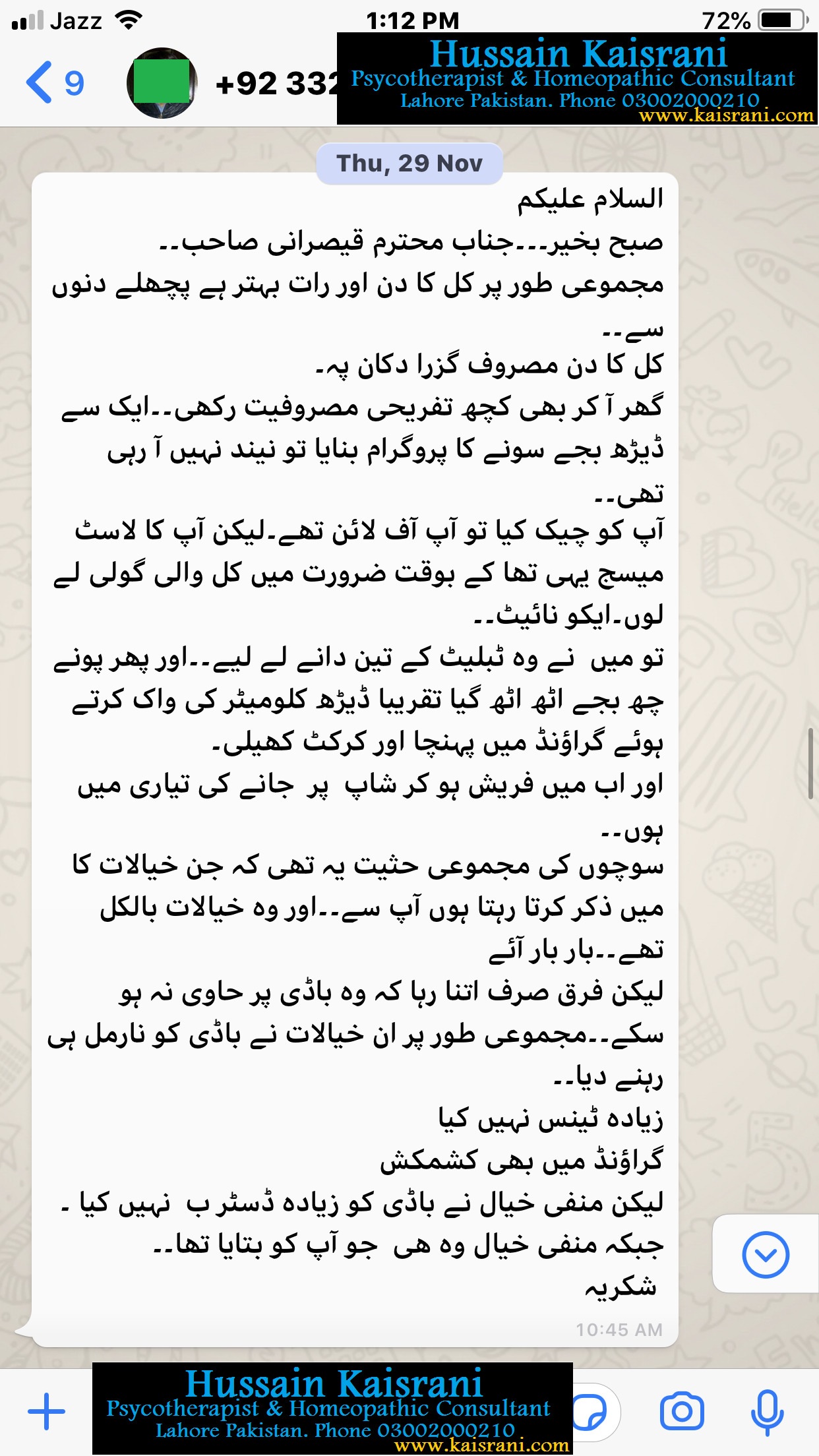 اللہ تعالی کا لاکھ لاکھ شکر گزار ہوں اور اپنے معالج کا شکریہ ادا کرتا ہوں جن کی بہت توجہ اور مسلسل آن لائن ٹریٹمنٹ اور گائیڈنس کی وجہ سے میں واپس اپنی اصل زندگی کی طرف آنے میں کامیاب ہو چکا ہوں۔۔ اپنے کاروبار کو مکمل اور بہتر انداز سے چلانا شروع کر دیا ہے۔ گھریلو معاملات بھی بہتر انداز سے ڈیل کرنے لگ گیا ہوں۔ اور حالات بہتر سے بہترین کی طرف جا رہے ہیں۔۔۔