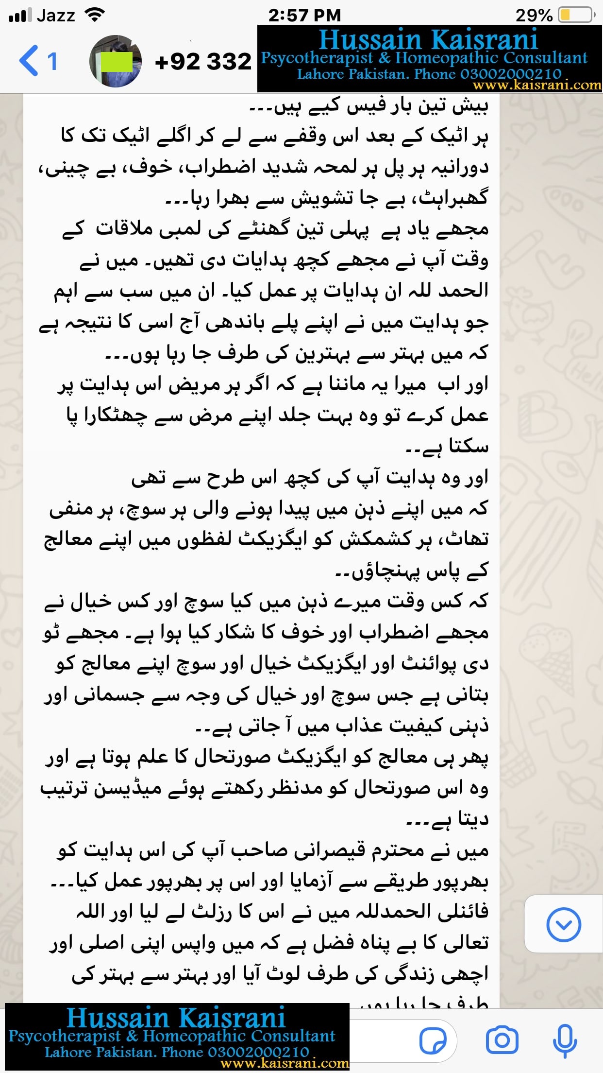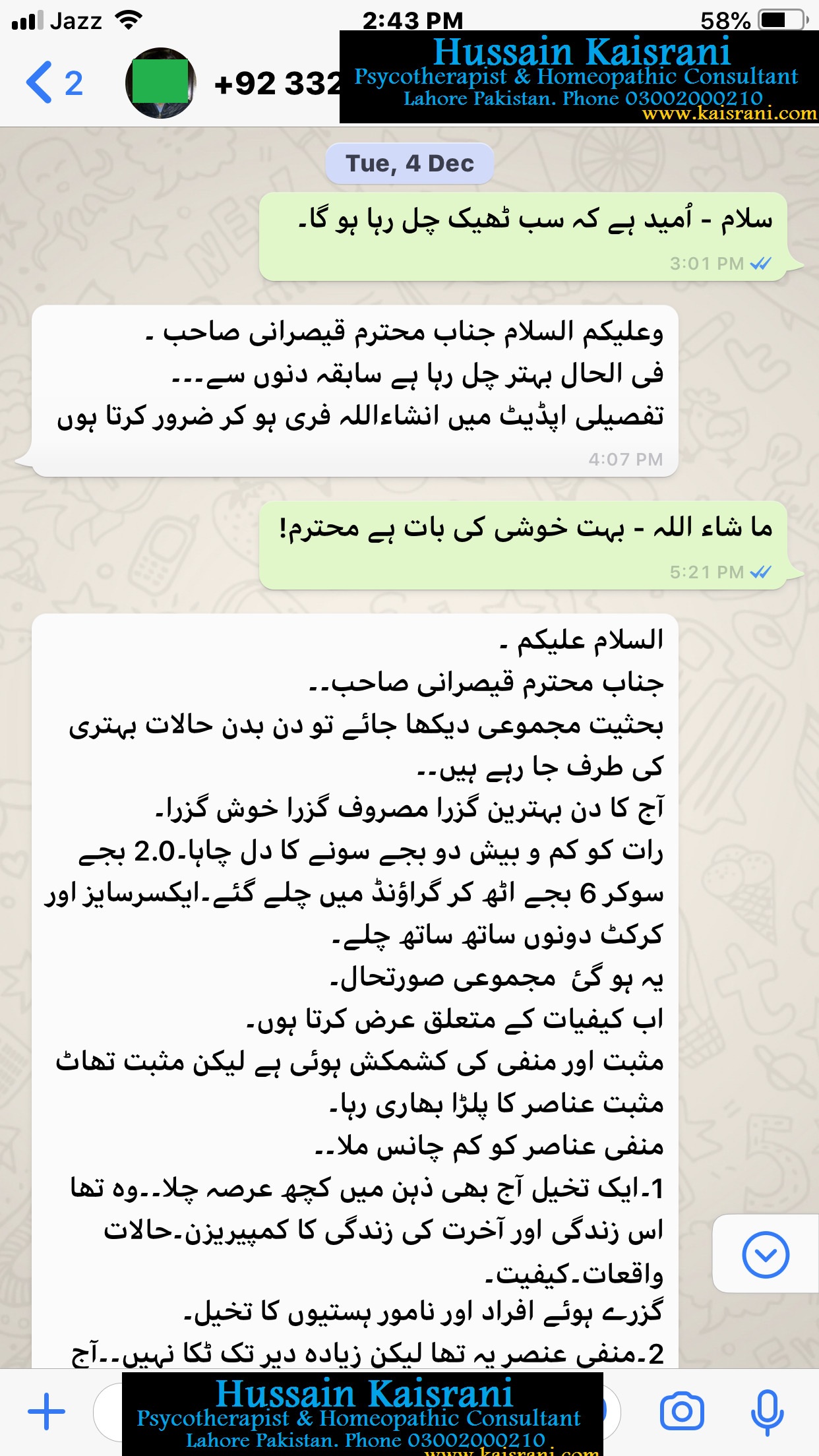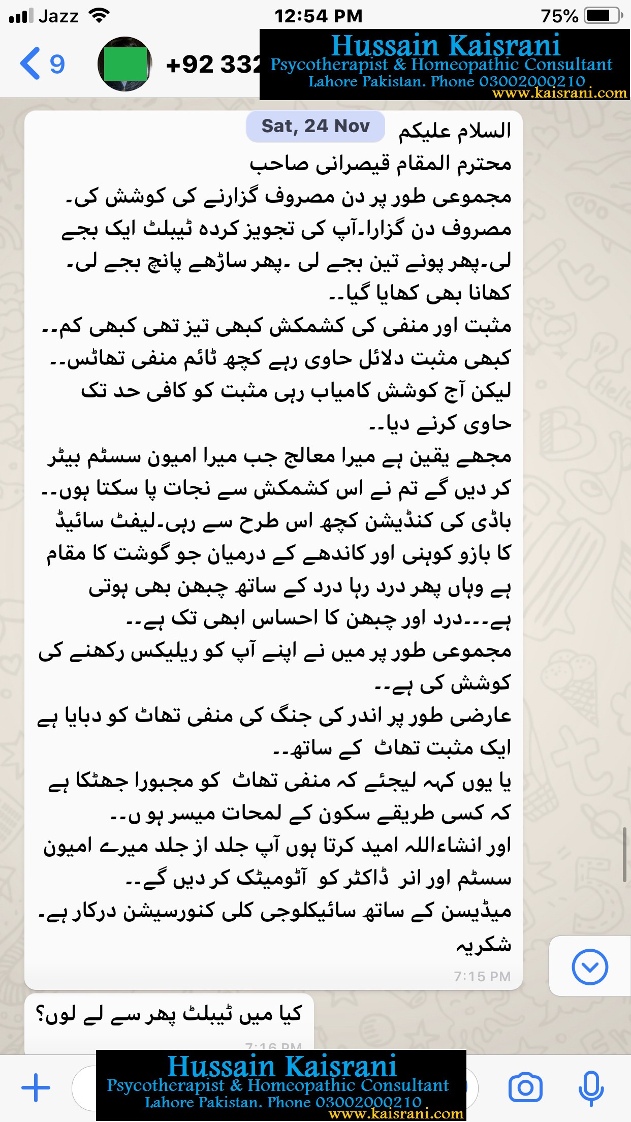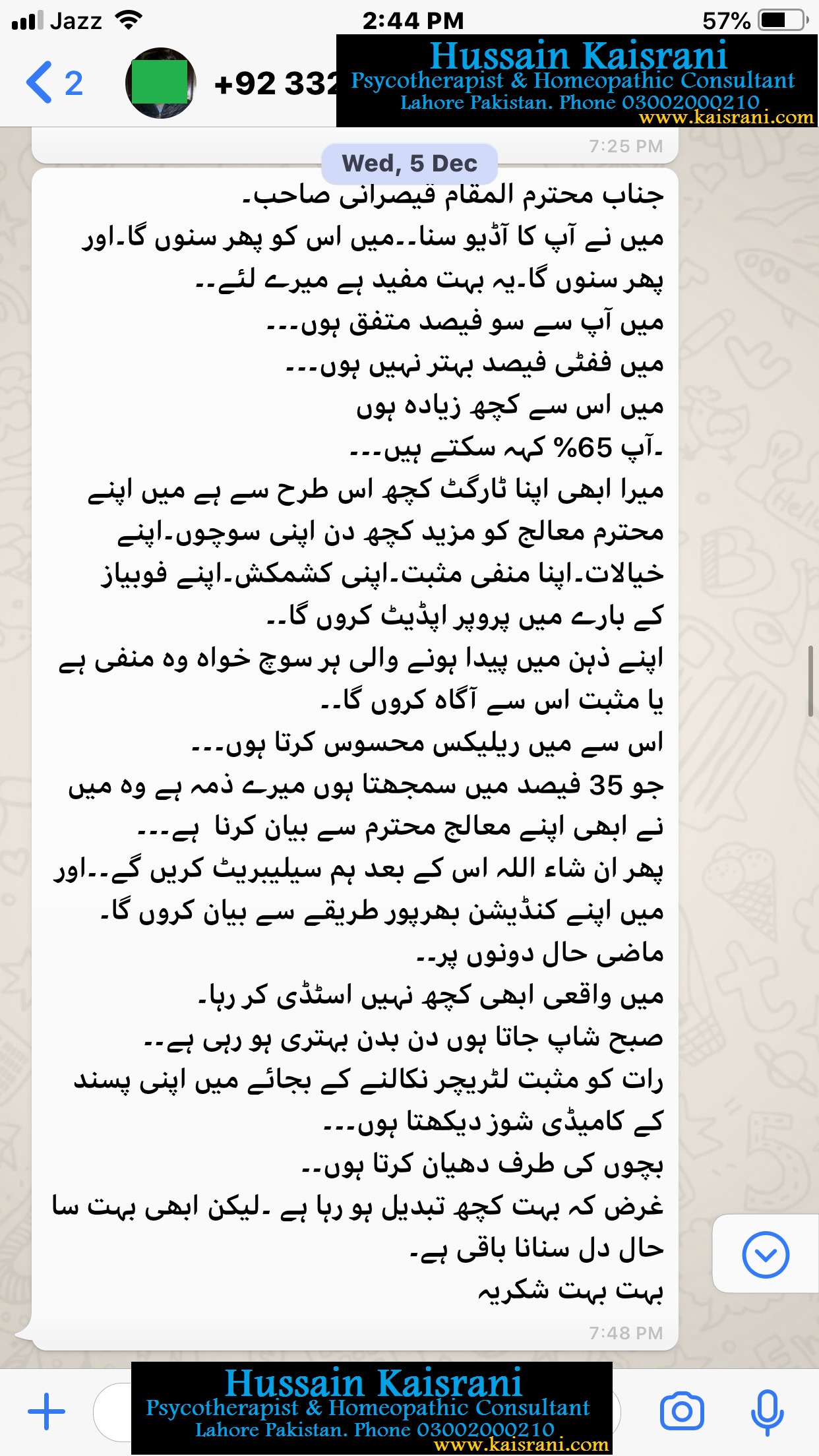 اللہ تعالی کا لاکھ لاکھ شکر گزار ہوں اور اپنے معالج کا شکریہ ادا کرتا ہوں جن کی بہت توجہ اور مسلسل آن لائن ٹریٹمنٹ اور گائیڈنس کی وجہ سے میں واپس اپنی اصل زندگی کی طرف آنے میں کامیاب ہو چکا ہوں۔۔ اپنے کاروبار کو مکمل اور بہتر انداز سے چلانا شروع کر دیا ہے۔ گھریلو معاملات بھی بہتر انداز سے ڈیل کرنے لگ گیا ہوں۔ اور حالات بہتر سے بہترین کی طرف جا رہے ہیں۔۔۔