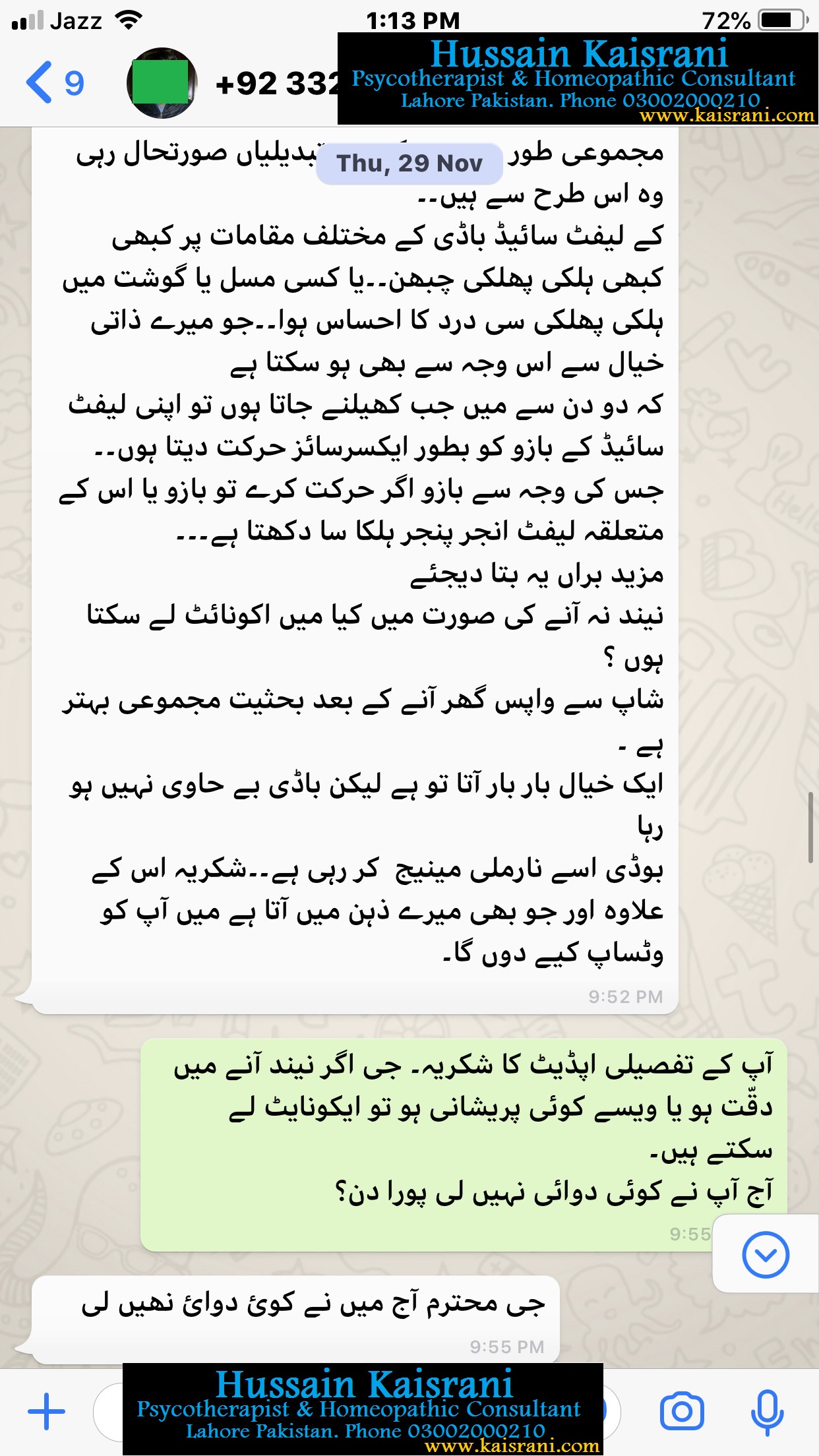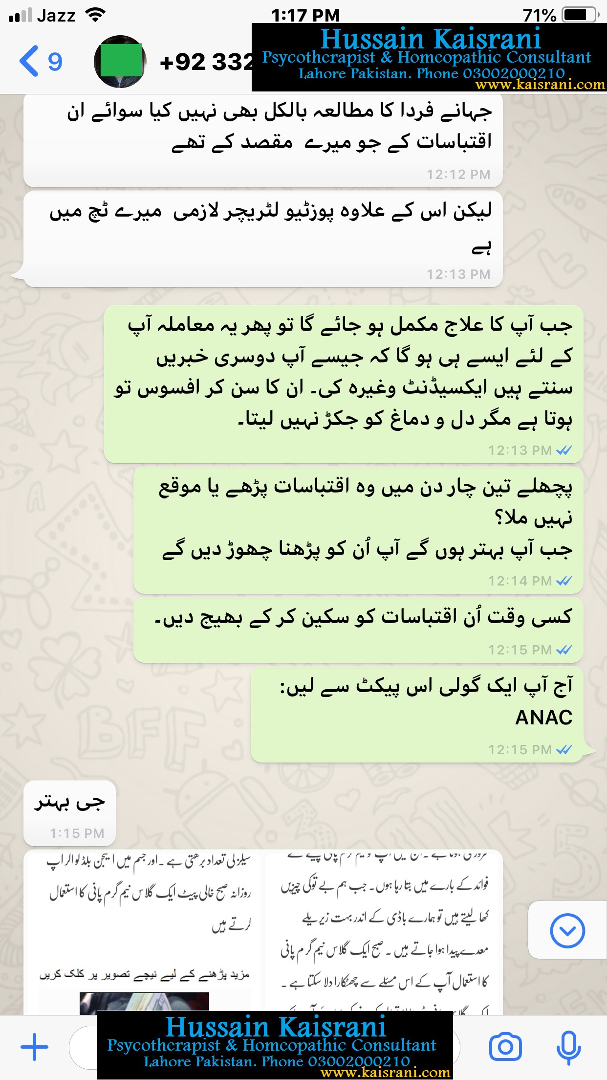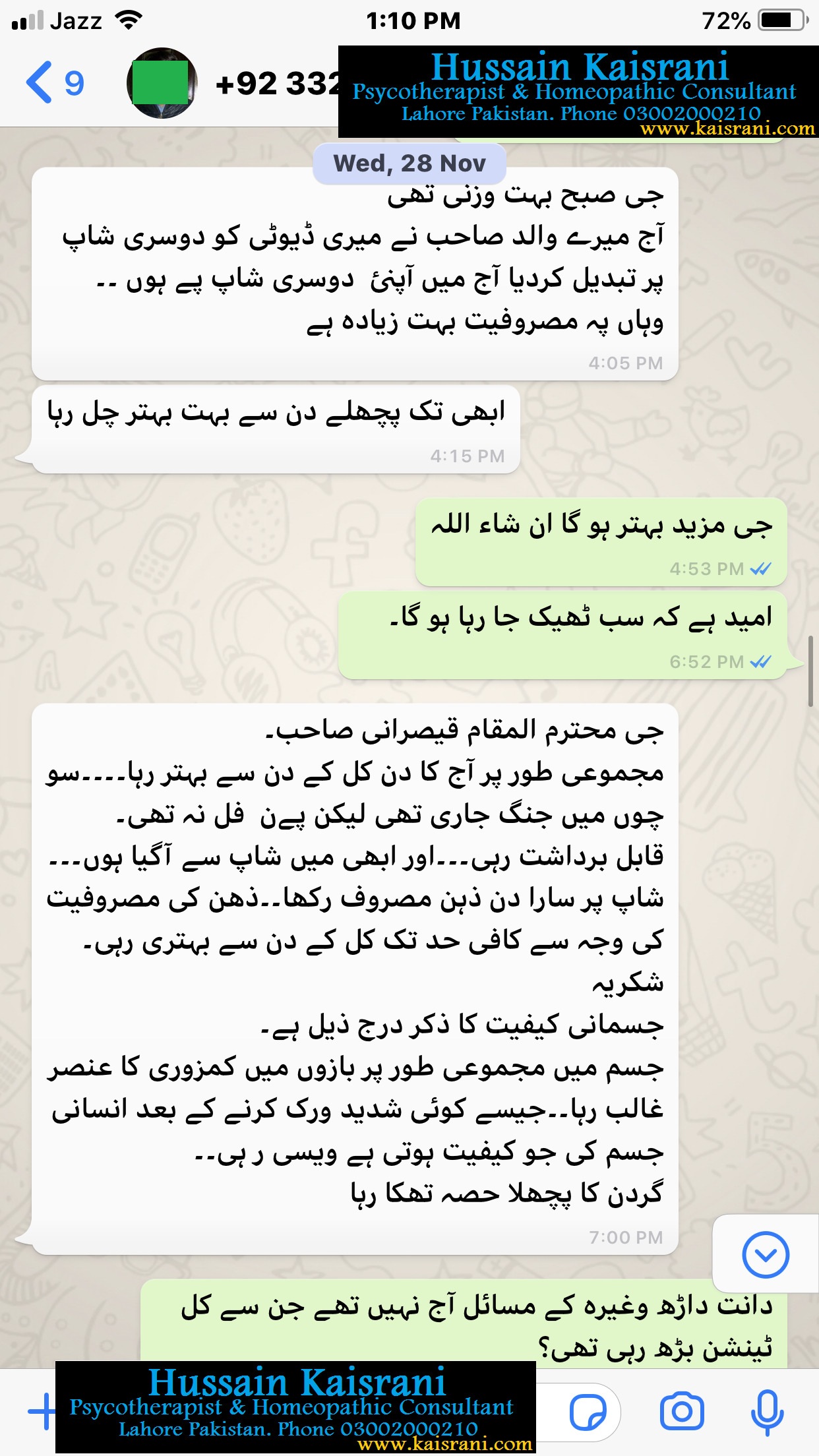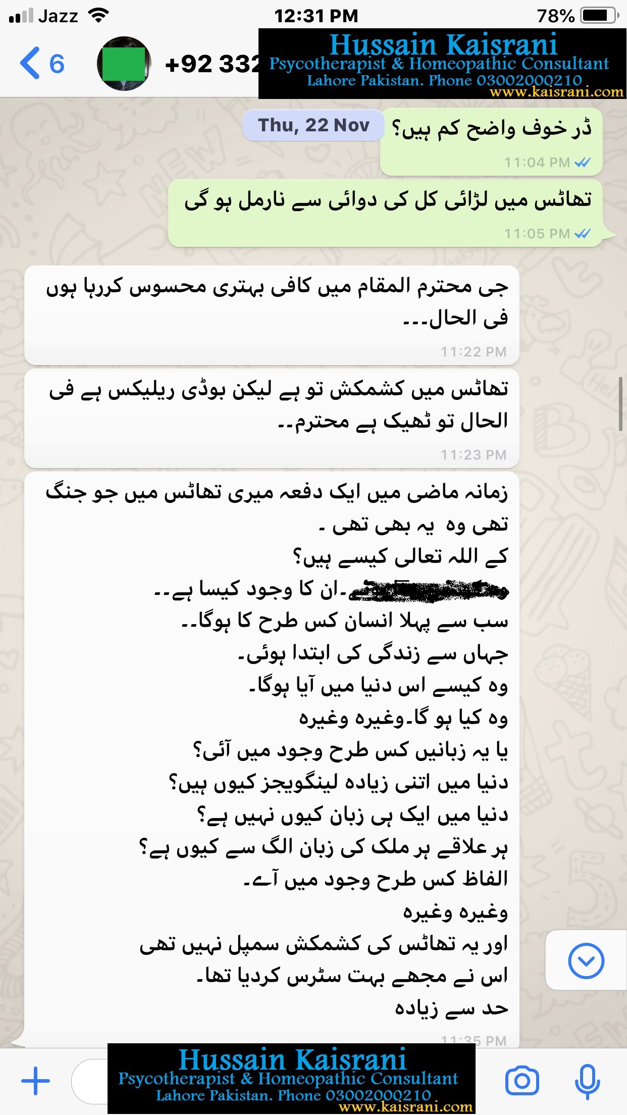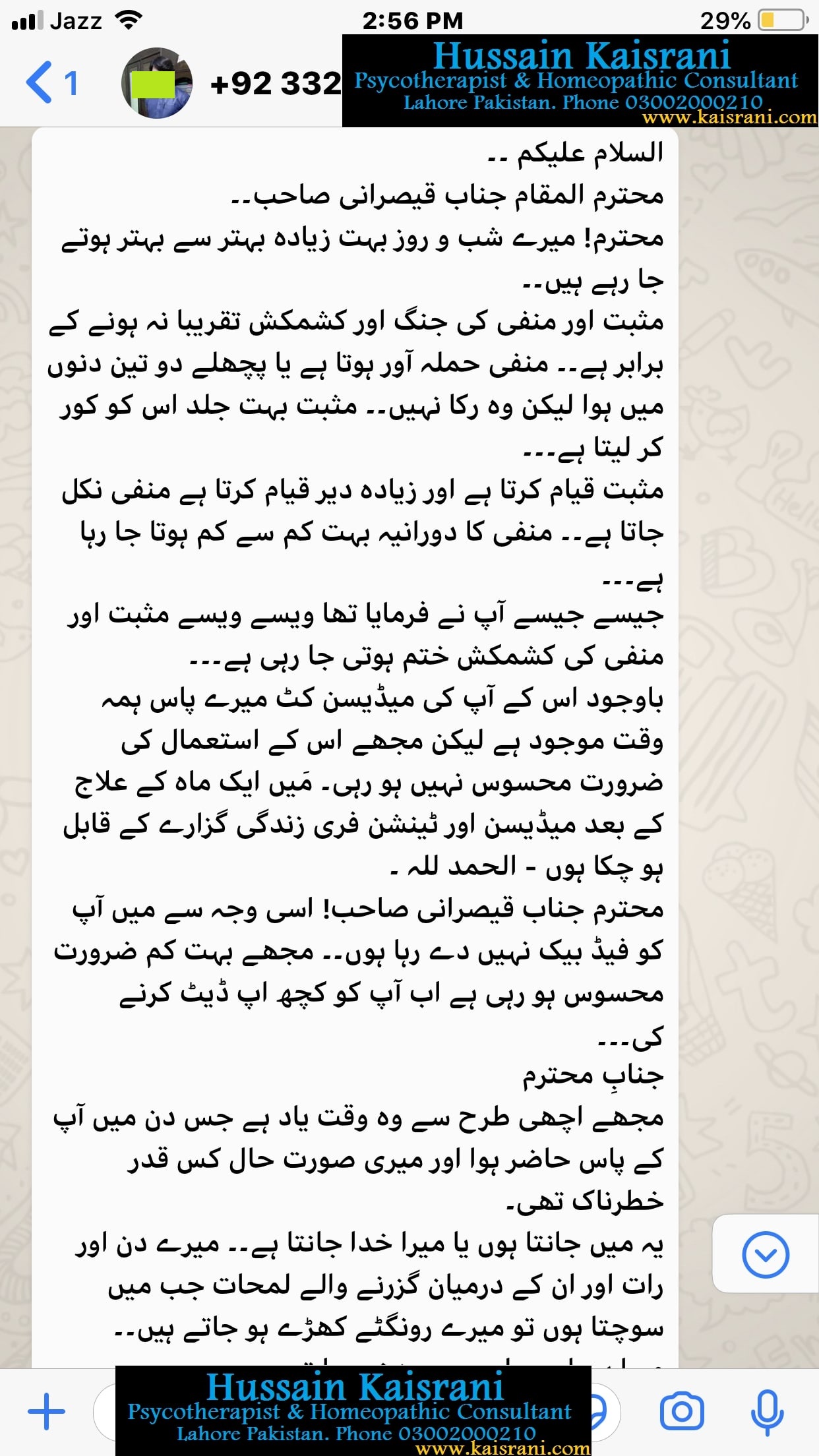 اللہ تعالی کا لاکھ لاکھ شکر گزار ہوں اور اپنے معالج کا شکریہ ادا کرتا ہوں جن کی بہت توجہ اور مسلسل آن لائن ٹریٹمنٹ اور گائیڈنس کی وجہ سے میں واپس اپنی اصل زندگی کی طرف آنے میں کامیاب ہو چکا ہوں۔۔ اپنے کاروبار کو مکمل اور بہتر انداز سے چلانا شروع کر دیا ہے۔ گھریلو معاملات بھی بہتر انداز سے ڈیل کرنے لگ گیا ہوں۔ اور حالات بہتر سے بہترین کی طرف جا رہے ہیں۔۔۔