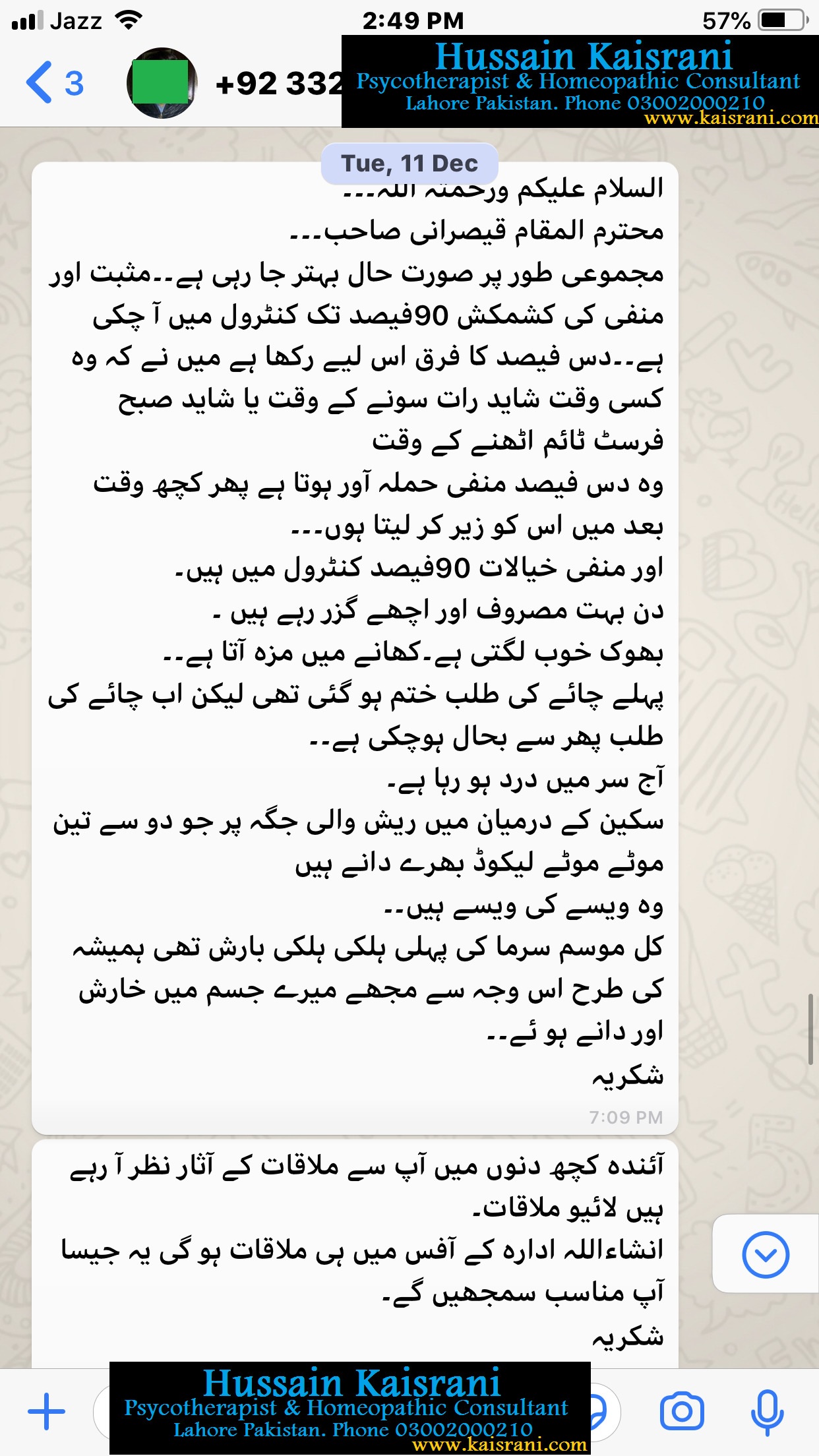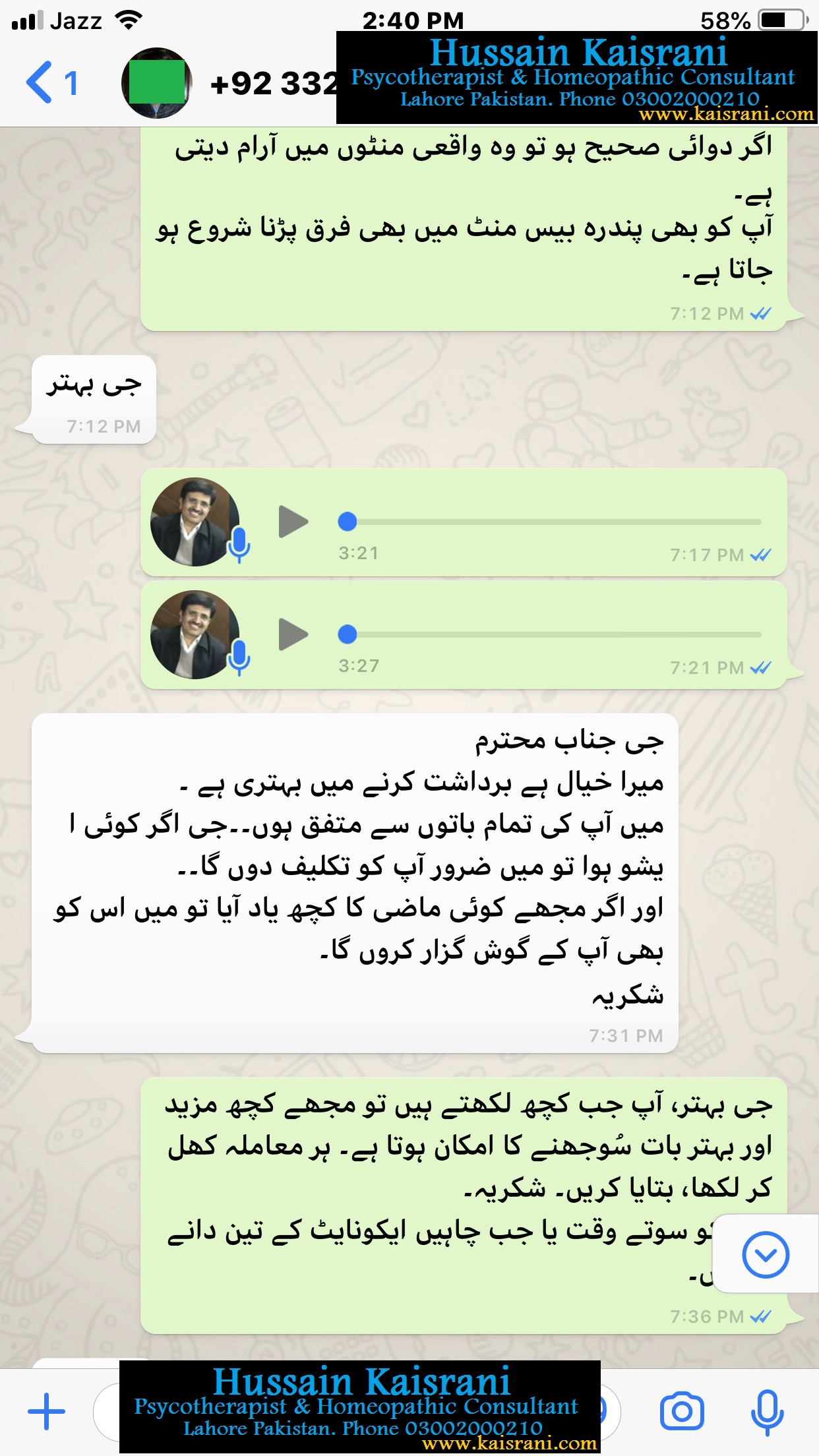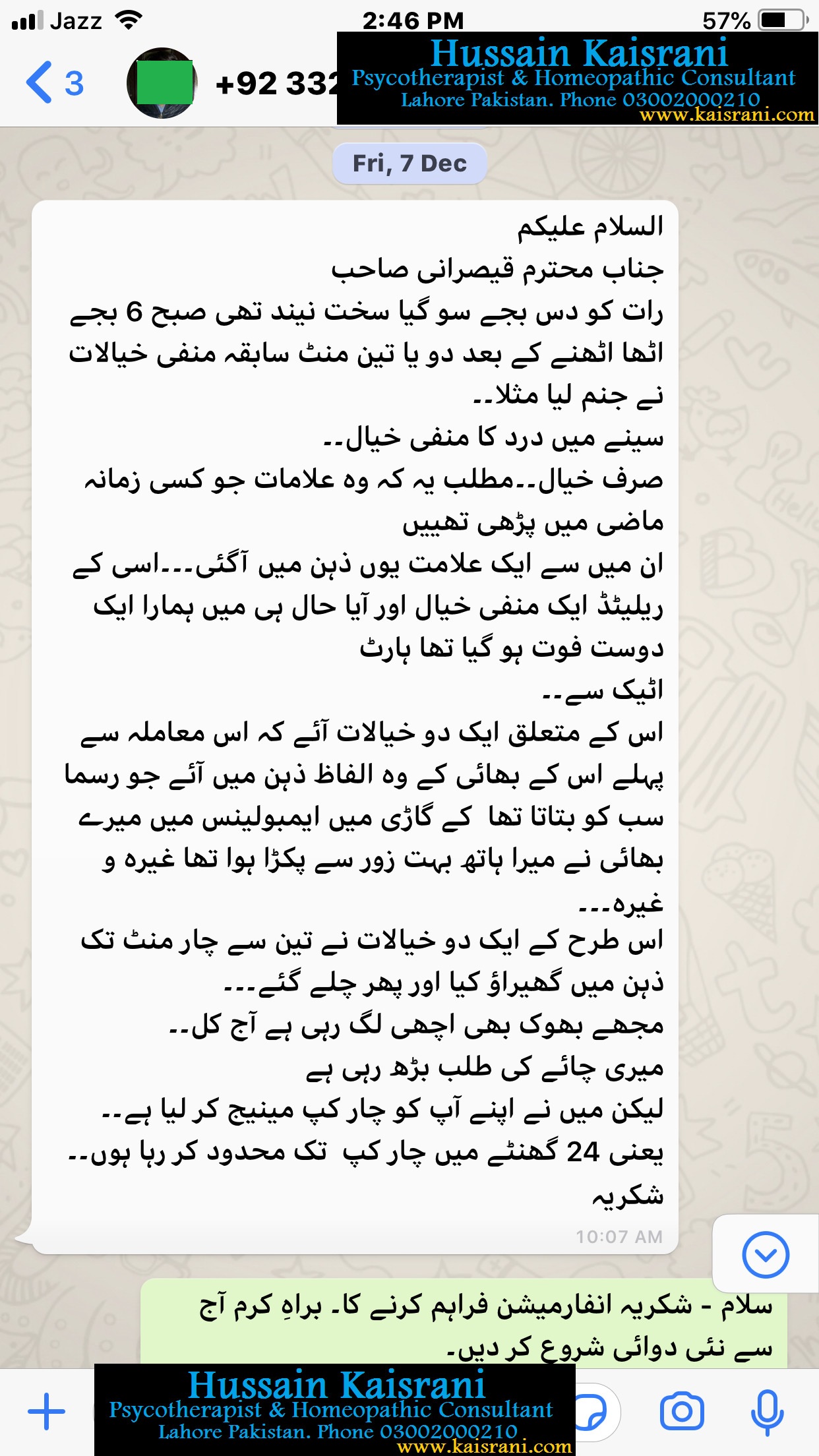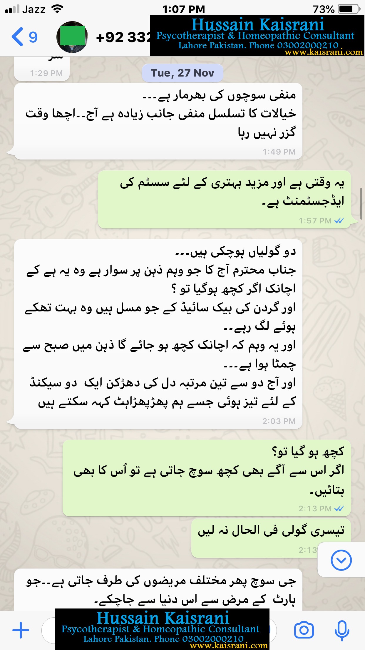 اللہ تعالی کا لاکھ لاکھ شکر گزار ہوں اور اپنے معالج کا شکریہ ادا کرتا ہوں جن کی بہت توجہ اور مسلسل آن لائن ٹریٹمنٹ اور گائیڈنس کی وجہ سے میں واپس اپنی اصل زندگی کی طرف آنے میں کامیاب ہو چکا ہوں۔۔ اپنے کاروبار کو مکمل اور بہتر انداز سے چلانا شروع کر دیا ہے۔ گھریلو معاملات بھی بہتر انداز سے ڈیل کرنے لگ گیا ہوں۔ اور حالات بہتر سے بہترین کی طرف جا رہے ہیں۔۔۔