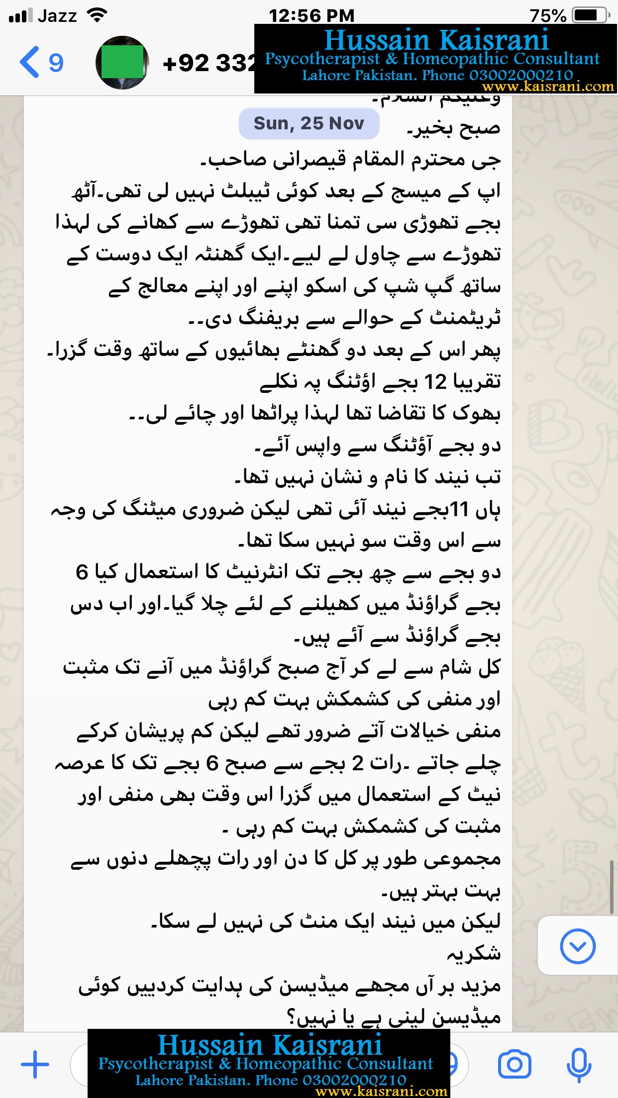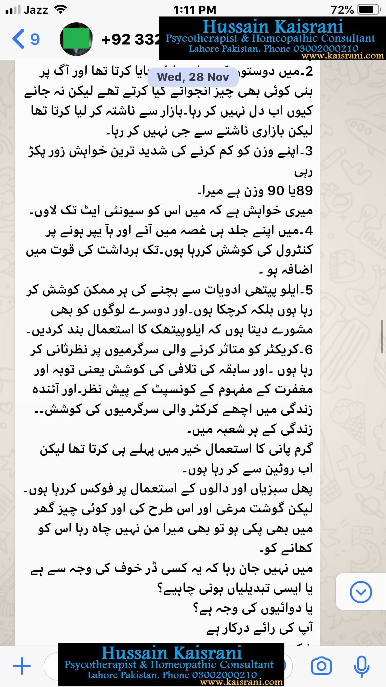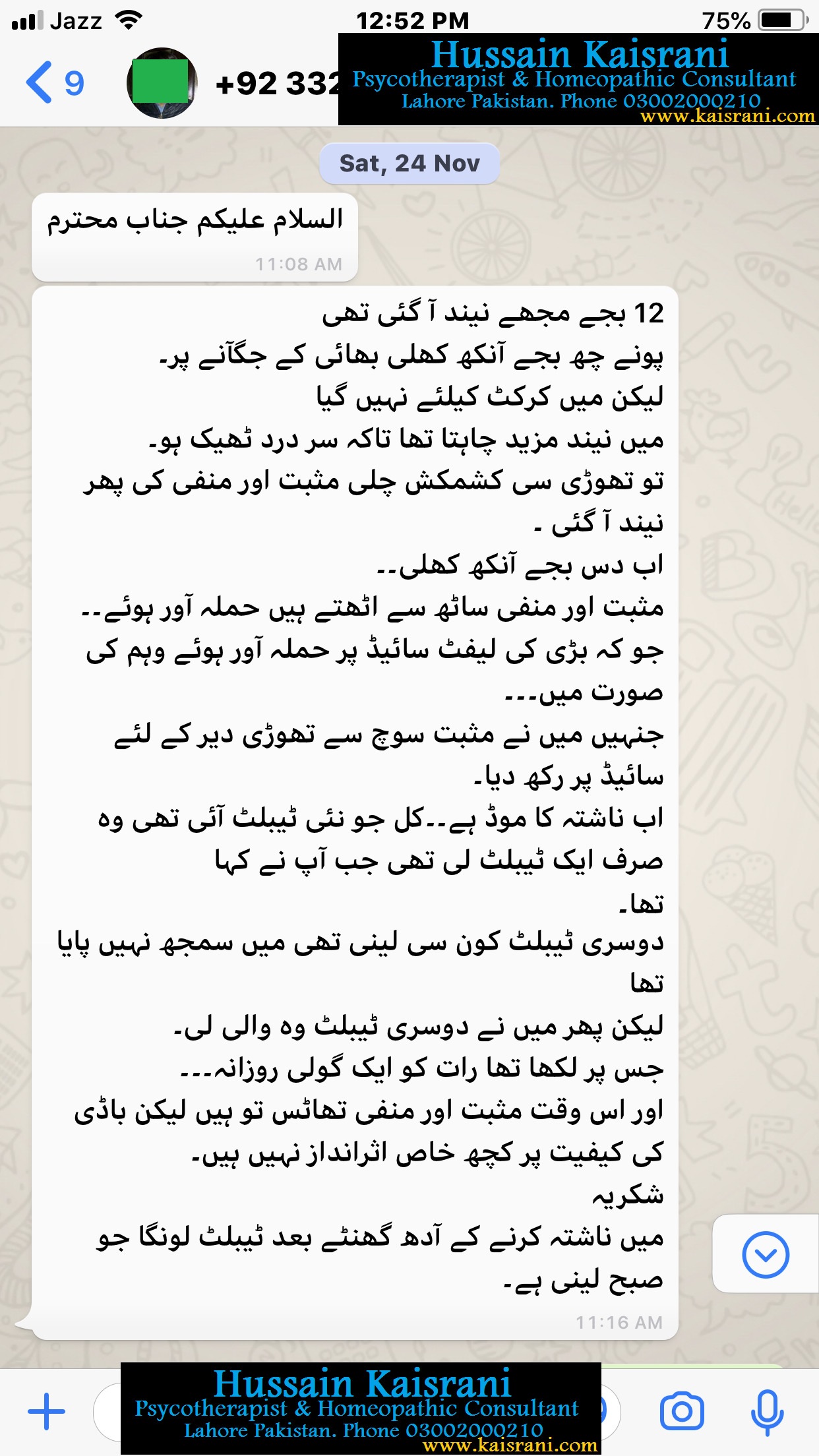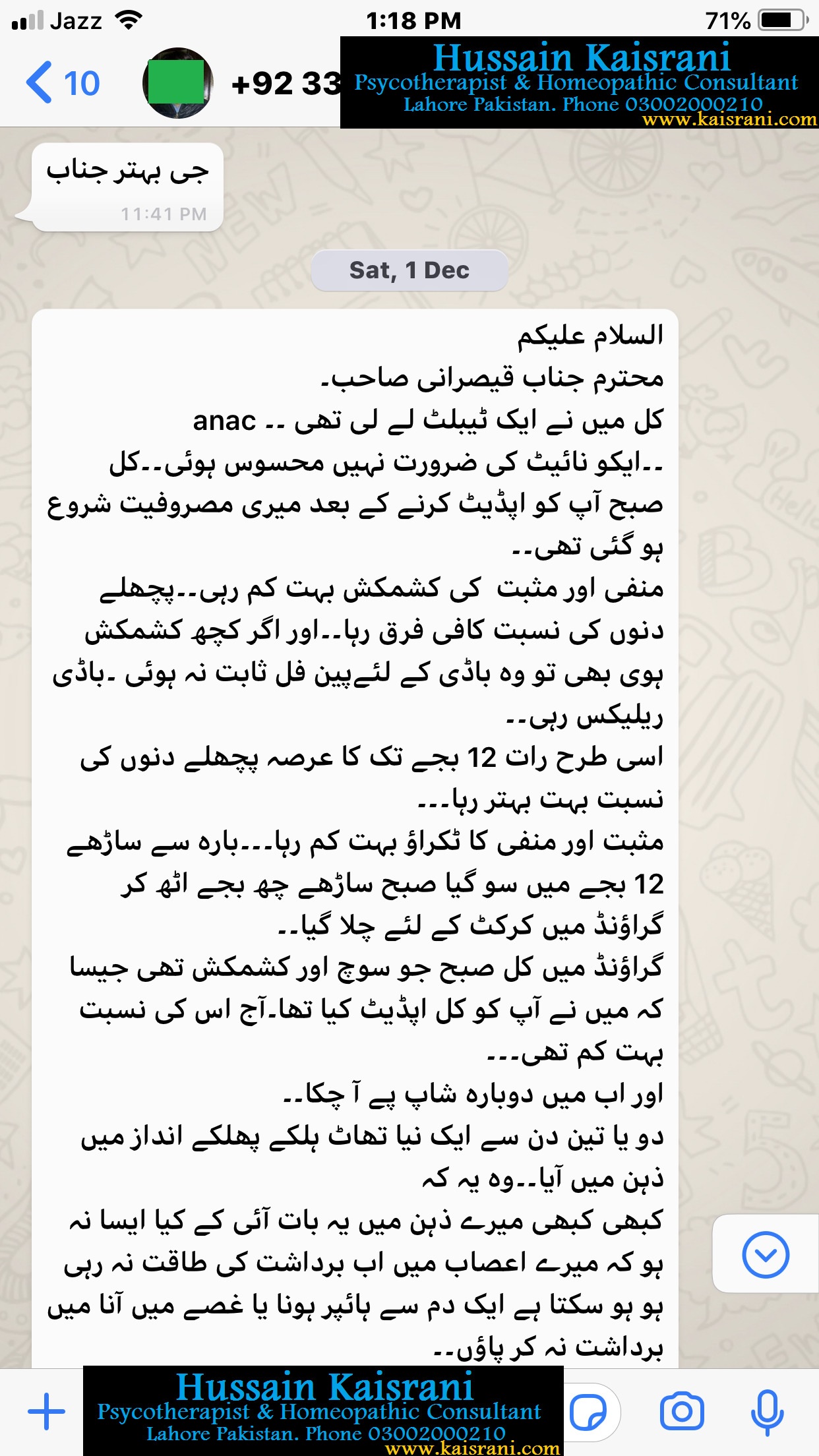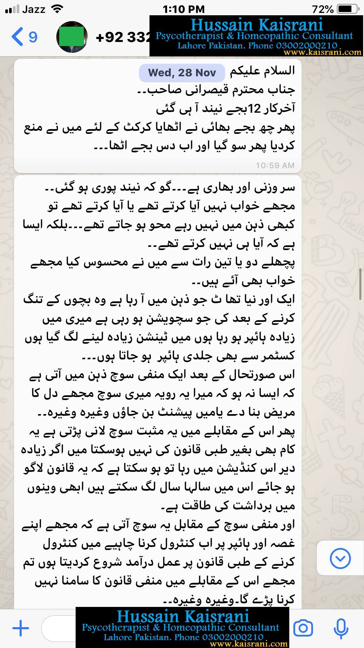 اللہ تعالی کا لاکھ لاکھ شکر گزار ہوں اور اپنے معالج کا شکریہ ادا کرتا ہوں جن کی بہت توجہ اور مسلسل آن لائن ٹریٹمنٹ اور گائیڈنس کی وجہ سے میں واپس اپنی اصل زندگی کی طرف آنے میں کامیاب ہو چکا ہوں۔۔ اپنے کاروبار کو مکمل اور بہتر انداز سے چلانا شروع کر دیا ہے۔ گھریلو معاملات بھی بہتر انداز سے ڈیل کرنے لگ گیا ہوں۔ اور حالات بہتر سے بہترین کی طرف جا رہے ہیں۔۔۔