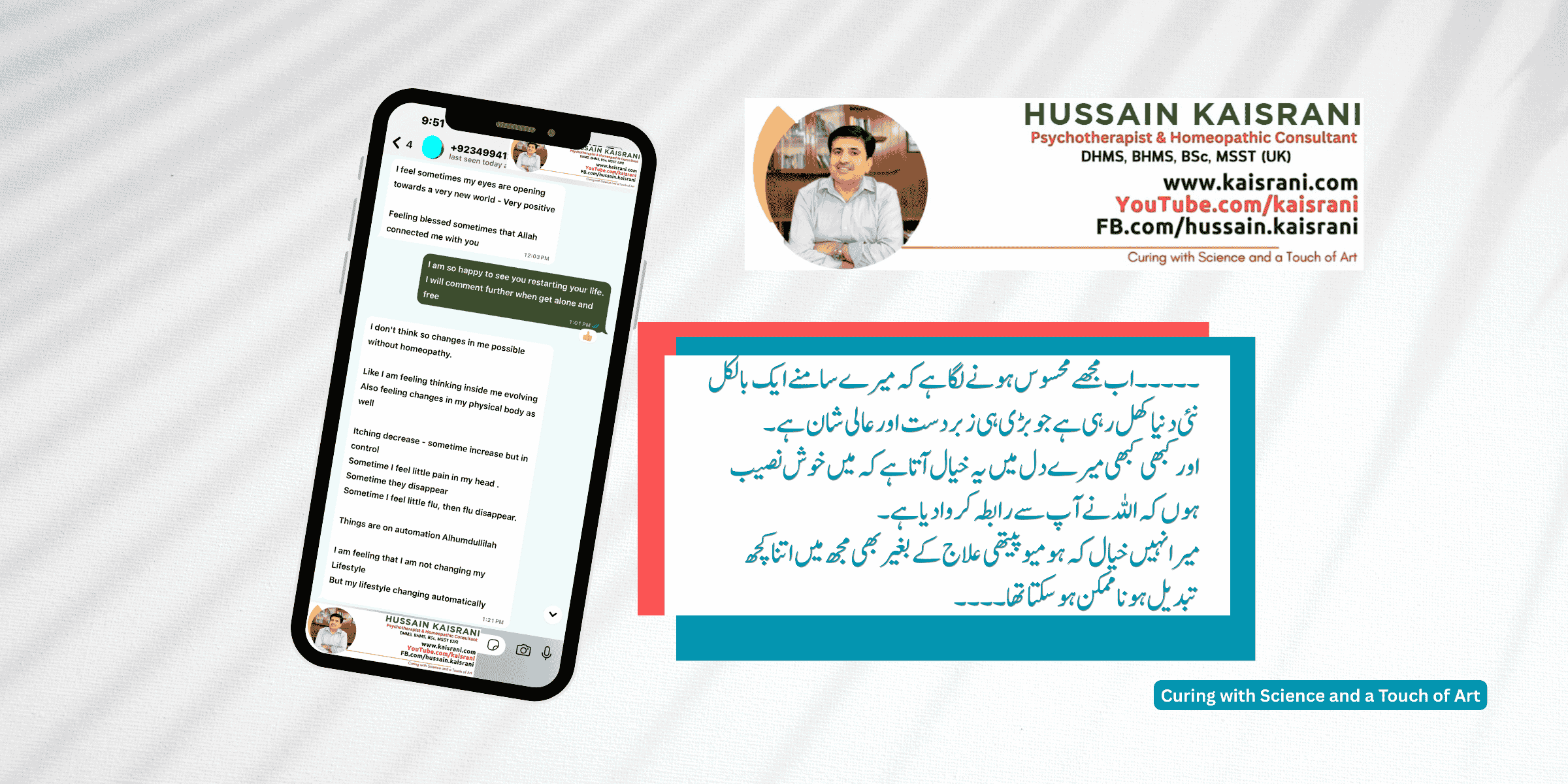 ۔۔۔۔۔ اب مجھے محسوس ہونے لگا ہے کہ میرے سامنے ایک بالکل نئی دنیا کھل رہی ہے جو بڑی ہی زبردست اور عالی شان ہے۔ اور کبھی کبھی میرے دل میں یہ خیال آتا ہے کہ میں خوش نصیب ہوں کہ اللہ نے آپ سے رابطہ کروا دیا ہے۔ میرا نہیں خیال کہ آپ کے ہومیوپیتھی علاج کے بغیر بھی مجھ میں اتنا کچھ تبدیل ہونا ممکن ہو سکتا تھا ۔۔۔۔