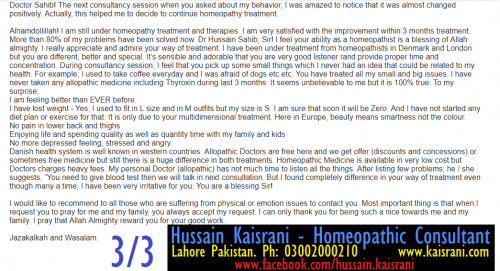 Alhamdollillah! I am still under homeopathy treatment and therapies. I am very satisfied with the improvement within 3 months treatment. More than 80% of my problems have been solved now. Dr Hussain Sahib, Sir! I feel your ability as a homeopathist is a blessing of Allah Almighty. I really appreciate and admire your way of treatment. I have been under treatment from homeopathists in Denmark and London but you are different, better and special. It’s sensible and adorable that you are very good listener rand provide proper time and concentration. During consultancy session, I feel that you pick up some small things which I never had an idea that could be related to my health. For example; I used to take coffee everyday and I was afraid of dogs etc etc. You have treated all my small and big issues. I have never taken any allopathic medicine including Thyroxine during last 3 months. It seems unbelievable to me but it is 100% true. To my surprise;