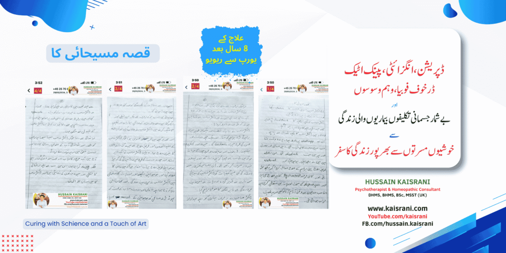 آہستہ آہستہ میری اندر کی کمزوریوں، بیماریوں، ڈر، خوف، وہم وسوسے، منفی سوچیں اور انگزائٹی کے مسائل میں کمی ہونا شروع ہوئی۔ میری شخصیت میں تہہ در تہہ محرومیاں اور اندیشے تھے اور یہ جذبات میں نے سب سے چھپا رکھے تھے۔ اعتماد کی شدید کمی، اور احساس کمتری کے جذبات کو ڈاکٹر صاحب نے بہت محنت اوردوا علاج سے ٹھیک کیا۔ اور مجھے اذیت بھری زندگی سے باہر نکلنے میں بھرپور مدد دی۔