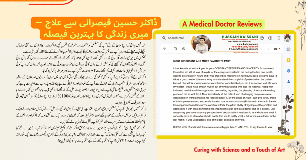 I had been struggling with digestive issues when I reached out to Hussain Kaisrani, a Homeopathic Psychologist based in Lahore.