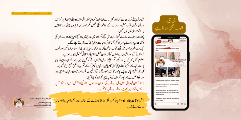 کئی سال پہلے کی بات ہے کہ اِن محترمہ نے اپنا علاج کروایا تھا۔ما شاء اللہ وہ عالی شان ڈیزائنر