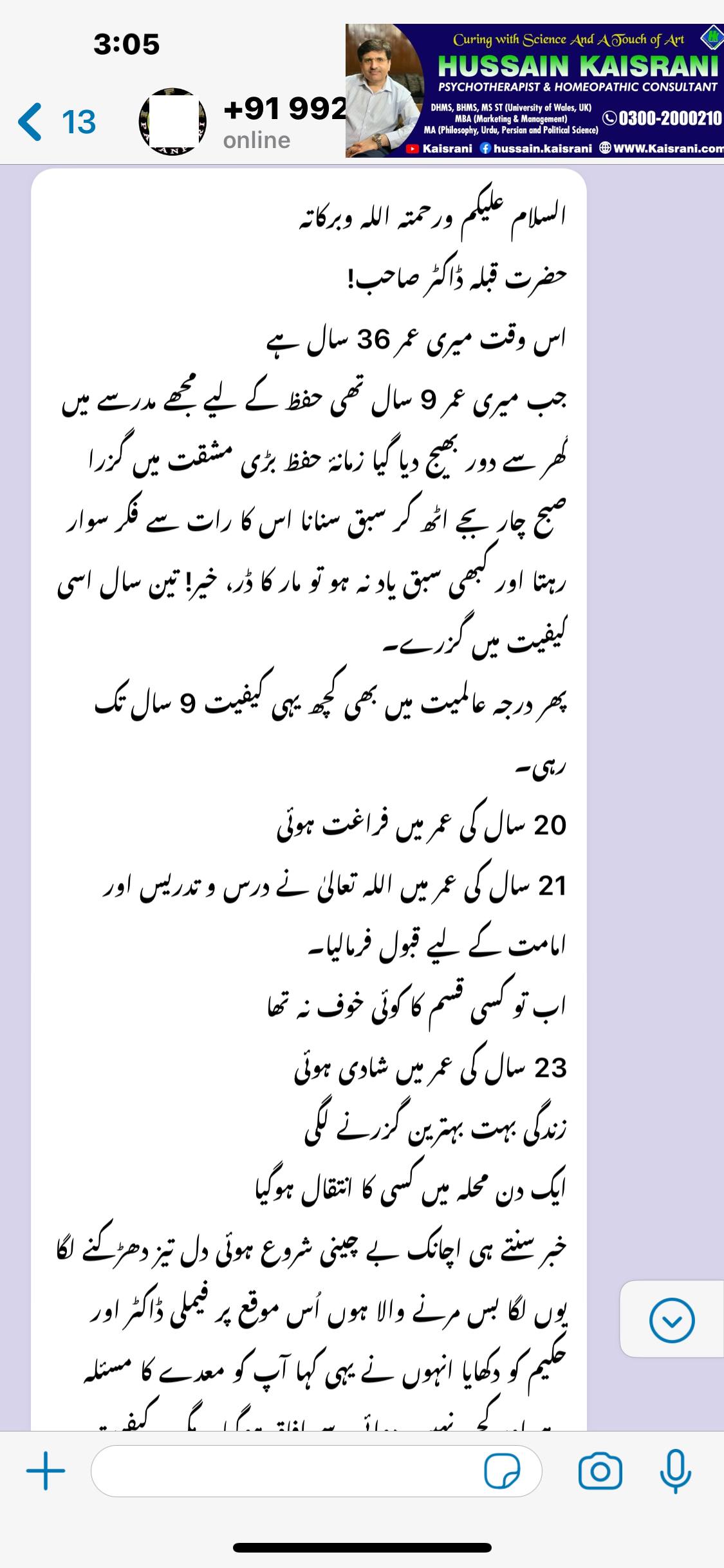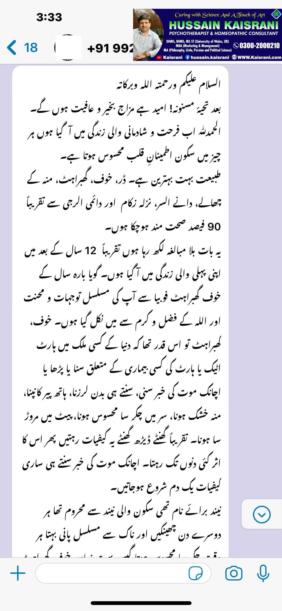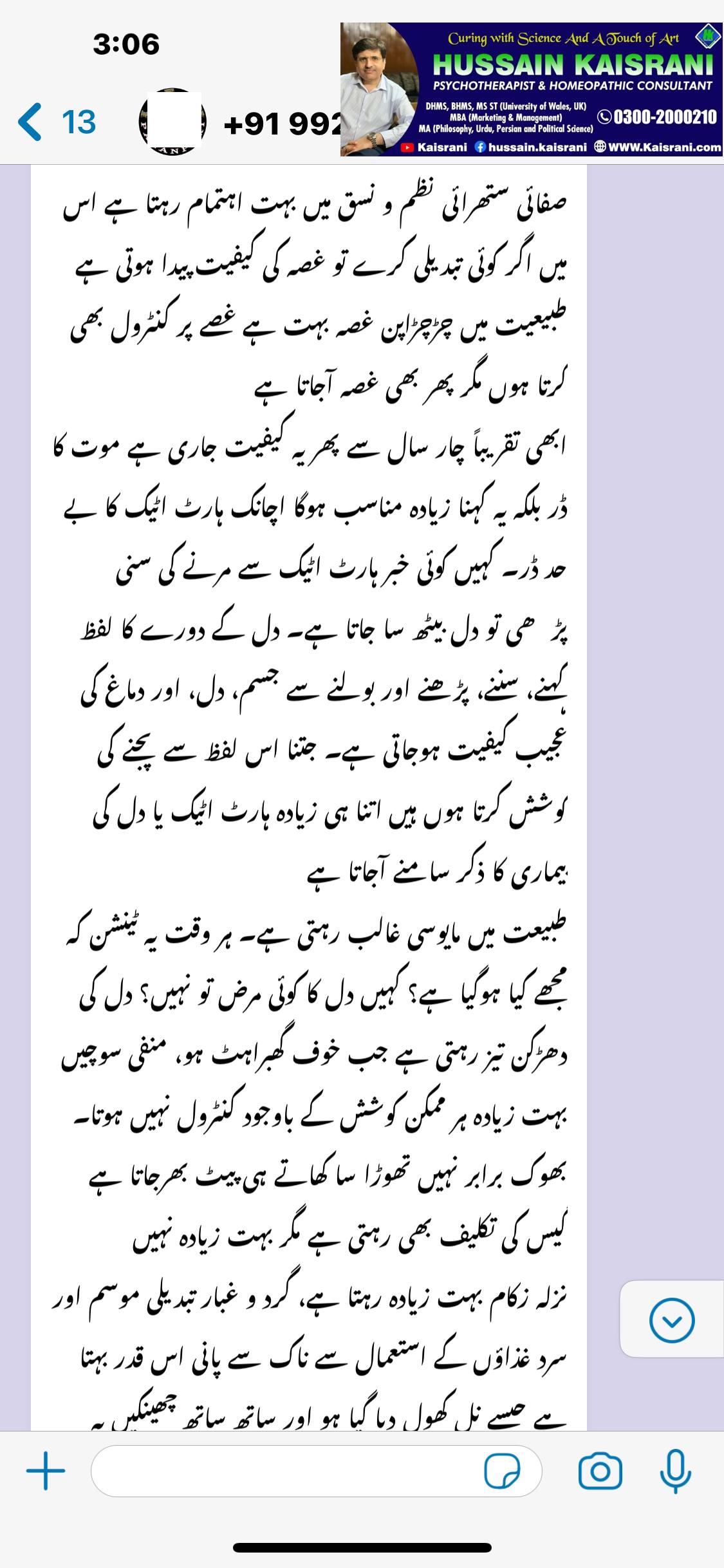 چند ماہ قبل علامہ صاحب نے واٹس ایپ پر رابطہ کیا۔ وہ فیس بک پر مختلف کیسز کا مطالعہ کر چکے تھے اور اپنے پیچیدہ مسائل کے بارے میں بات کر نا چاہتے تھے۔ علامہ صاحب کے مسائل پریشان کن تھے جس کی وجہ سے ان کی روزمرہ زندگی کے معمولات خاصے ڈسٹرب تھے۔ کئی طرح کے ڈر، خوف، فوبیاز، خاص طور پر موت بلکہ ہارٹ اٹیک کی وجہ سےموت کا خوف حواس پر دن رات طاری رہتا تھا۔ منتشر دماغ، منفی خیالات ، شدید سر درد، پرسکون نیند کی عدم موجودگی، منہ کے دانے چھالےالسر، گلے میں ریشہ کیرا گرنا، چھینکیں، فوڈ الرجی (Food Allergy)، تیزابیت، معدے کے مسائل ، ڈپریشن ، انگزائٹی، پینک اٹیک اور اس جیسے کئی مسائل نے انھیں گھیر رکھا تھا۔ ڈسٹ الرجی بہت زیادہ تھی۔ شدید بلکہ دائمی نزلہ زکام الرجی کوئی بھی کام خوش اسلوبی سے کرنے کی راہ میں رکاوٹ بنا رہتا تھا۔ بہت ساری ادویات زیرِ استعمال رہتی تھیں۔