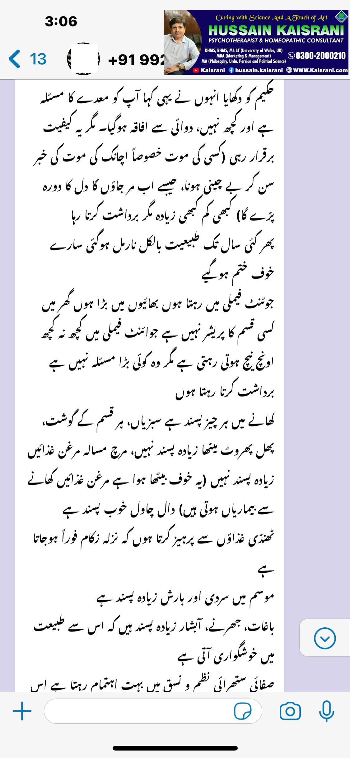 اگرچہ علامہ صاحب نے جو تفصیلات دیں ان کے مطابق ان کو میٹھا پسند نہیں تھا حالانکہ وہ شہد اور کھجور باقاعدگی سے استعمال کرتے تھے لیکن زیادہ میٹھا کھانے سے طبیعت خراب ہو جاتی تھی۔ تیزابیت بنتی تھی۔ اچانک ہارٹ اٹیک کا خوف شدید تھا۔ کوئی بھی کام جو اچانک ہوتا انھیں بہت ڈسٹرب کرتا تھا۔ خاص طور پر اچانک کسی کی موت کی اطلاع ملتے ہی شدید انگزائٹی ہونے لگتی تھی۔ اچانک کوئی مہمان آجائے تو گھبراہٹ شروع ہو جاتی تھی۔ اچانک پینک اٹیک ہوتا اور طبیعت خراب ہونے لگتی۔ باہر جانا ، واک کرنا پسند کرتے تھے۔ ہر وقت طبیعت میں ایک عجلت رہتی تھی جیسے کوئی ٹرین چھوٹ رہی ہے۔ اگر کل کسی پروگرام میں جانا ہے تو آج شام سے ہی بے چینی شروع ہو جاتی تھی۔ مسلسل یہی سوچتے رہتے تھےکہ کہیں لیٹ نہ ہو جاؤں۔ اسی پریشانی میں رات کو نیند نہیں آتی تھی۔ انزائٹی اتنی بڑھ جاتی تھی کہ بار بار پیشاب کی حاجت ہوتی تھی۔ اں حالات میں رجنٹم نائٹریکم وہ دوا تھی جس نے کیس کو نیا موڑ دیا۔