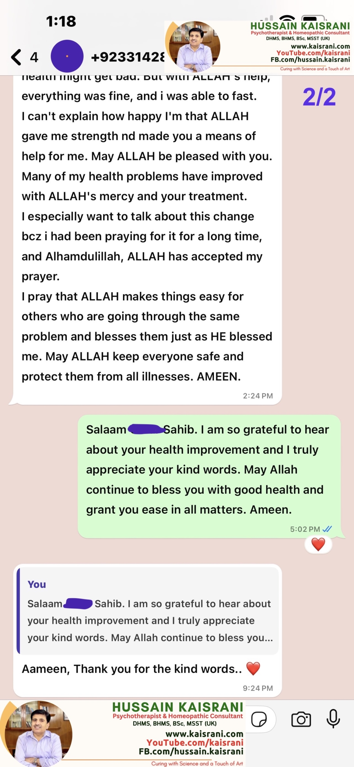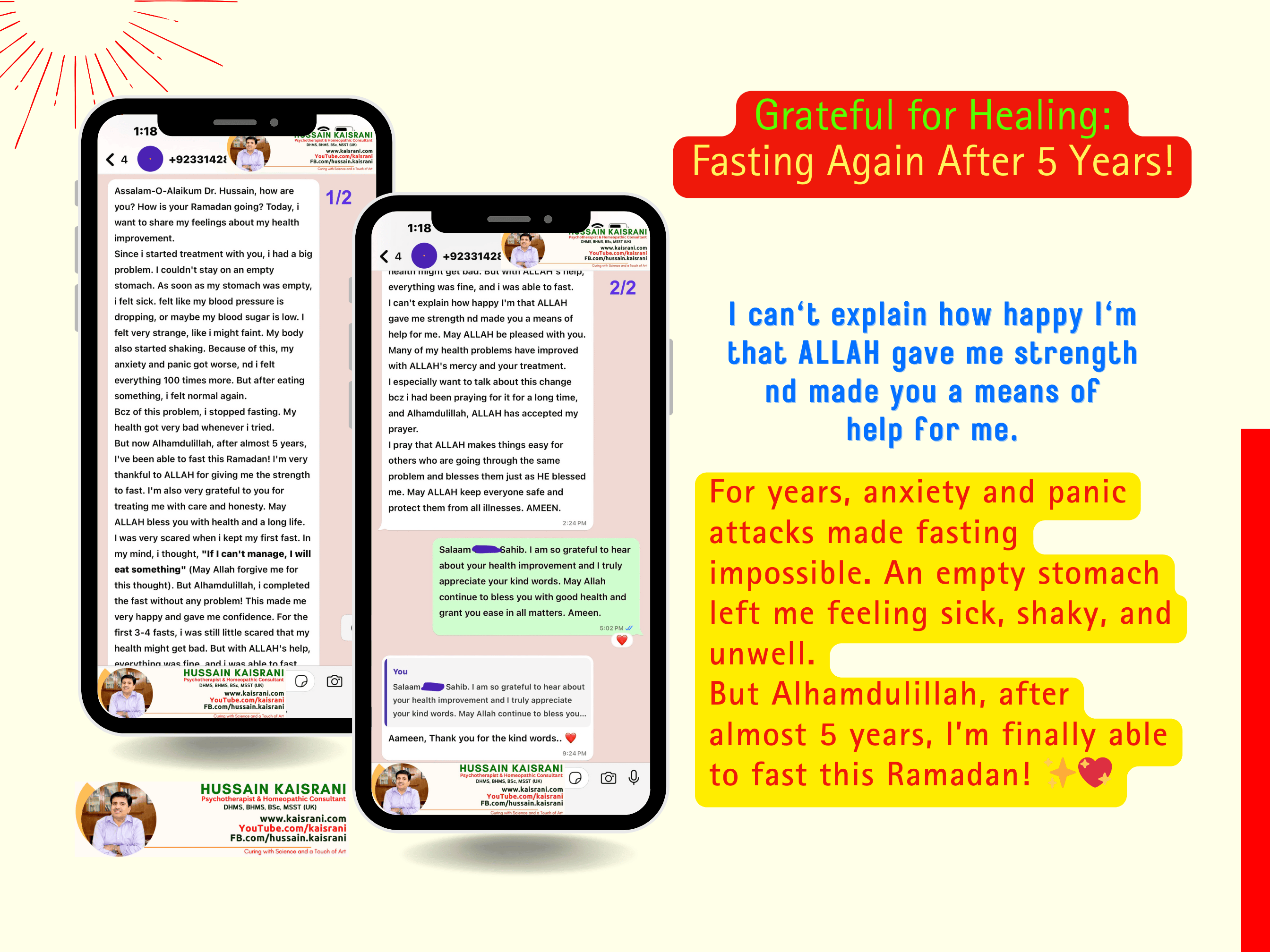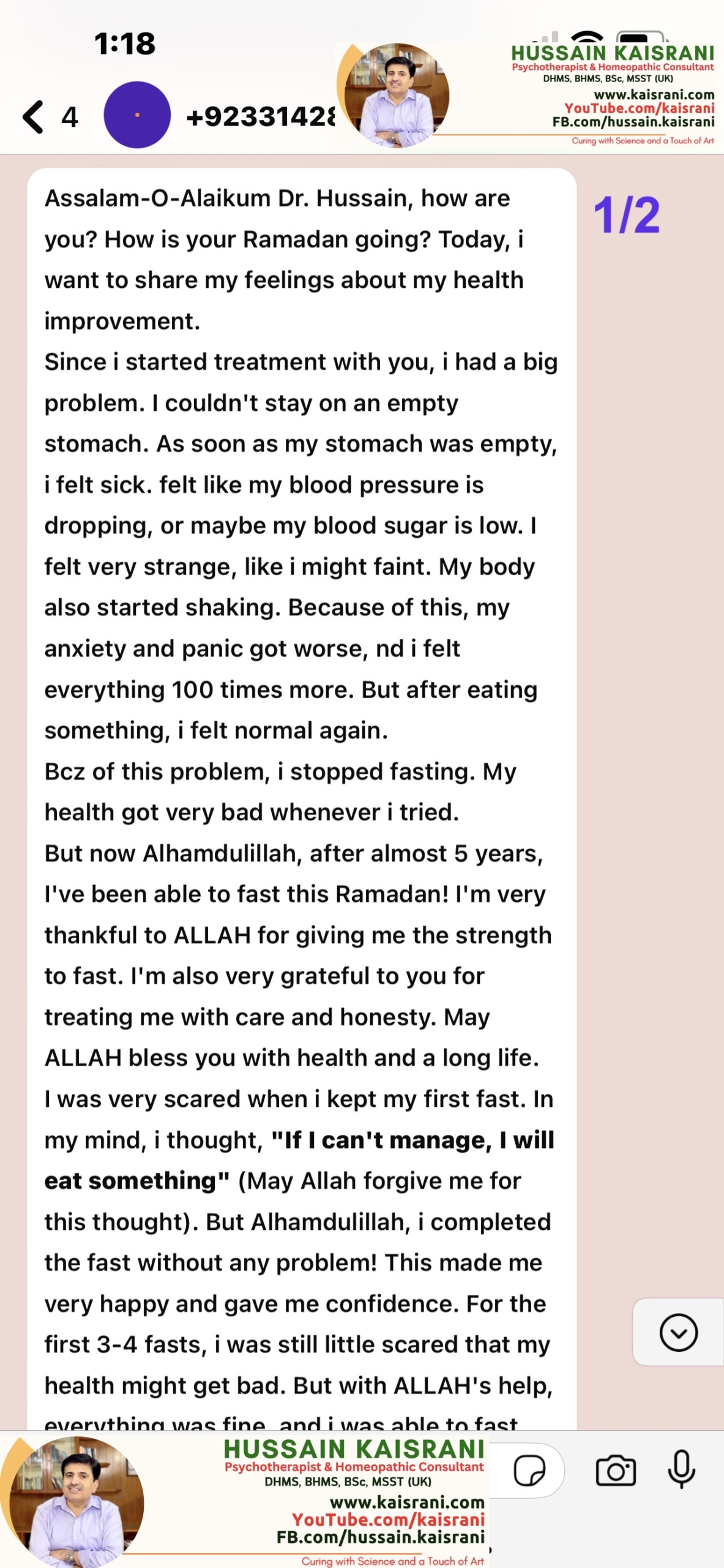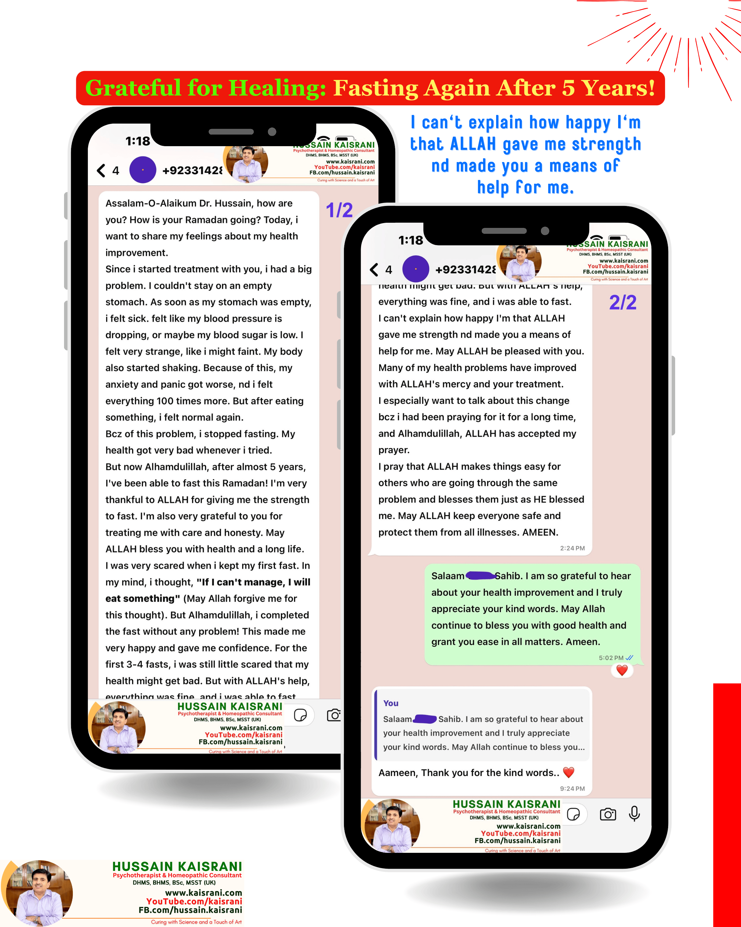 I cannot thank Allah enough for granting me the strength to fast again, and I am truly grateful to you, Dr. Hussain Kaisrani, for your care, dedication, and honesty in treating me. May Allah bless you with health, success, and a long life.