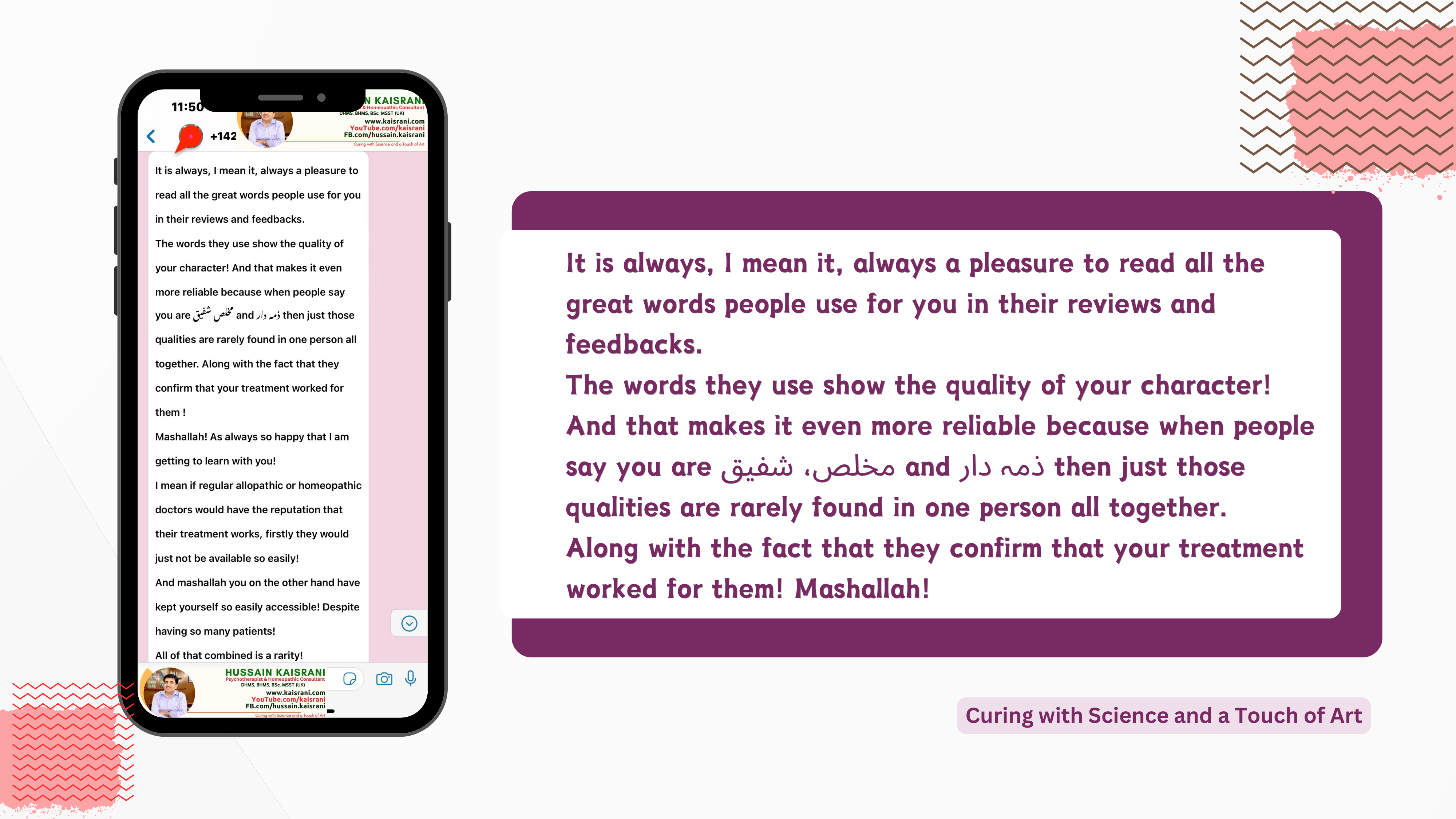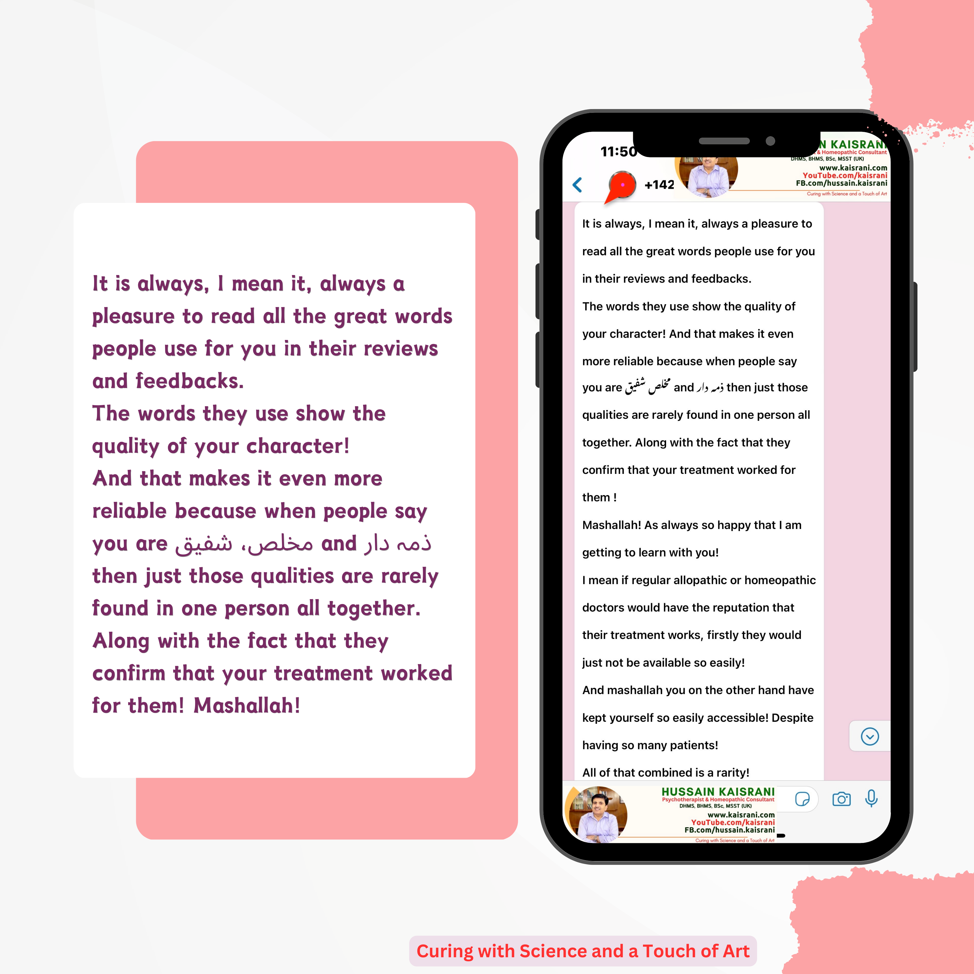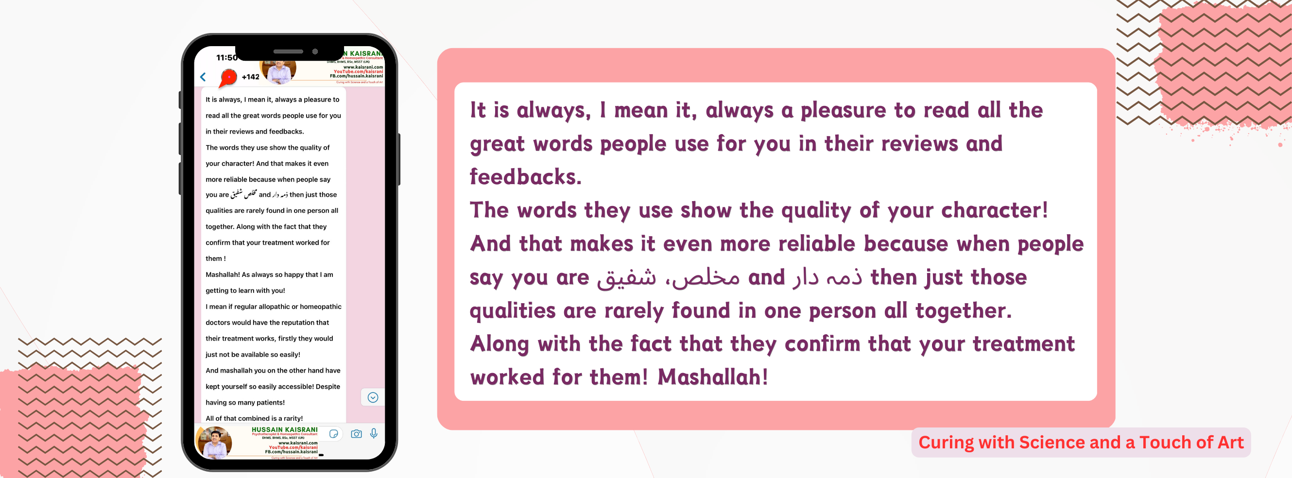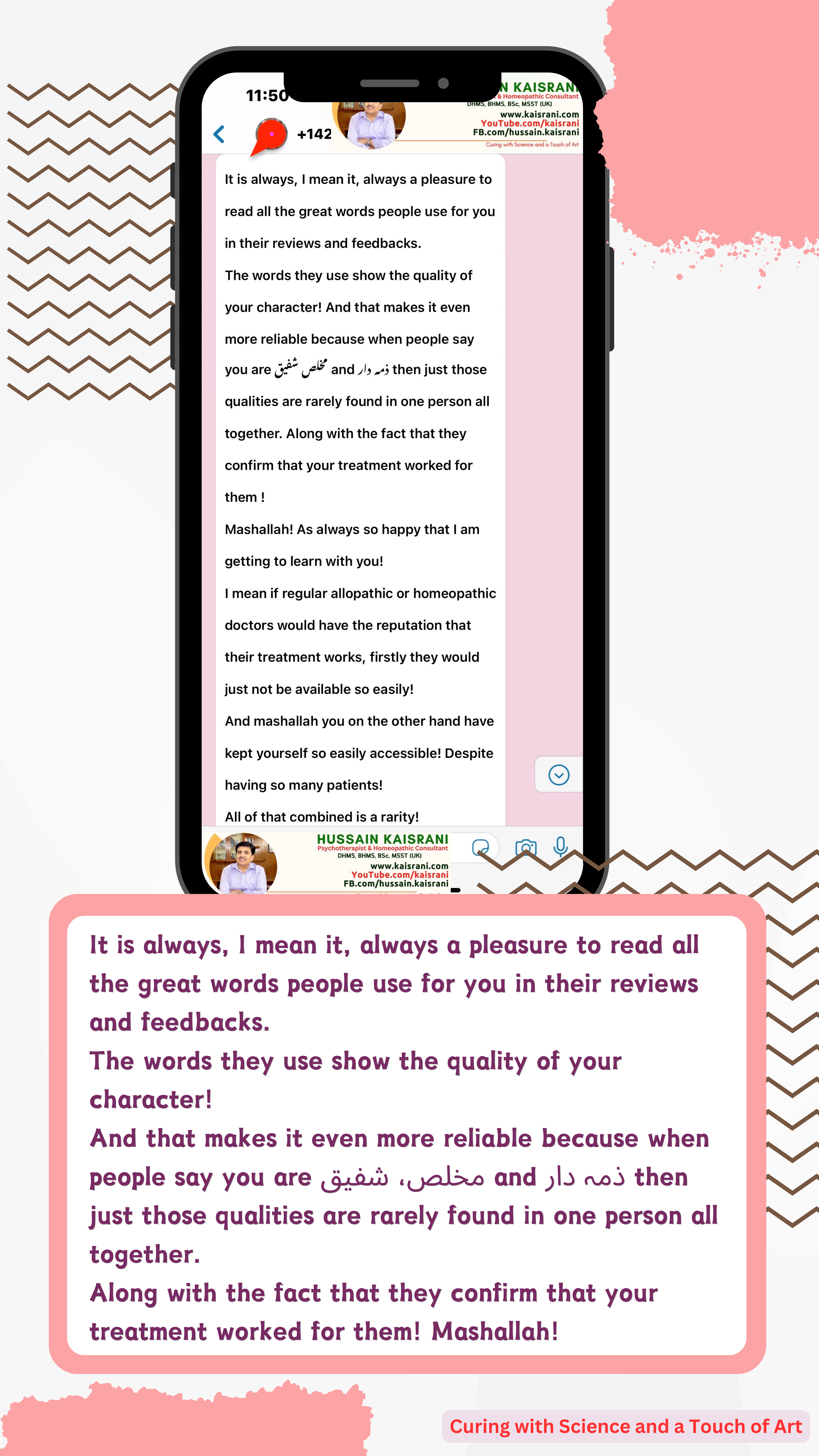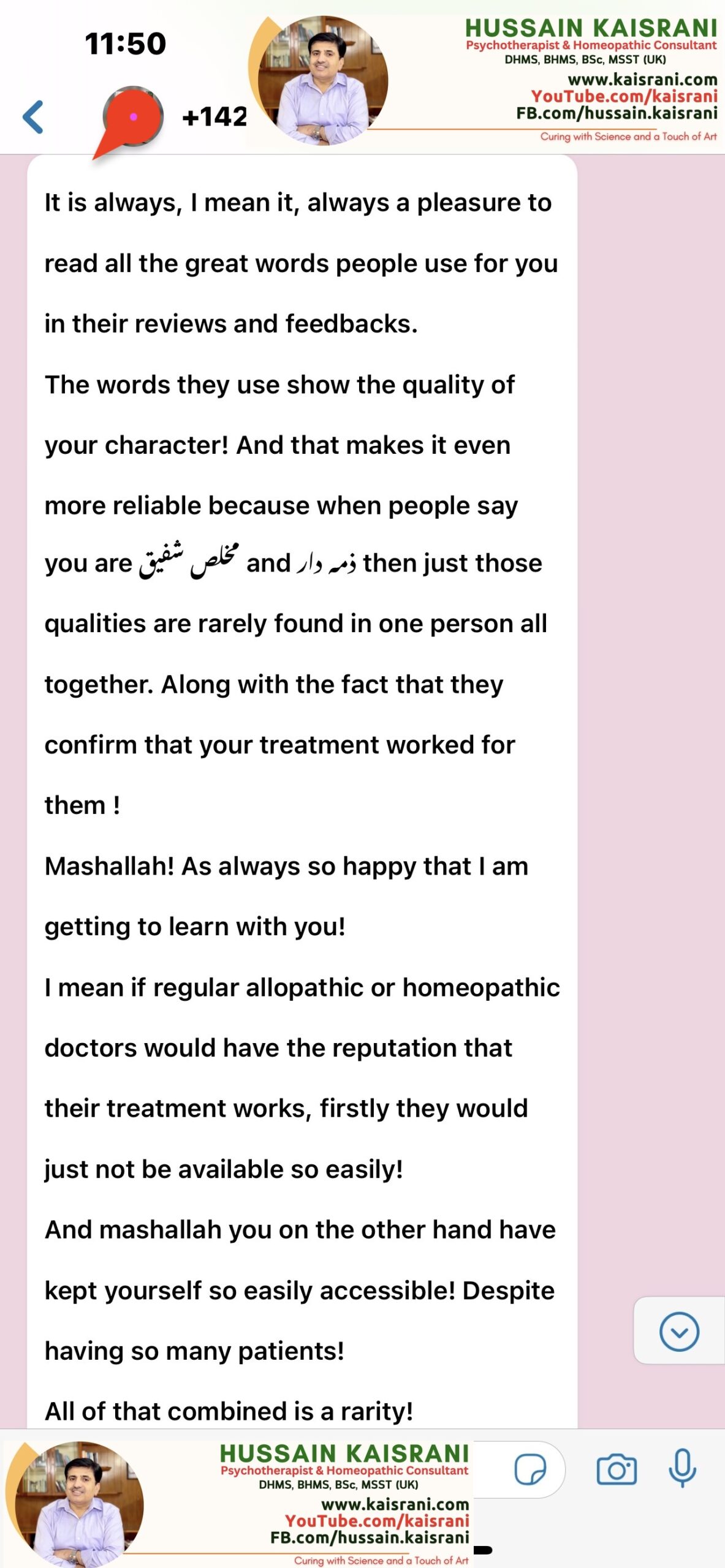 And that makes it even more reliable because when people say you are مخلص شفیق and ذمہ دار then just those qualities are rarely found in one person all together. Along with the fact that they confirm that your treatment worked for them ! Mashallah!