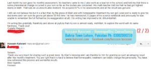 I still can not believe this but it is a fact that, by the grace of Allah and with homeopathic treatment my son got cured and is ready to give his mid-terms and I am sure he gonna get above 90 this time. He has memorized 25 pages of his science notebook and previously he was unable to remember the full first Kalima (no exaggeration at all). His writing has improved a lot, Alhumdulillah.