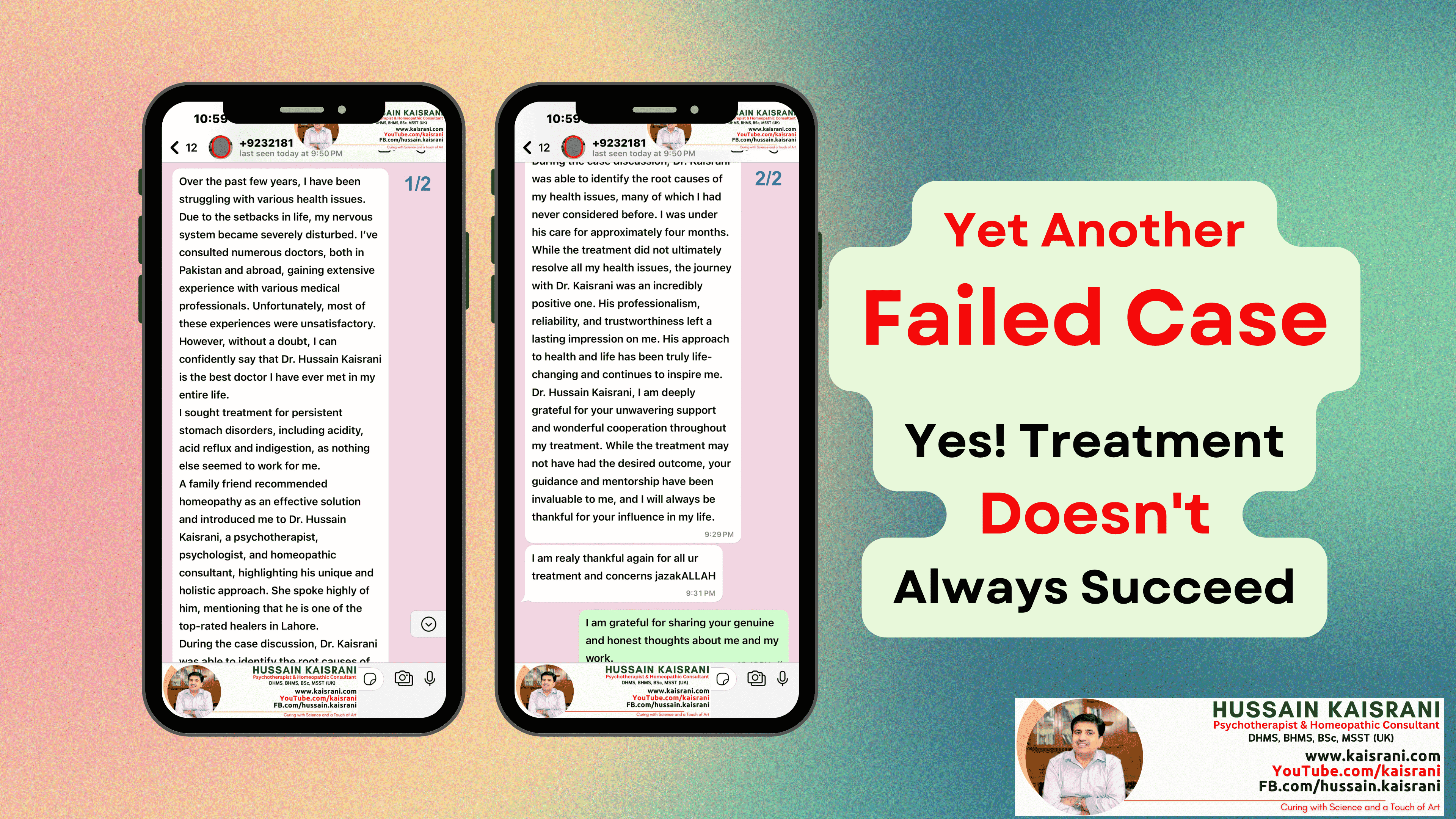 Dr. Hussain Kaisrani, I remain deeply grateful for your unwavering support, kindness, and cooperation throughout my treatment. While the outcome was not as expected, your guidance and mentorship have been invaluable and I will always appreciate the positive influence you’ve had on my life.